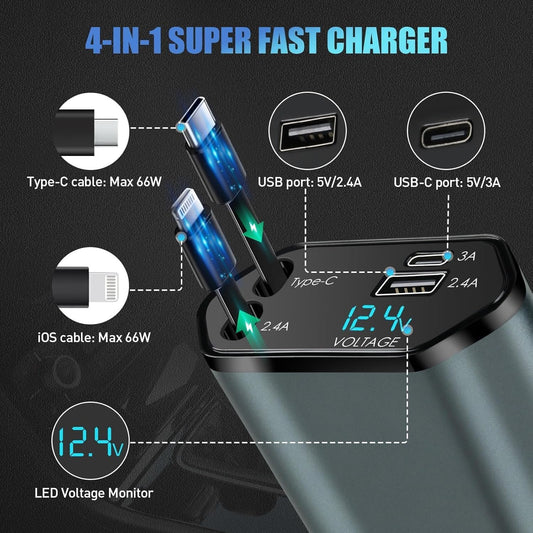 66W 4 in 1 Retractable Car Charger 12/24 V Adapter with Cables 60 cm for iPhone USB C, Cigarette Lighter Fast Charging for iPhone, Galaxy, Pixel, Huawei