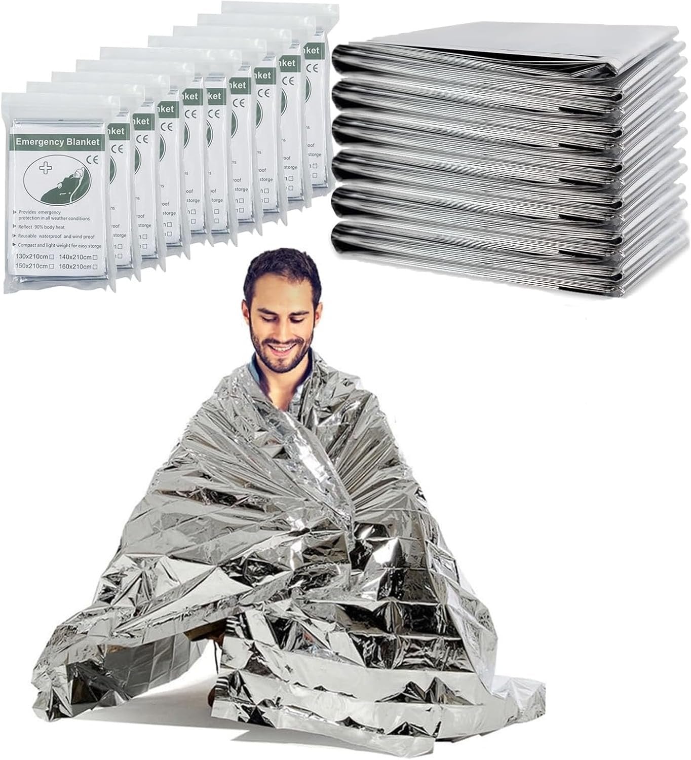 Emergency blanket - Package includes 10 pack of thermal survival blankets, the size is 130x210 cm/51.18x82.68 inch. It is easy very light weight and easy to carry and store in your car, back pack or together with your emergency kit. Manufactured from the best Weatherproof Material - This emergency thermal blanket pack comes with military-grade quality dual-sided mylar aluminized polyethylene reflective material. Which are reusable, waterproof, windproof and moisture-proof, can be used as ground cover, sun shade or ultra-light blankets. Superior Insulation & Emergency Shelter - Mylar insert provides insulation and the foil cover can reflect heat back to the body or deflect heat from the sun. Stay warm and protected in any outdoor or emergency situation. Reflective features can also send out a distress signal. Easy to Store and Use - Each emergency blankets for survival is individually folded, the size of the palm after a single fold, wrapped and sealed for easy storage and access. They are reusable, waterproof, windproof and can also be used to ground coverings and shading. Versatile Applications - uses are nearly limitless: use as tent footprint, backpack cover, rain poncho, emergency signal, solar oven, shade cover, fishing lure, bird repellent, emergency shelter, sleeping bag liner, ground cover, bivouac sack, wind blocker, arm sling, tourniquet, bivvy, trail marker, water collector, snow melt container and so on.