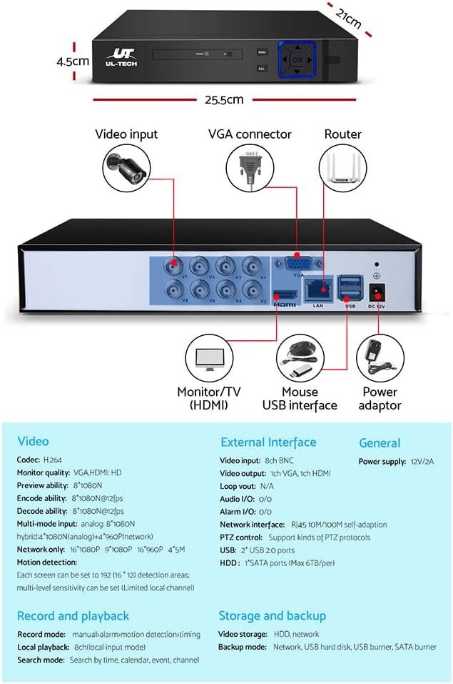 Specifications:Video:Codec: H.264Codec: H.264Monitor quality: VGA, HDMI:HDMonitor quality: VGA, HDMI:HDPreview ability: 8*1080NPreview ability: 8*1080NEncode ability: 8*1080N@12fpsEncode ability: 8*1080N@12fpsDecode ability: 8*1080N@12fpsDecode ability: 8*1080N@12fpsMulti-mode input: analog: 8*1080NMulti-mode input: analog: 8*1080NHybrid: 4*1080N (analog) + 4*960P (network)Hybrid: 4*1080N (analog) + 4*960P (network)Network only: 16*1080P; 16*960P; 9*1080PNetwork only: 16*1080P; 16*960P; 9*1080PRecord and playback:Record mode: Manual > Alarm > Motion detection > TimingRecord mode: Manual > Alarm > Motion detection > TimingLocal playback: 8ch (local input mode)Local playback: 8ch (local input mode)Seatrch mode: Search by time, calender, event, channelSeatrch mode: Search by time, calender, event, channelExternal inferface:Video input: 8ch BNCVideo input: 8ch BNCVideo output: 1ch VHA, 1ch HDMIVideo output: 1ch VHA, 1ch HDMILoop vout: N/ALoop vout: N/AAudio I/O: 0/0Audio I/O: 0/0Alarm I/O: 0/0Alarm I/O: 0/0Network interface: RJ45 10M/100M self-adaptationNetwork interface: RJ45 10M/100M self-adaptationPTZ control: 1*RS485, support kinds of PTZ protocolsPTZ control: 1*RS485, support kinds of PTZ protocolsUSB: 2* USB 2.0 portsUSB: 2* USB 2.0 portsHDD: 1*SATA ports (Max 6TB/per)HDD: 1*SATA ports (Max 6TB/per)Storage and backupStorage and backupVideo storage: HDD, networkVideo storage: HDD, networkCamera:Image sensor: 1/2.8inch V20 +SC1135 sensor (V20+FH8532)Image sensor: 1/2.8inch V20 +SC1135 sensor (V20+FH8532)Video resolution: 1080P (1920*1080)Video resolution: 1080P (1920*1080)Signal system? PAL/NTSCSignal system? PAL/NTSCMinimum illumination: Olux (When IR is on)Minimum illumination: Olux (When IR is on)Video ouput: 1.0vp-p 75Video ouput: 1.0vp-p 75Lens: 3.6mmLens: 3.6mmNumber of infrared LEDS: 24Number of infrared LEDS: 24Day and night function: Built-in IR-CUTDay and night function: Built-in IR-CUTNight vision distance: Up to 66ft/ 20mNight vision distance: Up to 66ft/ 20mNoise-signal ratio: ?41dbNoise-signal ratio: ?41dbOperating power: DC12V?10%Operating power: DC12V?10%Consumption: <5WConsumption: <5WProduct Contents:AHD Camera x 4AHD Camera x 41080 8CH DVR x 11080 8CH DVR x 118.3m (60ft) 2-in-1 BNC & Power Cable x 418.3m (60ft) 2-in-1 BNC & Power Cable x 41-4 Splitter Cable x 11-4 Splitter Cable x 112V/ 2A Power x 212V/ 2A Power x 2USB Mouse x 1USB Mouse x 1User Manual x 1User Manual x 1