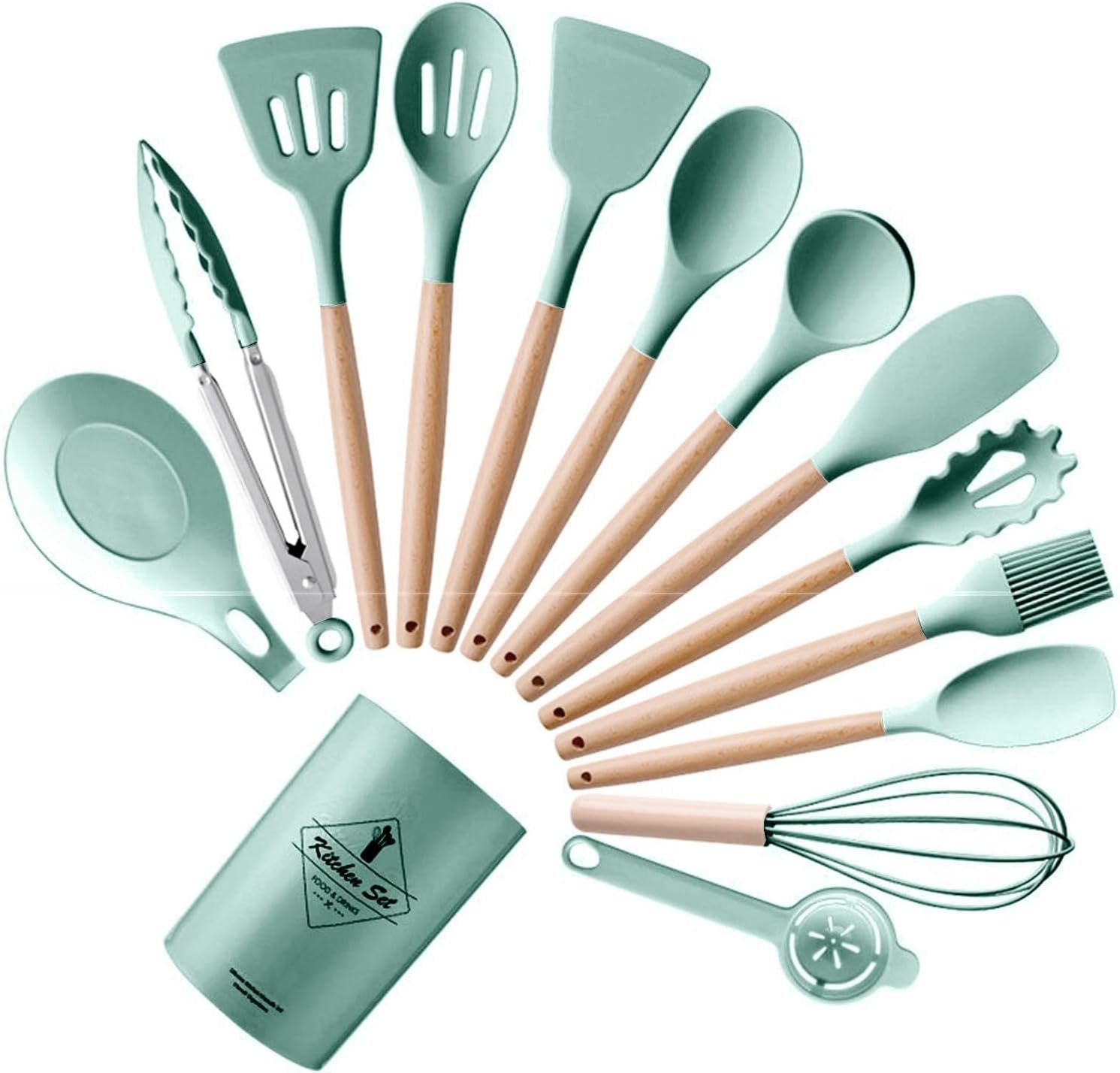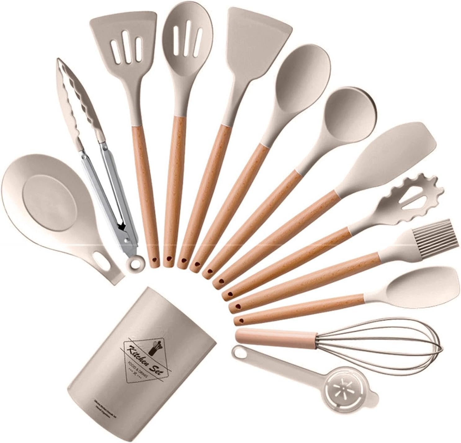 14 Pieces Kitchen Utensils Silicone Food Grade Cooking Tools Non-Stick Wooden Handles Kitchen Tongs Spoon Spatula Tool Wooden Handles Gadget