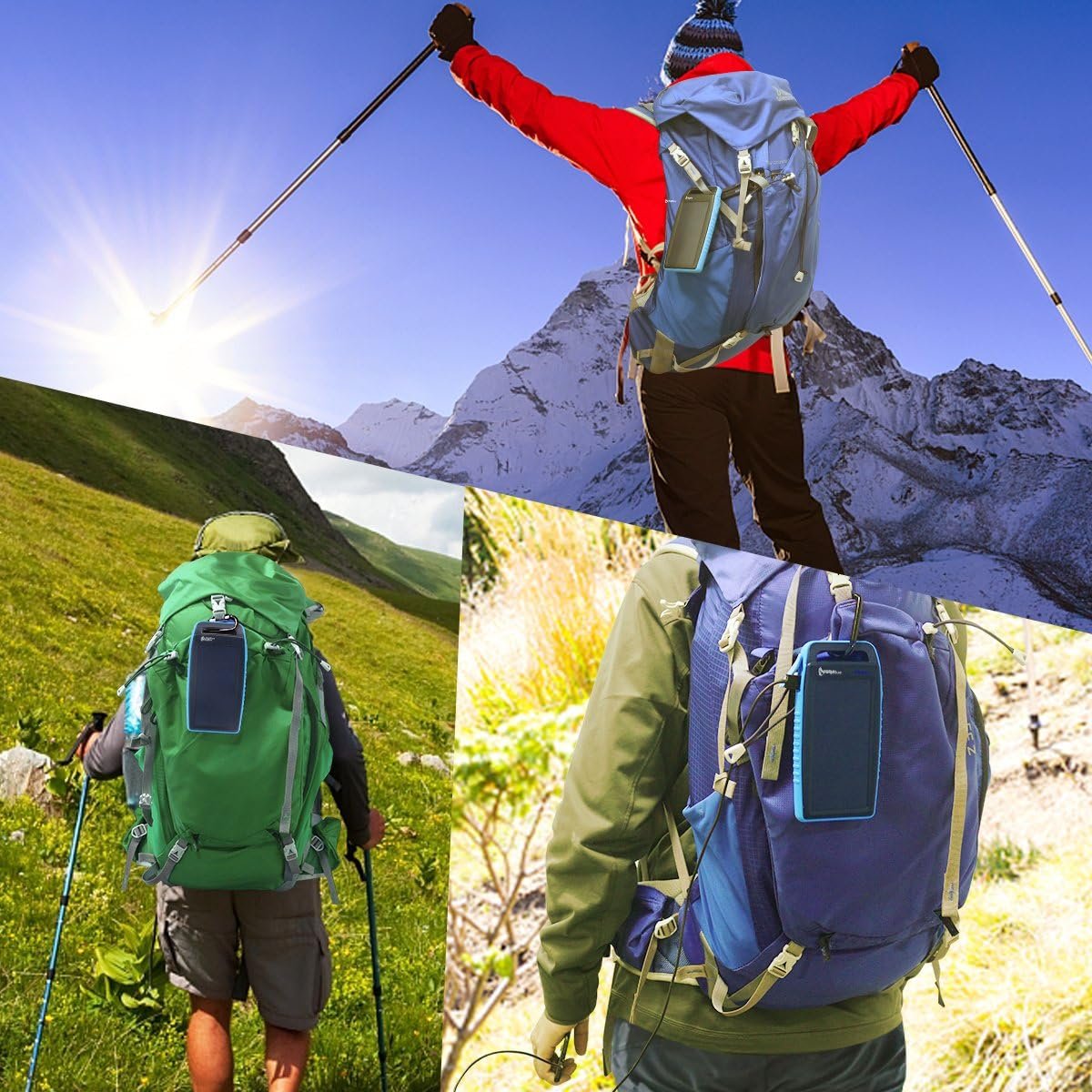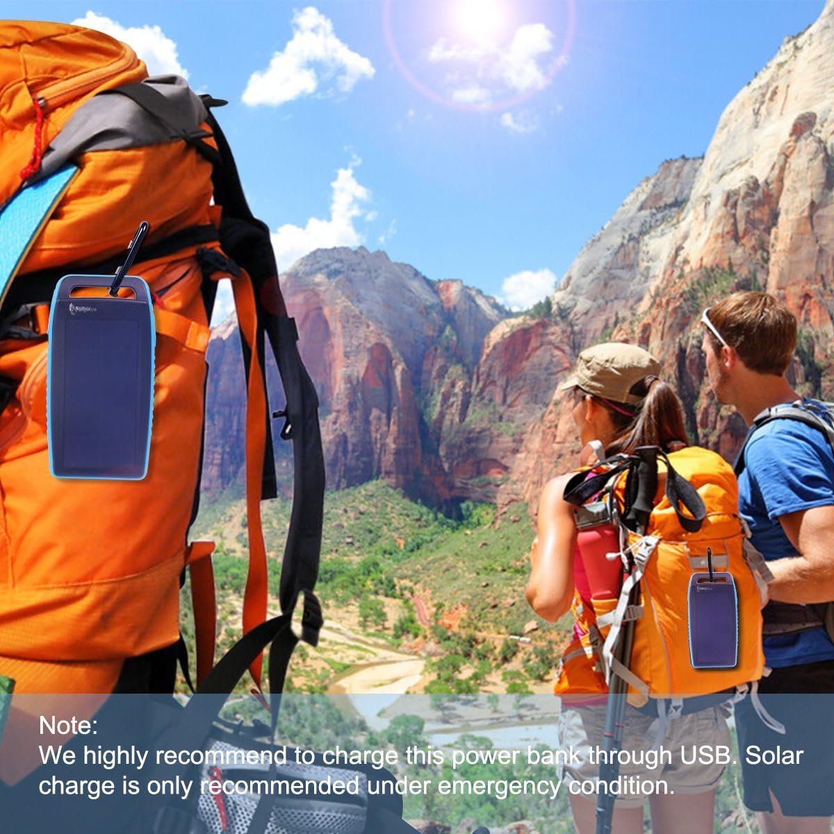 Large 15000mAh Capacity: this solar battery charger equipped with SunPower solar panel could recharge by solar or outlet. But solar charge is not recommended as primary recharge source as it's subject to sunlight intensity and solar conversion rate, which may take a long time to charge fully. Dual USB-A Port: This solar power bank with two iSmart powered 2.1A ports which can simultaneously charge two devices multiple times. 4.8 charges to iPhone 7; 5 times to iPhone 8; 3.5 times to Galaxy S8. LED Flashlight: The LED flashlight works perfectly in the darkness, especially for emergency or outage in hurricane season. Just long press the power button for 2 seconds to turn on/off the LED light. Superior Portability Design: Easily hang this solar charger on your backpack with the included hook, hands-free on the go. The IPX4 waterproof and dustproof features make it ideal for outdoor use like hiking, traveling and camping. What You Get: 1* 15000mAh solar battery charger, 1* Micro USB charging cable (not for iPhone), carabiner, user manual and our friendly customer service support.