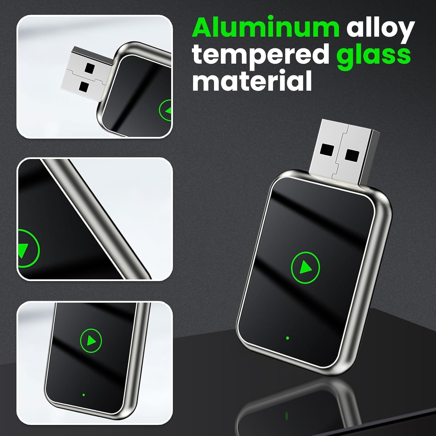 2-IN-1 WIRELESS ADAPTER FOR CARPLAY AND ANDROID AUTO: Easily convert wired carplay to wireless with the wireless CarPlay adapter! You can continue to use all the functions of Carplay and maintain the operation of your car, such as navigation, music playback, Siri assistant, calls and more. Equipped with a USB to Type-C connector, you can access both USB and Type-C ports on your car! EASY TO USE: Plug and play wireless carplay design for all drivers. No additional drivers, apps or annoying system updates are required. Step 1: Connect the box to the interface, the name of the bluetooth will appear; Step 2: Turn on the phone bluetooth and WIFI (just turn it on, do not connect to WIFI manually); Step 3: Bluetooth pairing and successful connection. UNIVERSAL 2-IN-1 COMPATIBILITY: This wireless Carplay/Android Auto adapter supports more than 98% of car models, including all major popular car brands and car models. Only support stock cars with wired Carplay or Android Auto wired. Supports iOS 10 or later or Android 11 or later devices. The adapter maintains the original car functions, such as navigation, music playback and calls. Note: Video playback, including YouTube, Prime Video, etc. is not supported. SMART VOICE CONTROL: The wireless CarPlay adapter is equipped with intelligent voice control, which allows you to use the CarPlay system and Android Auto via voice commands. With simple voice commands, you can control calls, navigation, music playback and other functions, making driving easier and safer. COMPACT & PORTABLE: Carplay mini USB adapter is designed to be compact, so it won't take up much space in your car and keep your cockpit clean and tidy.The Carplay adapter is made of high quality aluminum alloy and tempered glass. It not only looks stylish and beautiful, but also has good heat dissipation to ensure that the device works stably for a long time.