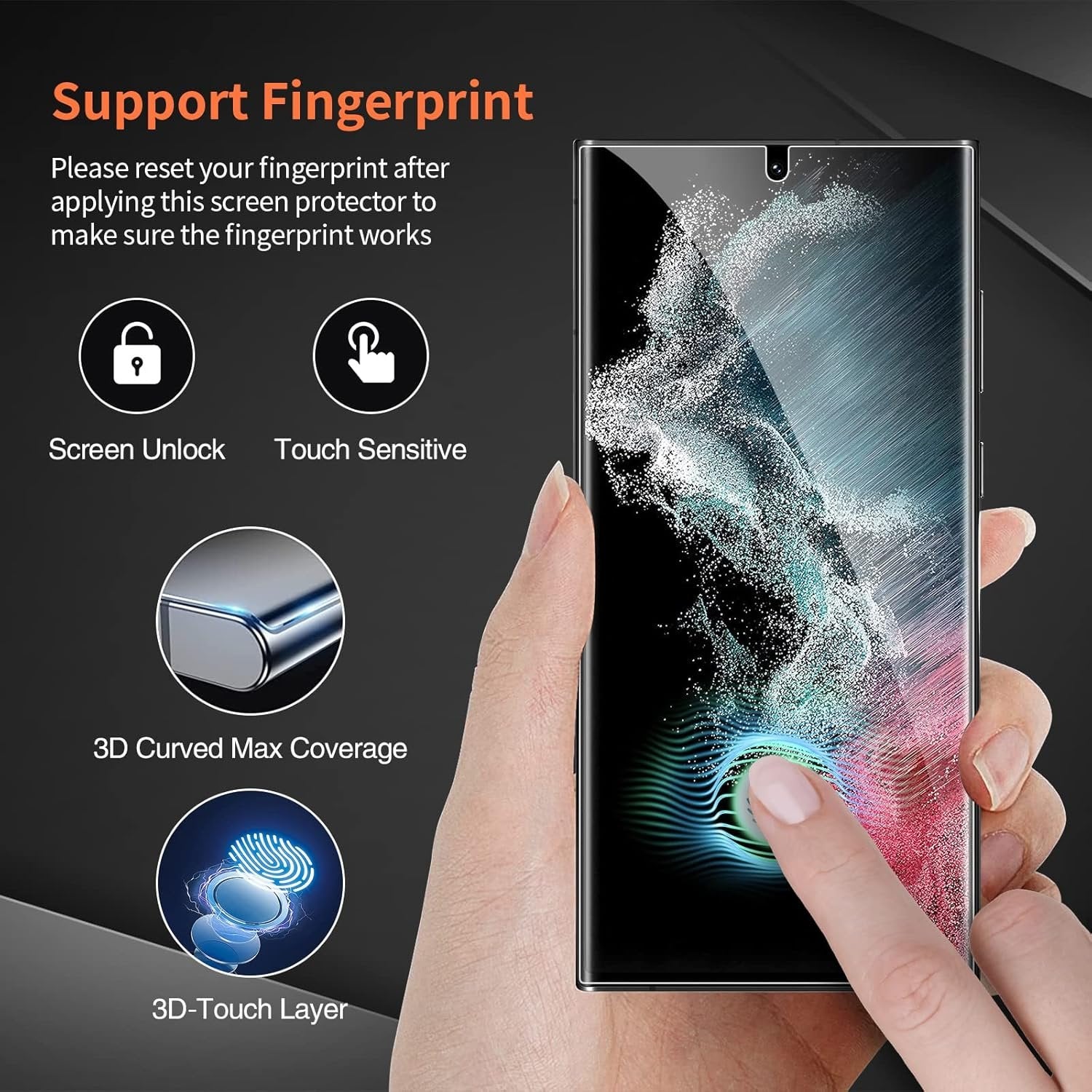 【Compatible Model】 The privacy screen protector are compatible with Samsung Galaxy S22 Ultra 6.8". Watch the installation video in the product photos before installing the screen protector. Provides position tools, without worrying about aligning the screen. If there are small scratches and bubbles after installation, don't worry, it will recover automatically within 24 hours because of the use of a High-permeability glue with strong adhesion. 【Support Fingerprint Recognition】The ultra-thin film does not interfere with touch response and in-screen fingerprint recognition. Advanced nano-glue and full adhesive coverage give it excellent touch sensitivity and interact with the ultrasonic sensor to enable the in-display fingerprint sensor feature. Please register your fingerprint after attaching the screen protector. 【Anti-Spy Privacy Protection】 Anti-peeping privacy screen protectors adopt new technology, which can make the information just for mobiles users who can enjoy the good visual effects keeping your personal, private, and sensitive information safe from strangers. This gives you more freedom to use your phone on buses, elevators, subways, or other public places. 【Flexible Materials & Full coverage】 The screen protector is not tempered glass, it is made of premium thermoplastic polyurethane (TPU), a flexible material that can covers the curved edges of the Galaxy S22 Ultra, provide maximum protection against scratches. With nano-elastic to prevent screen breakage caused by drops. 【Best After-sale Service】 QUESPLE specializes in the design and production of screen protectors. If you have any problem with the screen protector for Samsung Galaxy S22 Ultra, please contact us, we will reply and solve your problem within 24 hours, including a free refund or replacement.