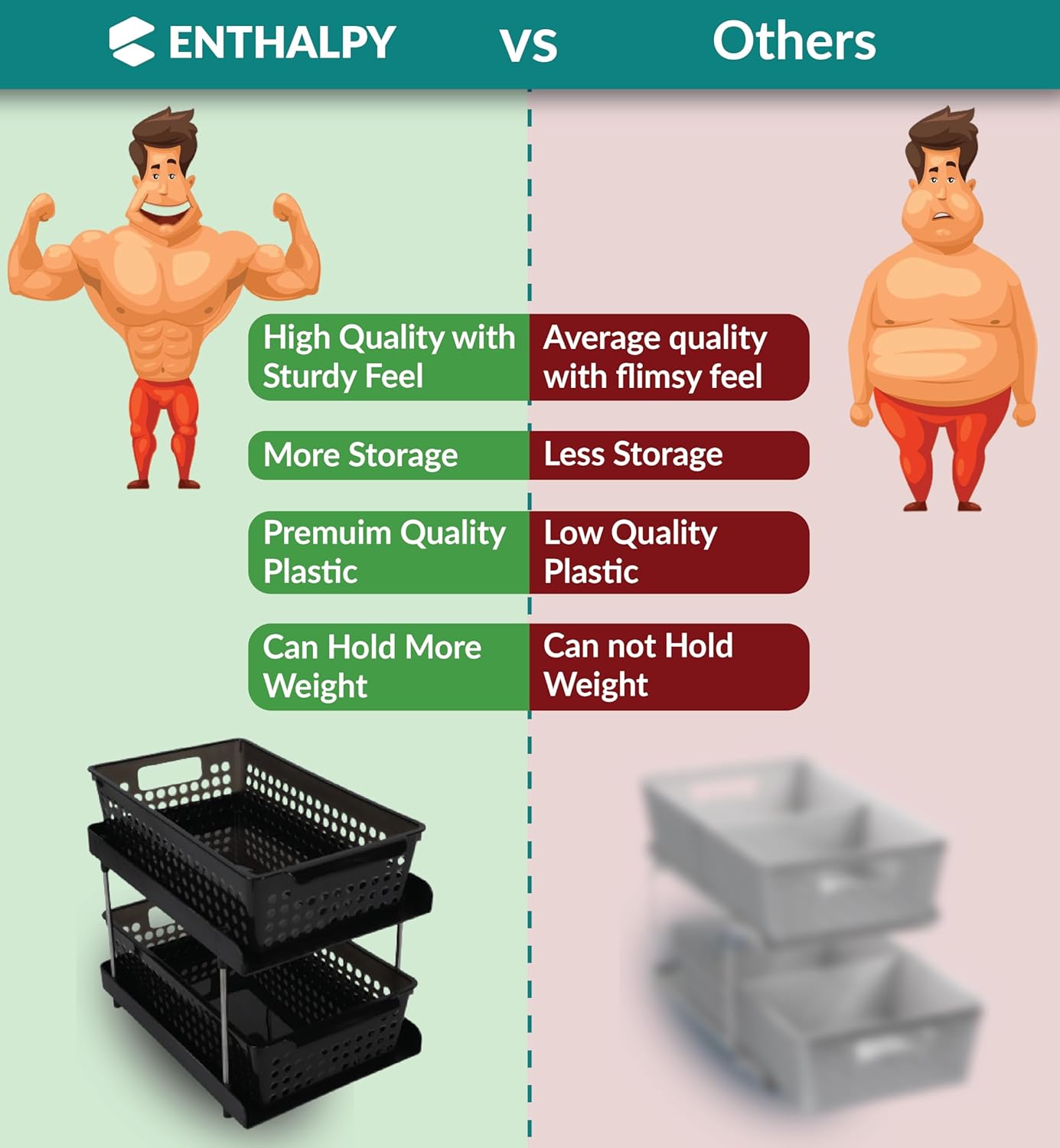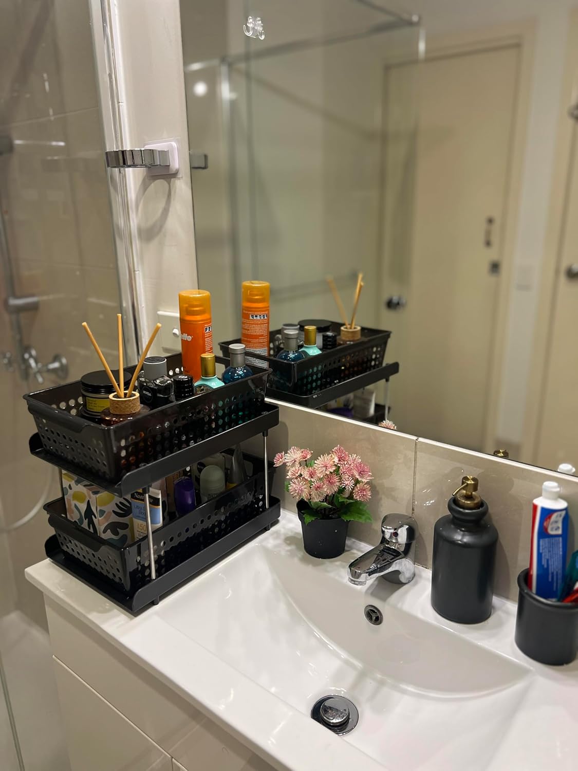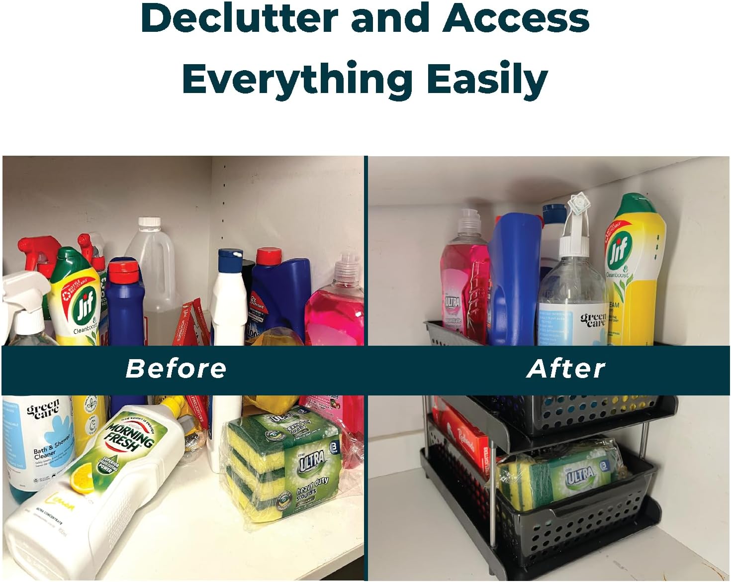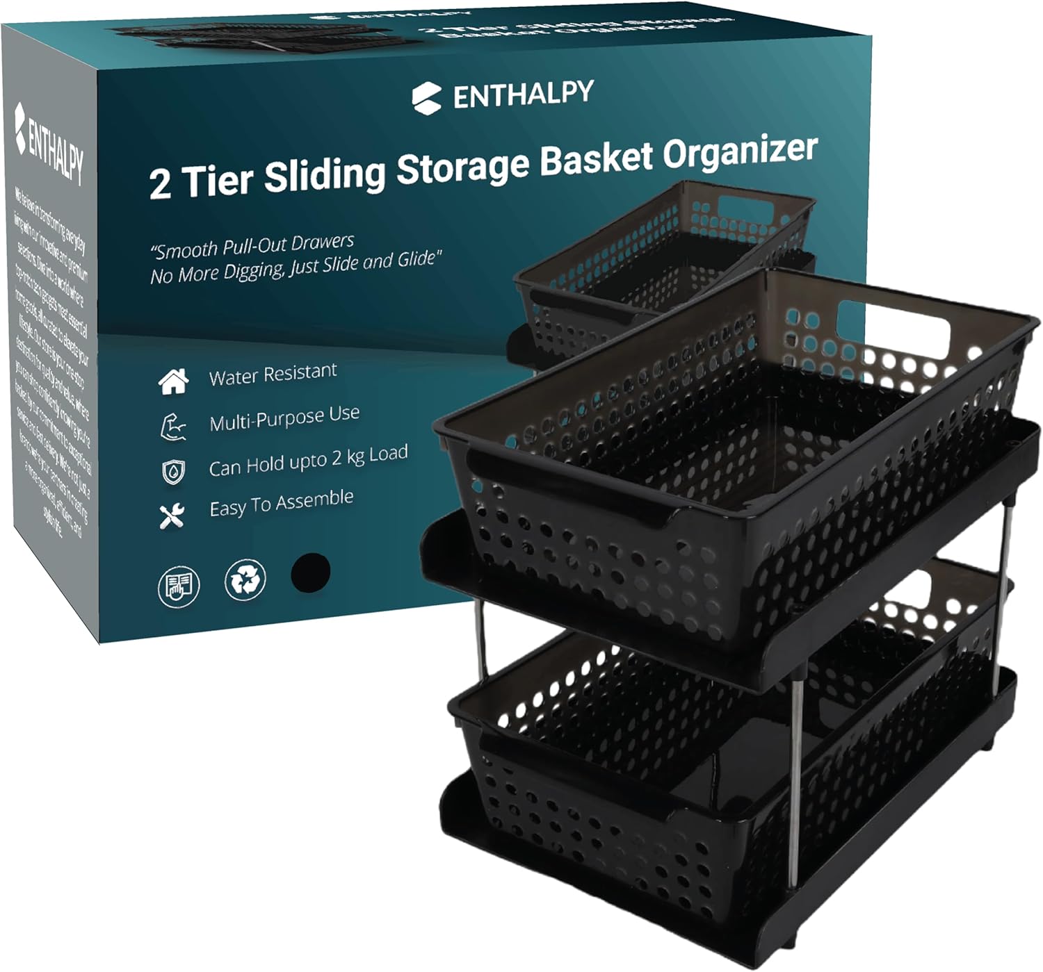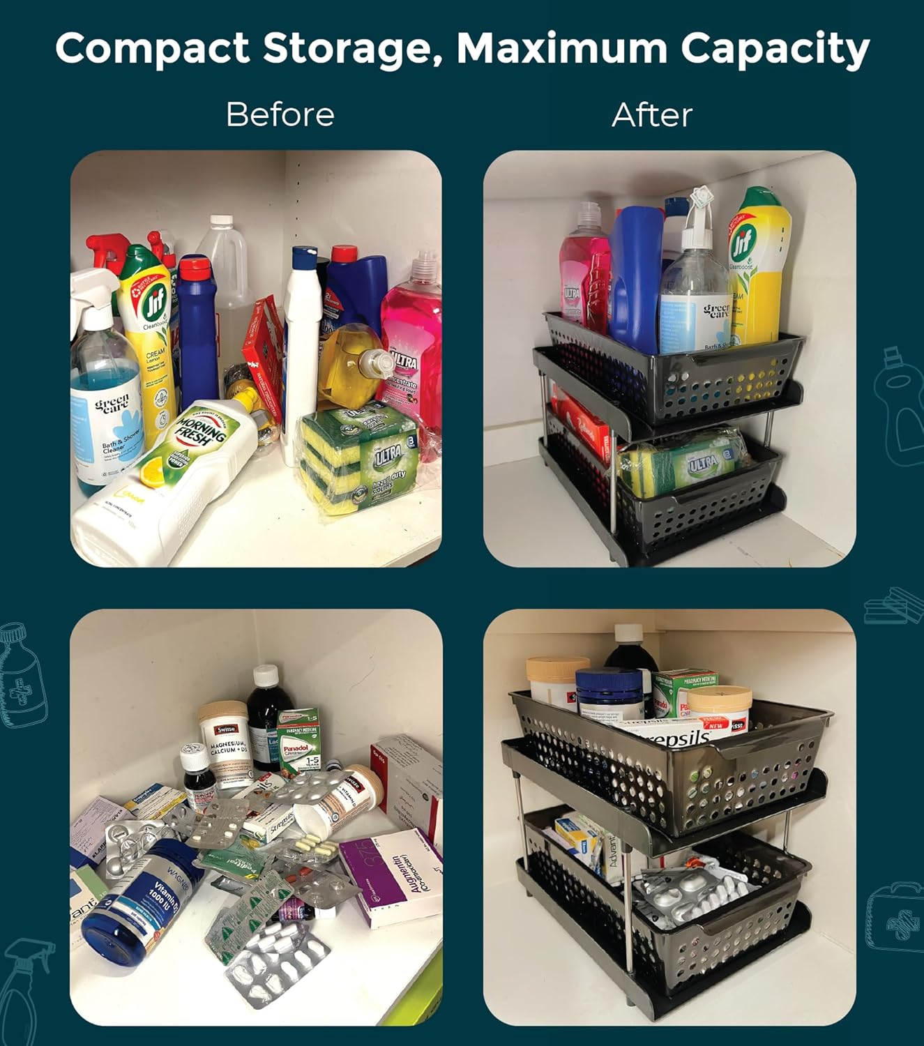 Transform Your Space Instantly: Say goodbye to clutter and hello to organization with our 2-tier bathroom organizer. The innovative pull-out sliding drawers provide easy access and ample storage, making your space more functional and stylish in no time. Ultimate Home Organization Solution: Keep every corner of your home tidy with our versatile storage basket. Whether it's bathroom storage, kitchen, pantry, or cutlery organisation, our dual-tier design with pullout trays ensures your items are always neatly arranged and within reach. onvenience at Your Fingertips: No more digging through chaotic cabinets. Our shelf organiser features smooth sliding pullout trays, giving you effortless access to your essentials. Find what you need instantly and keep everything in its place with ease. Stylish and Built to Last: Enjoy a clutter-free and visually appealing home with our durable storage organiser. Crafted from premium materials, it combines strength and elegance, providing a long-lasting solution that enhances any room's decor. Effortless Setup and Endless Uses: Get organized in minutes with our easy-to-install storage solution. Perfect for under-sink storage, pantry organisation, and more, this organiser fits seamlessly into any space. Save time, reduce stress, and enjoy a well-organized home effortlessly.