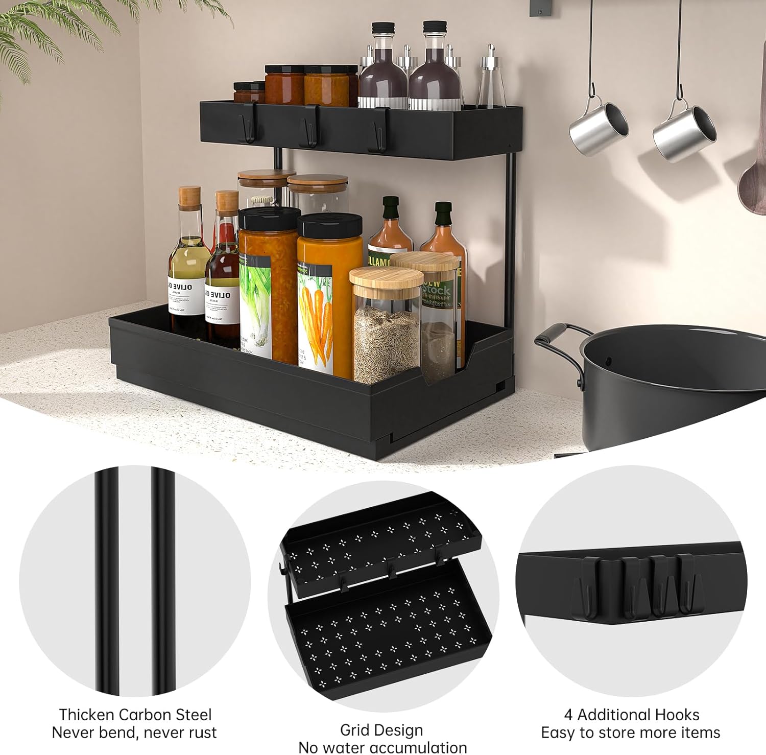 2-Tier Under Sink Organizers, 2 Pack Sliding L-shape Cabinet Organizers Narrow Space Storage Shelves Multi-purpose Sink Organizer Baskets with 4 Hook for Kitchen Bathroom Drawer, Black