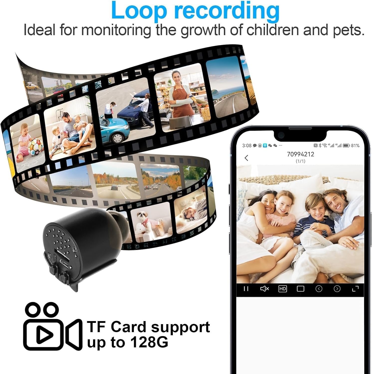 ✔ï¸ã€Never Stop Recording】— QH5 camera also supports loop recording without the problem of memory hogging. When the memory card is full, the latest files will overwrite the oldest ones. You will never miss the important things you want to know. You can use it to record the growth of your pets and children.