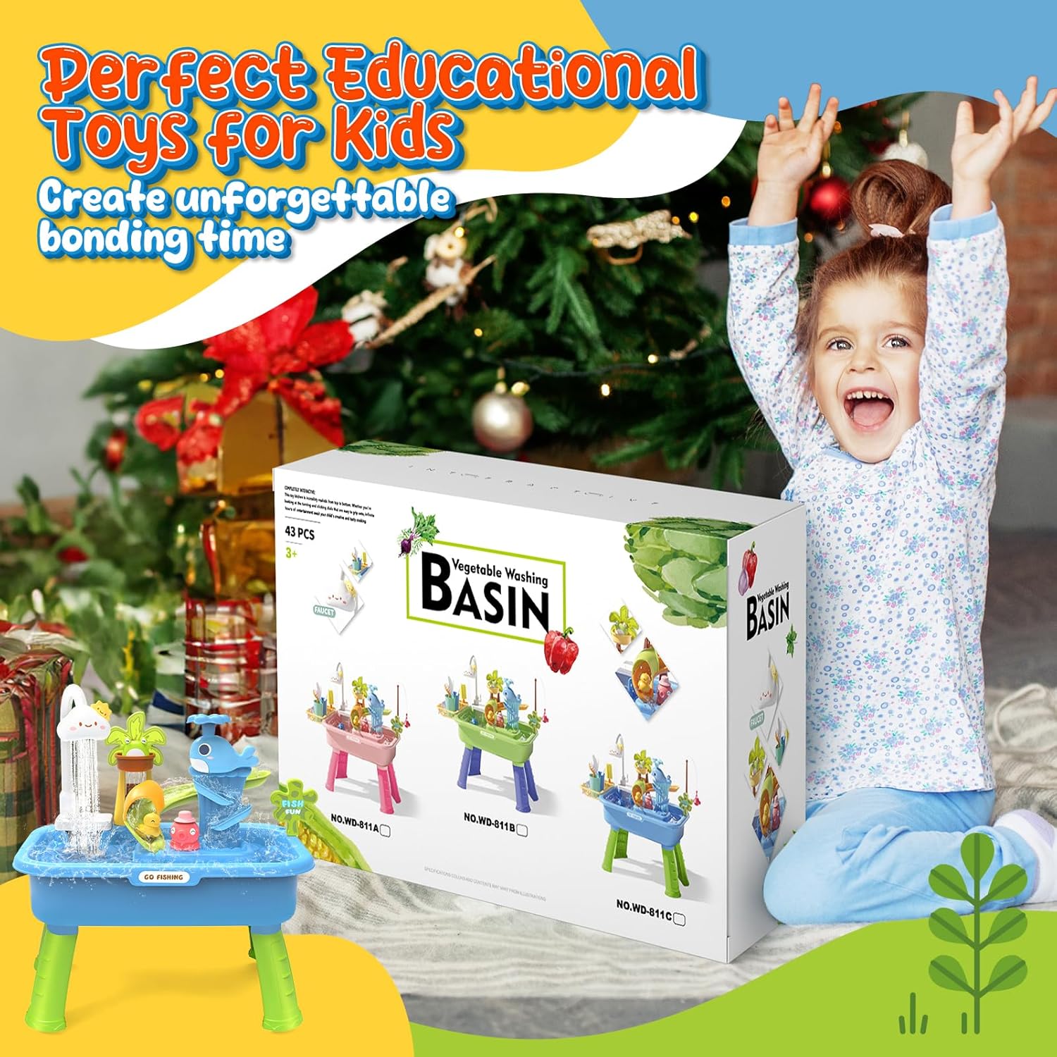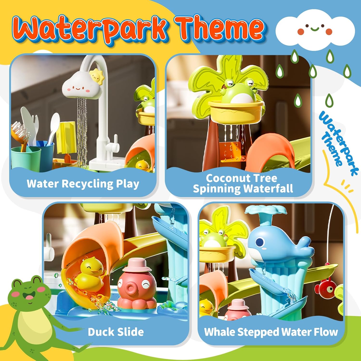 Upgrade playtime with our 4-in-1 multi-functional sink toy! Now with detachable legs, it's perfect for both standing and tabletop fun. This versatile set combines kitchen play, water park excitement, fishing fun, and a working sink all in one. With an expanded 3L water capacity and raised height, it’s designed for a comfortable, immersive experience for kids of all ages. Welcome to the Mini Water World! Watch the animals have a blast at the water park! The duck rides waves, the whale sends water down steps, and the frog enjoys a cozy bath, and the coconut tree waterfall adds a beautiful touch to the scenery. Don’t miss the thrilling fishing game, where kids can test their hand-eye coordination and compete to see who can catch the most fish. Nonstop water park fun awaits! Realistic Water Flow Design: Experience the enchantment of our innovative water circulation system, delivering a continuous stream of water just like a real faucet. The cloud-shaped faucet rotates a full 90°, allowing kids to wash from any angle without wasting water. This durable, sealed design ensures hours of mess-free fun while teaching kids about water conservation and household tasks. (Requires 4 AA batteries.) Little Helpers in Action: Let your kids mimic real kitchen tasks by washing vegetables, scrubbing plates, and rinsing utensils just like adults. The playset, complete with drying areas, allows little ones to practice organizing and tidying up their "dishes" after washing. Engaging in meaningful pretend role play helps children enhance their understanding of household responsibilities and boost their organizational skills. Safe and Perfect for Gifting: Crafted from high-quality, materials, this 4-IN-1 sink toy with detachable legs ensures safe and sustainable play. Its robust design promises years of enjoyment, making it a wonderful gift for birthdays, holidays, or any special occasionit, brings joy to pretend play lovers and helps children learn vital life skills. This sink toy is a wonderful addition to any child's collection.