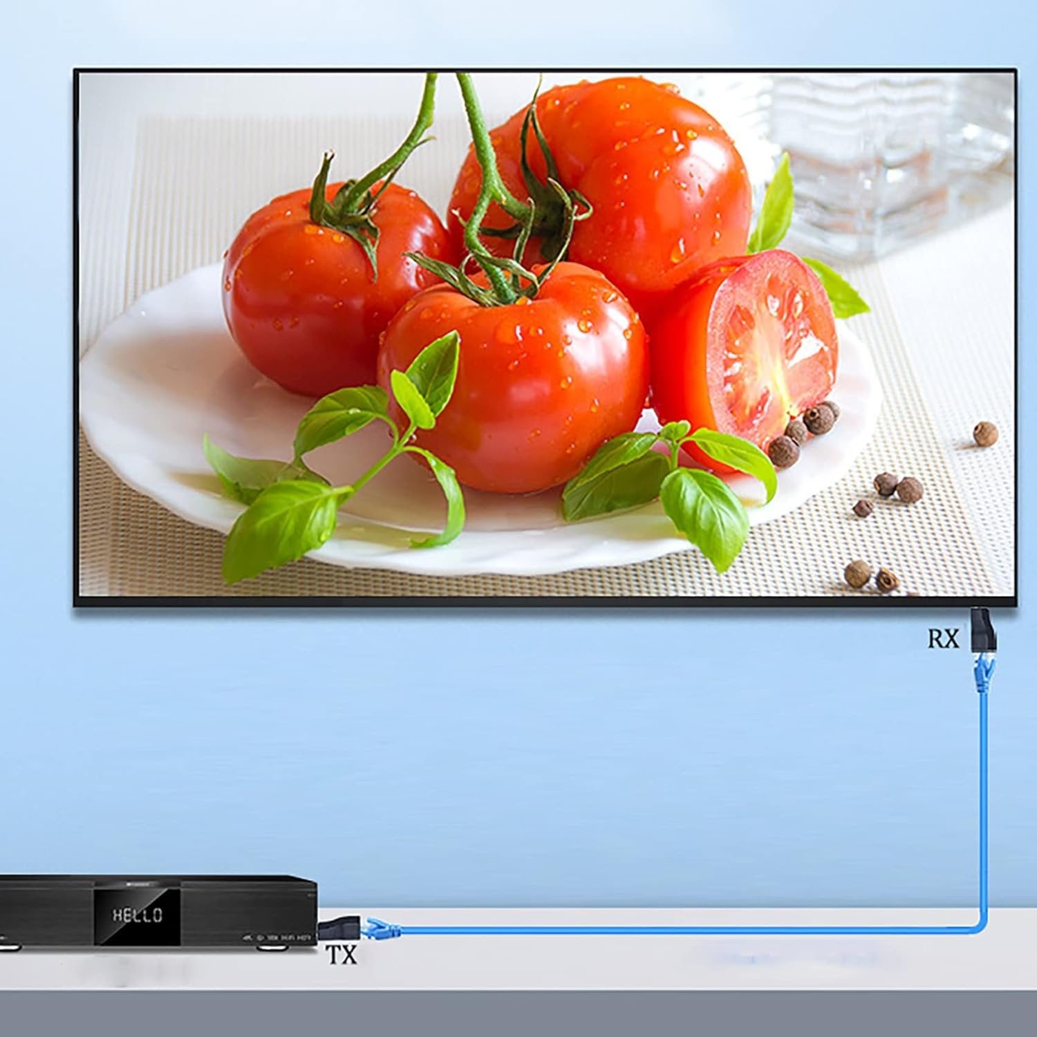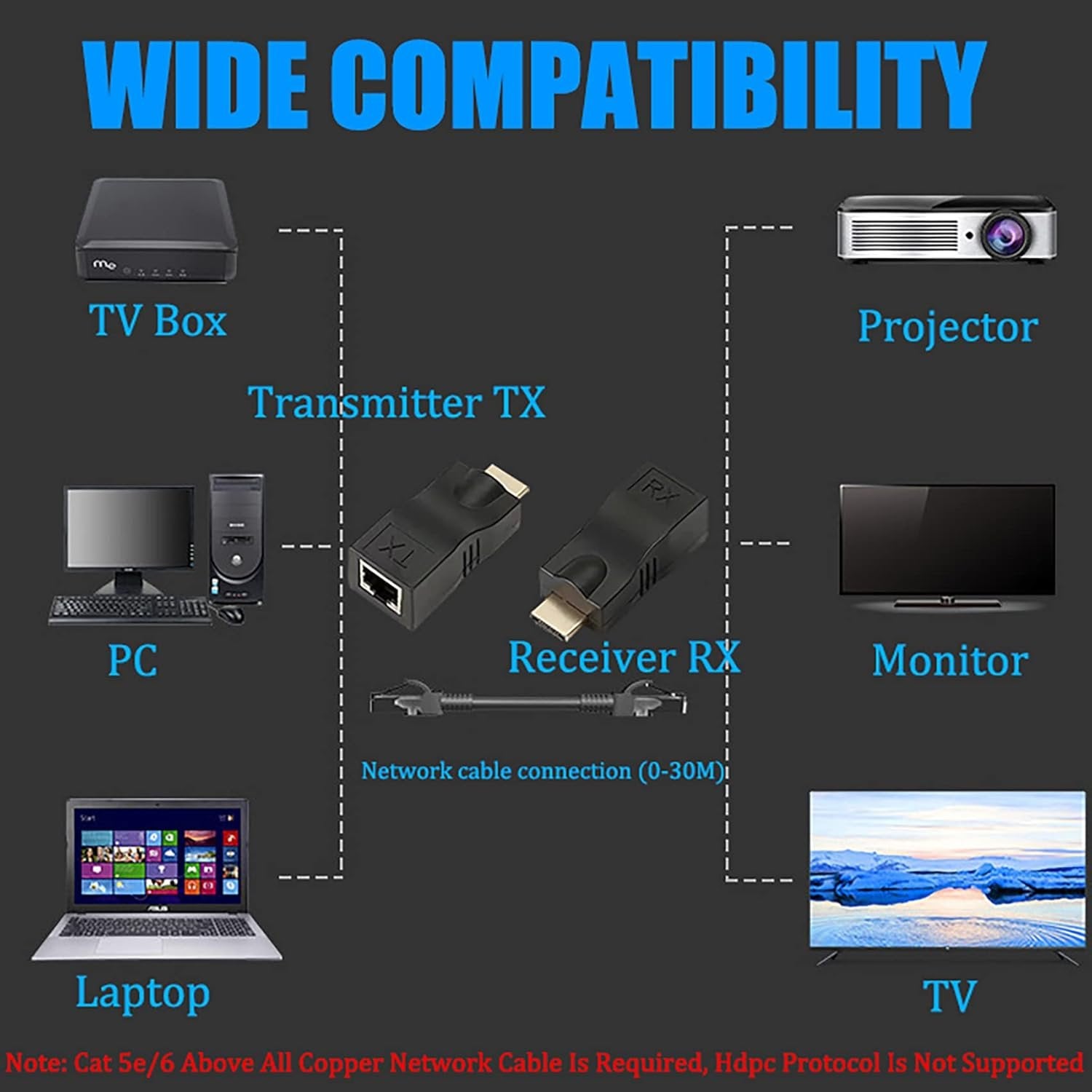 💗【Widely Used】HDMI Extender is HDMI to RJ45 Extender Adapter works for HDTV, Set-top Boxes, DVD, HDPC, PS4, STB, HOME&Hotel Projector Data Monitoring Center, Large Conference Center. 💗【HDMI Extender】The transmitter and receiver are used in pairs, without setting, without external power supply. This adapter not only breaks the limit of HDMI cable transmission length, but also provides greater flexibility and convenience in cable construction. 💗【HD 1080P】The HDMI ethernet extender with 2.5Gpbs signal transmission speed, technology speaking can reach to 4k. Perfect support 1080P, but this section DOES NOT support HDCP. Support hot swapping. Plug and play. 💗【High Efficient Transmission】The HDMI extender can extend HDMI video and audio signals simultaneously up to 30 meters/100ft by the CAT-5e/6 cables. High speed point to point output, ensures that the input and output is exactly same.(Please note: the use of poor quality cables will affect the extended distance!) 💗【What you get】: We provide this HDMI Extender Over Ethernet Adapter 2 Pack with an 18-Month worry-free period and 24/7 friendly client consultation, if you have any questions, we will resolve your issue within 24 hours