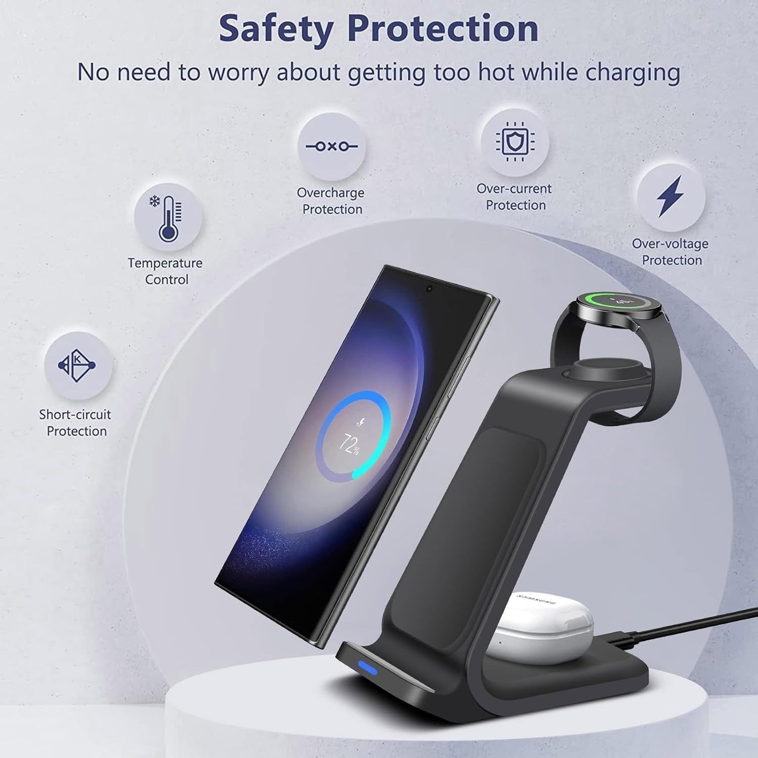 【New Upgrade 3 in 1 Wireless Charger】We have optimized the location of the mobile phone charger. When the mobile phone is placed on the charger, it will not block the camera, so that the mobile phone and the charger fit perfectly without gaps. 3 in 1 design, you can charge 3 devices at the same time, make your nightstand/desk more tidy. Dual coil design allows cell Phones charging vertically or horizontally. 【Universal Compatibility】FDGAO 3 in 1 wireless charger can charge up to 3 of your devices at full power output. Compatible with Samsung Galaxy S24/S23/S22/S21/S20/S10/S9/S8 Series,Note20/10+/10/9/8; Compatible with Galaxy Buds/Buds Live/Buds2/Buds2 Pro. Compatible with Galaxy Watch6/6 Classic/Galaxy Watch6 LTE; Galaxy Watch5/5 Pro;Galaxy Watch 4/4 Classic;Galaxy Watch 3/LTE, Galaxy Watch,Galaxy Watch Active 2 LTE/ Active 2. (NOTE: Does not support for Galaxy Watch Gear, Soprt,Fit, Live Series) 【Fast Wireless Charging】Intelligently adjust the charging speed, Provide 15W/10W/7.5W wireless charging for phones that support wireless charging; 5W charging for Galaxy Buds. 5W charging for Galaxy Watch. (Note: 1. Only Compatible with Galaxy Watch Series. 2. Must use 18W above adapter, NOT included power adapter.) 【Safe Charging】: The wireless charger station uses smart chips to protect your phone from overcharging, overcurrent, overvoltage, overheating and short circuit. It can effectively extend the battery life of your device and provide you with a safe charging experience. Our wireless charger can charge directly through silicone phone cases (≤5mm/0.2 inches), saving you the trouble of taking off the phone case. 【What You Get】: Perfect decoration of your desk and perfect gift for your families and friends! The package includes 3-in-1 Wireless Charger Stand *1 ,USB-A to USB-C Cable *1, User Manual *1. We offer 24 hour responsive and friendly customer service. Feel free to contact us if there is any problem. (Email:doshinau@163.com)