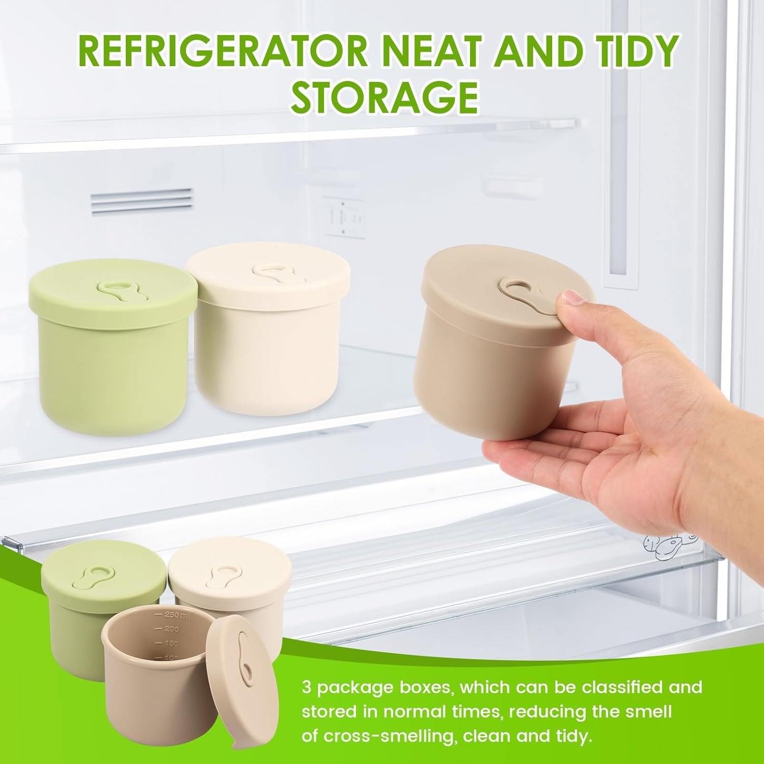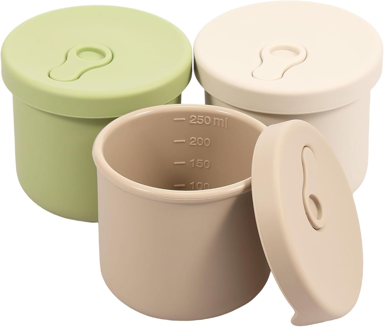 Brand-MFAUCAZB Material-Silicone Material feature-BPA Free, Dishwasher Safe, Microwave Safe, Freezer Safe Capacity-250 Millilitres Detailed description:Description:This box's ability to withstand both cold and heat allows for easy storage in the refrigerator and fast heating in the microwave. Whether you're preparing a meal at home and taking it to work or school, or simply reheating leftovers, this box provides a hassle free solution.Key Feature:--Easy to Clean: This box consists of silicone and easy to clean. You can wash it directly with water.--Light: Whether it is stored in the refrigerator or put in the backpack to carry out, it will not take up too much space.Specification:Product Name: Silicone Food Storage ContainersMaterial: SiliconeSize: Upper diameter 9 cm, lower diameter 7.5 cm, height 7.7 cmCapacity: 250 mlNote: 1. There may be slight color differences between the product picture and the actual item. We will do our best to display the color as accurately as possible. 2. Please allow slight dimensional discrepancies due to manual measurement.Parts List:3 x Silicone Food Storage Containers Excellent Texture:This box consists of nice silicone, which is resistant to dropping and breaking, and not easy to be damaged, Microwave and Refrigerator Friendly:With its cold and heat resistance, this box is suitable for both freezing in the refrigerator and direct heating in the microwave, providing good convenience for meal preparation and storage Vent Hole Design:The container lid is specially designed with vent holes. When heating food in the microwave, you can either open the lid or release steam through these small holes by opening the vent holes Sealed Lid:Equipped with a sealed lid that can close tightly, it effectively prevents liquid leakage and the entry of outside air, maintaining the freshness of the food inside Rich Package Contents:This set of boxes contains 3 pieces in total. They can be used for classified storage in daily life, reducing the mixing of flavors and keeping things clean and tidy