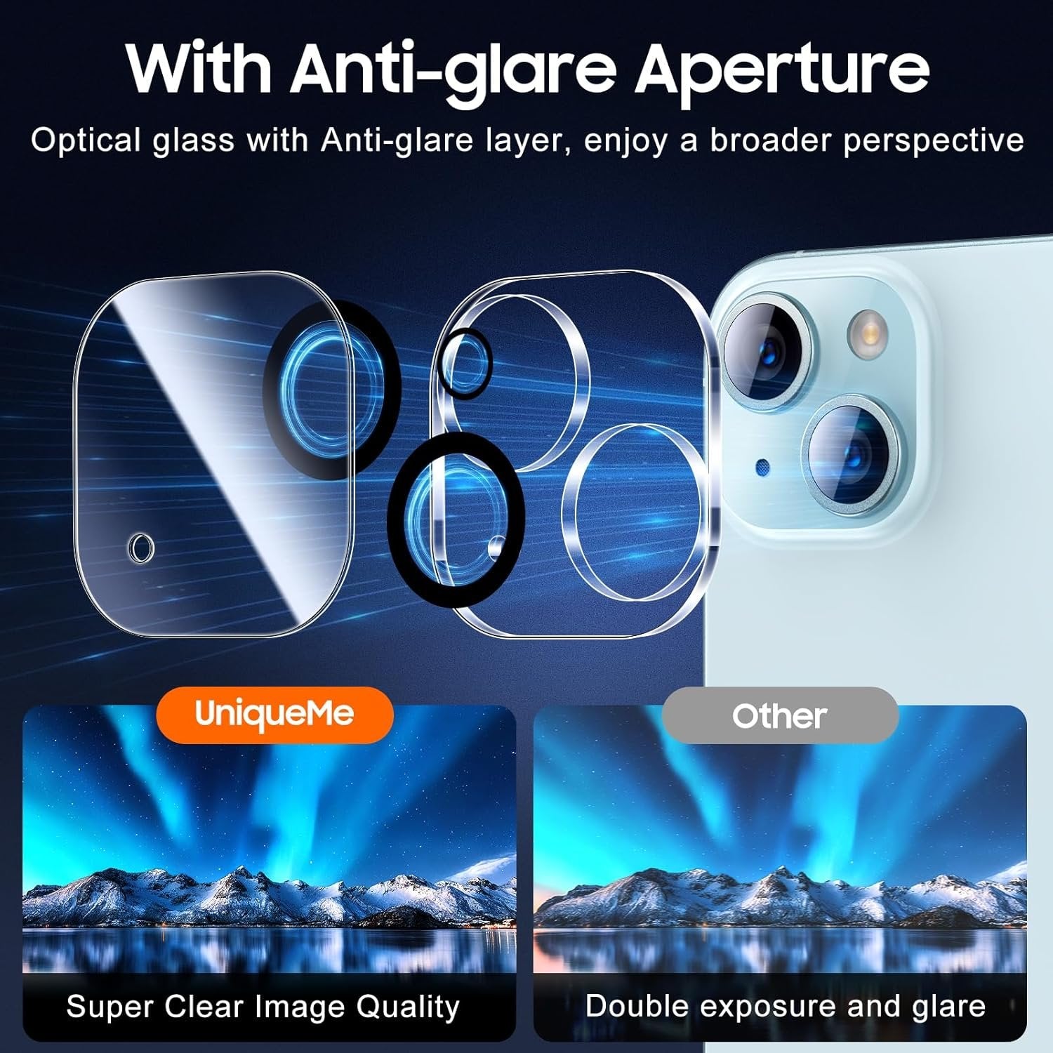【Compatible for iPhone 15 / iPhone 15 Plus】Included 3 Pack iPhone 15 / iPhone 15 Plus Camera Lens Protector, only for 15 / 15 Plus, Not for any other models. 【Powerful Adsorption】 Increased Nano Electrostatic Automatic Adsorption Technology makes the iPhone 15 / iPhone 15 Plus camera protector effectively adhered to the lens without any bubbles or white edges.not easy to fall off. 【Full Coverage Protection】 Precise laser cutting size provides maximum protection for the entire camera lens of your iPhone 15 / iPhone 15 Plus, 9H Glass camera protector effectively protect entire camera lens from drops, scratches and other accidents.Due to the open edge design, UniqueMe’s Camera Lens Protector will allow you to use almost various cases. 【Night Shooting Mode】iPhone 15 / iPhone 15 Plus Camera Lens Protector with an upgrade "Night Flash Circle", not affect the flash in the night shot environment. Lens film upgrade enhances the light transmission display, Whether it is day or night, gives you an ultra-clear viewing and photo taking experience. 【Welcome to Your Support】 Comes with an installation frame.No worrying about bubbles.Please watch our installation video before applying the screen protector.UniqueMe always by your side, Committed to providing a better shopping experience. Please contact us via Amazon message for any issues regarding this iPhone 15 / iPhone 15 Plus Camera Lens Protector, we'll be more than happy to assist you.