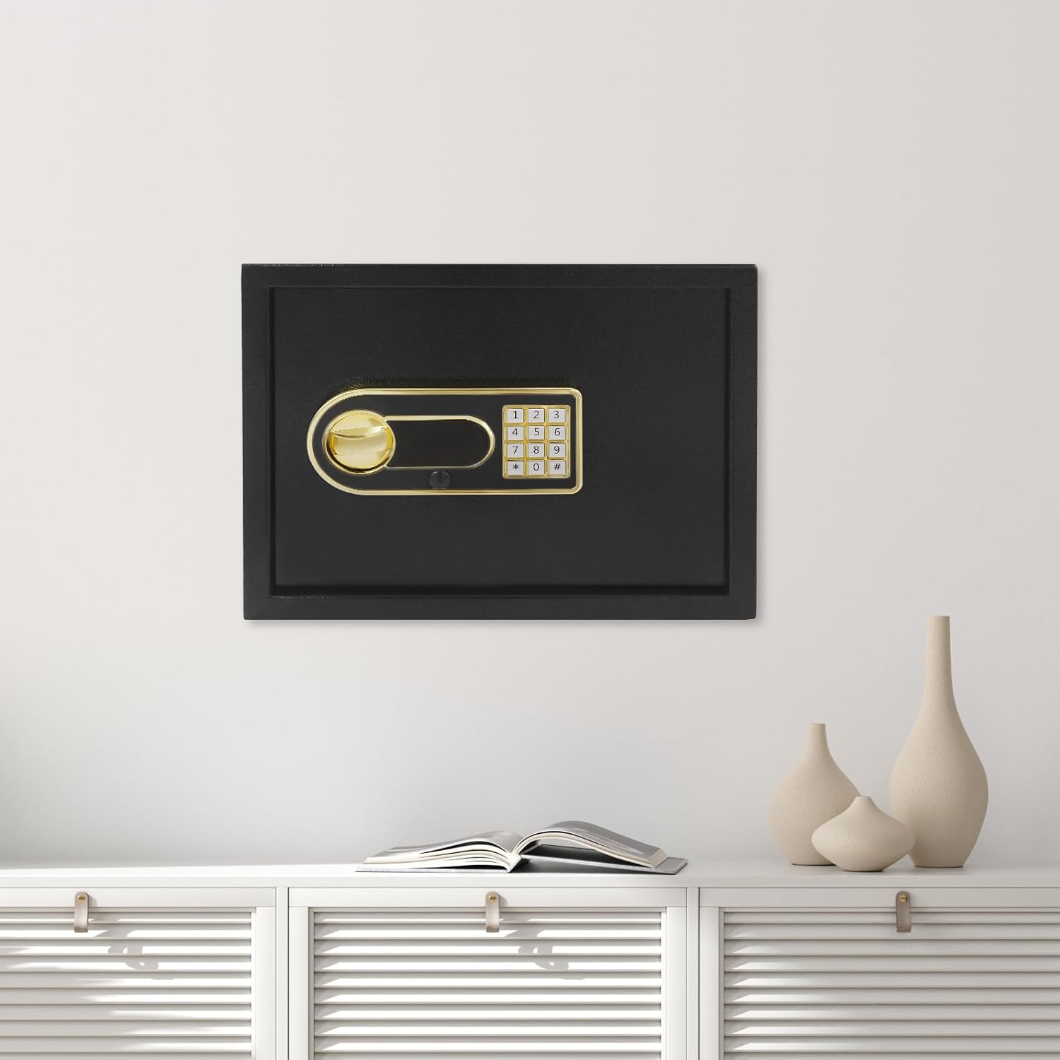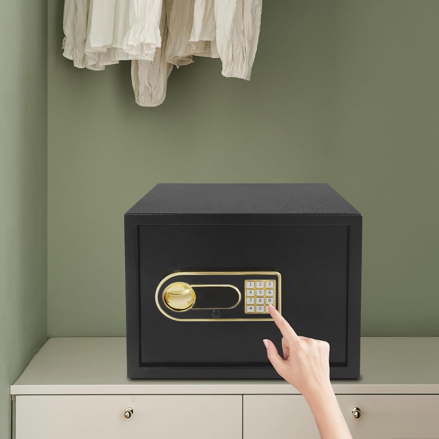 High Security & Intelligent Lighting: With three consecutive incorrect password inputs, the lock will automatically turn on for 20 seconds, accompanied by a buzzer alarm. After six false attempts, the lock extends to five minutes. This not only scares away unauthorized access, but also gives the owner enough time to respond.Flashes when entering the password, gives a visual confirmation of the input process and improves the user experience. 2 Access Approaches: The product has two opening methods. You can turn the knob after entering the correct password or enter the key, turn it fully counterclockwise, and then turn the knob. This provides alternatives in case of battery or password issues. Sufficient Capacity & External Power Box: With a capacity of about 6.6 gal, this product provides enough space to store various valuables such as jewelry, important documents and electronics and meet your multiple storage needs. It serves as a reliable backup power source, which ensures that even in the event of a main battery failure, the product can still be accessed and allows for regular battery replacement. Application: This safe is suitable for bedroom, study, warehouse, jewelry, banks, hotels, etc.It is suitable for homeowners, office workers, entrepreneurs, collectors, etc.