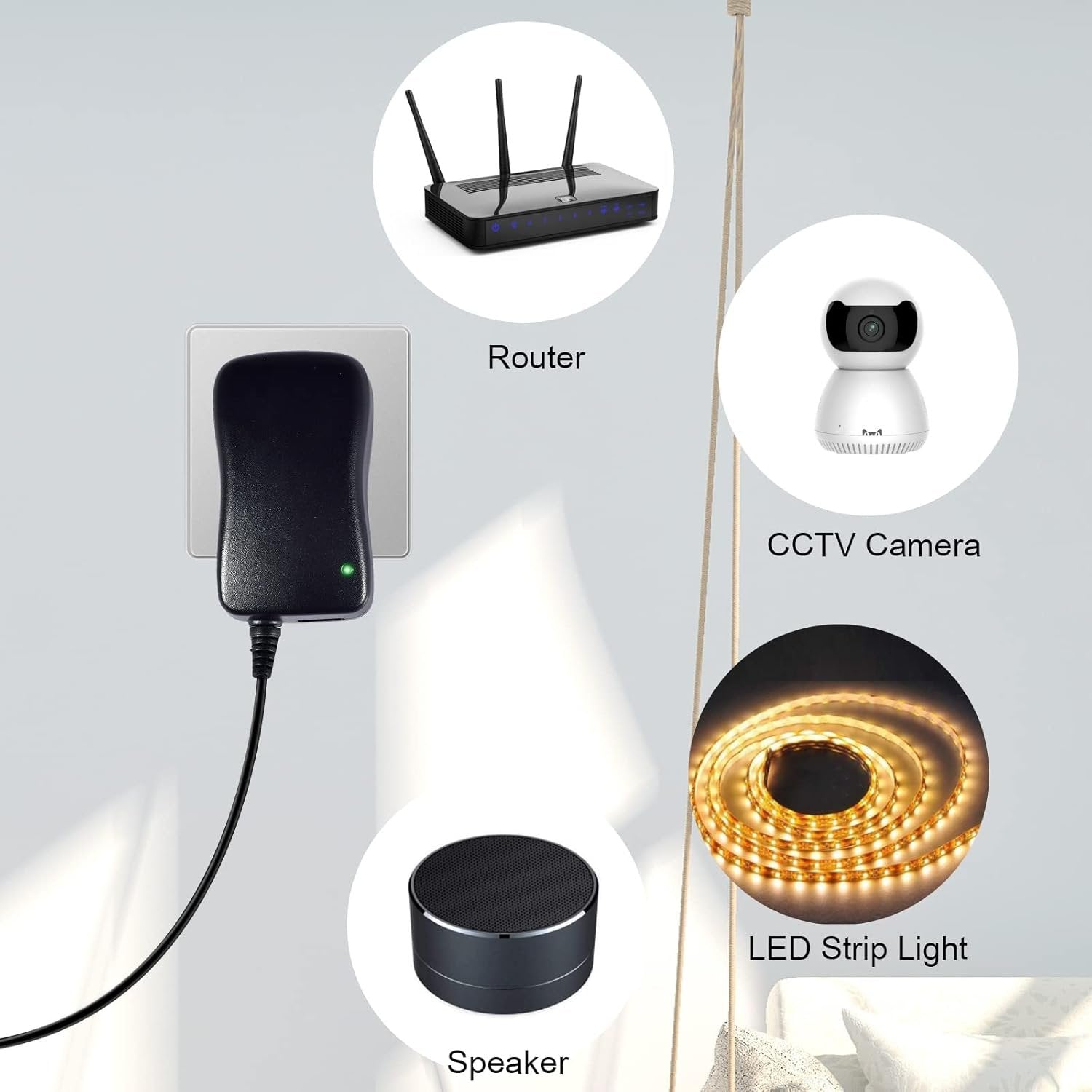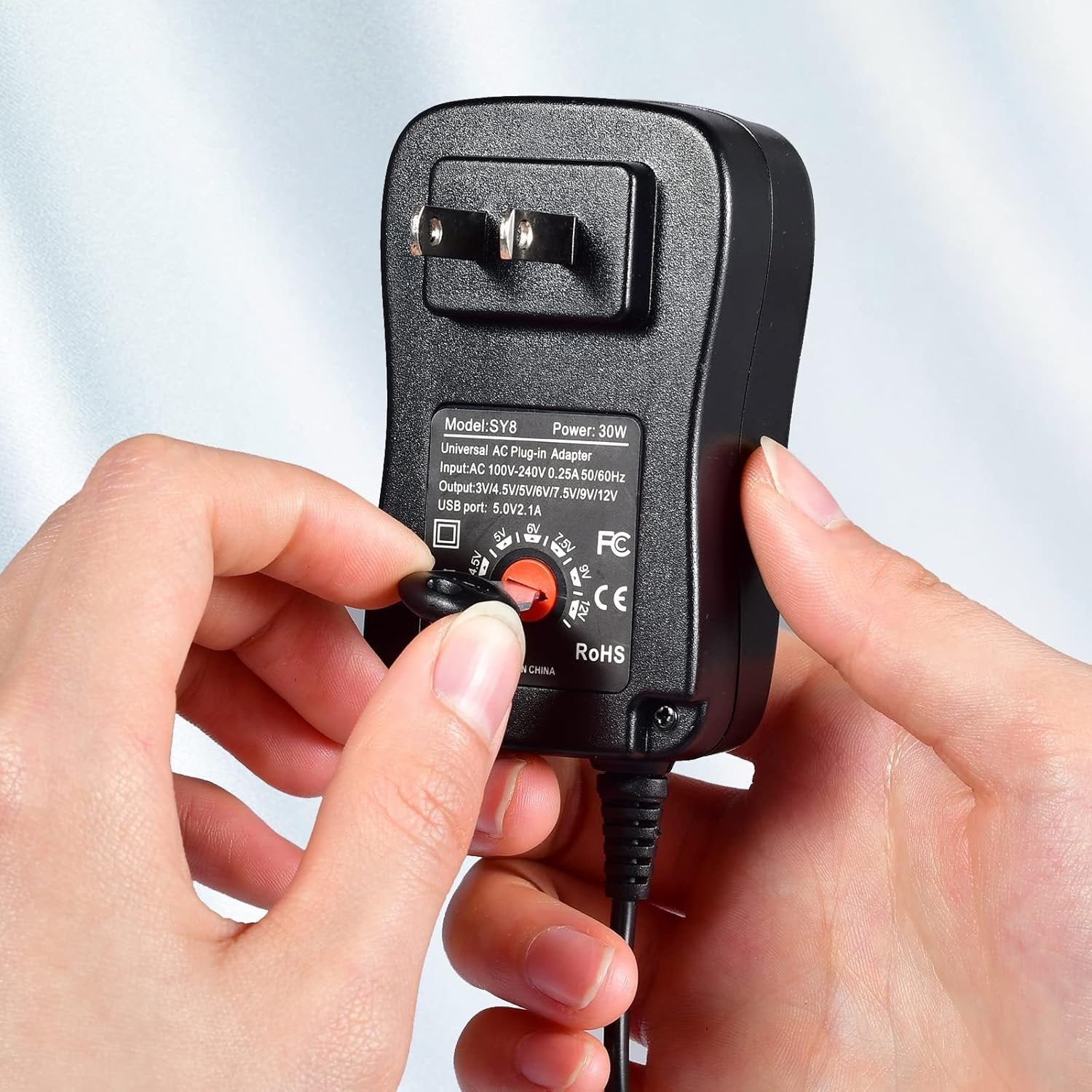 【Universal Power Adapter】Output: 3V/4.5V/5V/6V/7.5V/9V/12V; Input: AC 100V-240V 0.25A 50/60Hz; USB port: 5.0V 2.1A. Voltage adjustment: From 3V to 12V, twist the voltage dial clockwise according to the indicating arrow; from 12V to 3V, twist the voltage dial counterclockwise. 【Multipurpose AC/DC Adapter】This international adapter includes 8 different adapter plugs, which can meet your daily needs. 【Easy to Use】Our universal plug adapter is easy to use, just plug the adapter into the equipment you need and connect to the power supply. 【Wide Application】This universal power supply is suitable for various household electronics such as routers, CCTV cameras, LED light strip, speakers, radios and so on. 【Warm Tips】Please carefully check the output voltage, current and polarity of your equipment before purchasing.