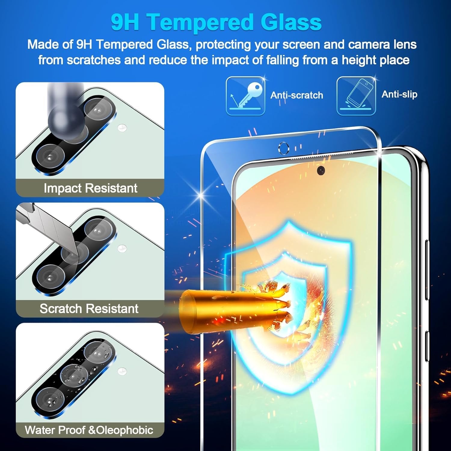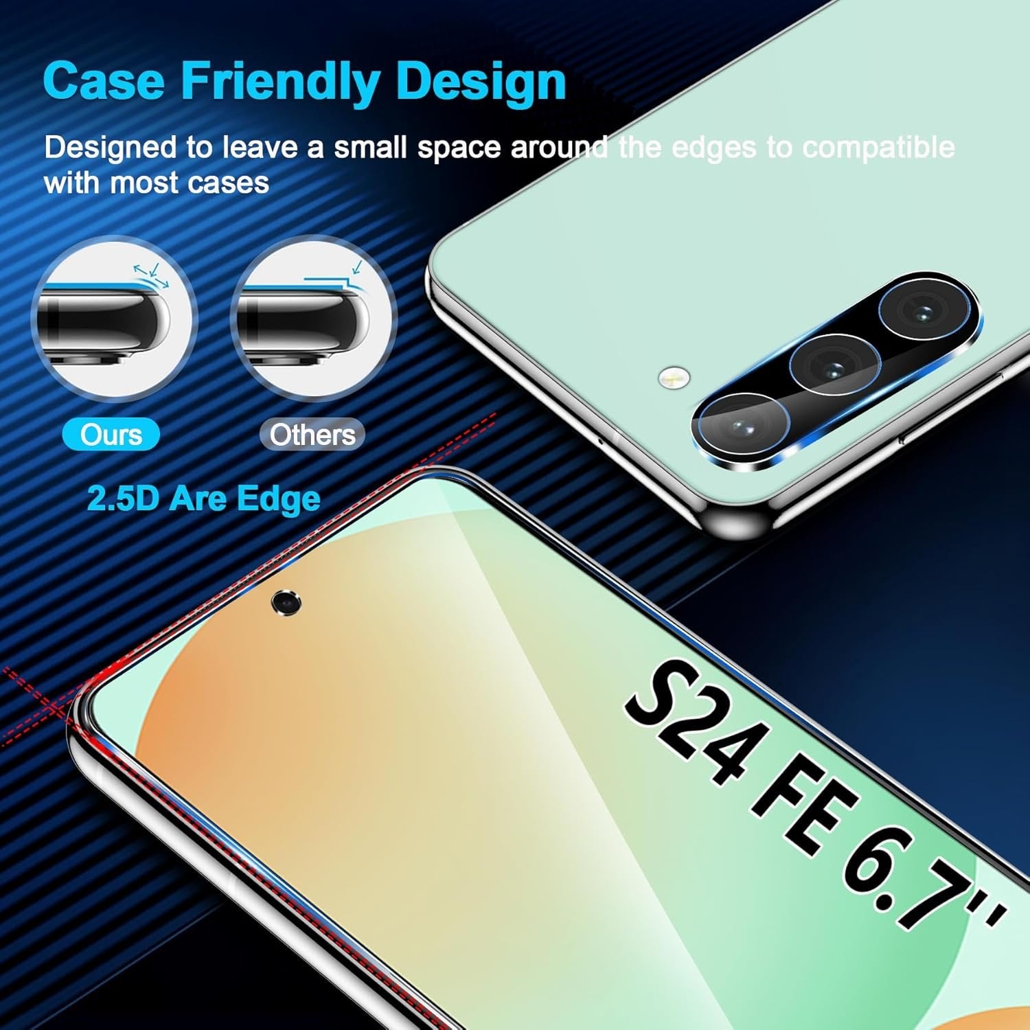 【Support Ultrasonic Fingerprint & Ultra Clear & Touch Sensitivity】 High-response Haptic Touch Technology gives a "True Touch" feel, 0.18mm thickness is reliable and resilient which support ultrasonic fingerprint. 99% HD Clear screen protector with High definition transparency film and maximum resolution which keeps the bright and colorful image quality. Compatible with Face Recognition 【9H hardness& 3X Stronger Scratch resistant】Upgrade 10X Military Shockproof with edge strengthening design, Highly durable Resistant Tempered Glass can Effectively Protect Your S24 FE from Unwanted Scuffs and Scratches by Keys and Some Other Hard Substances. 【6 Pack】3 Pack Screen Protectors+3 Pack Camera Protector are both made of High-quality Tempered Glass for Samsung Galaxy S24 FE(6.7") 【Case Friendly & Does not fall off】It is 100% brand new, Precise laser cut Full Glue Sticky tempered glass and will not fall off, exquisitely polished, 2.5D rounded edges technique makes curved edges of the film to perfectly fit curved corners and edges of the phone, 1.4 mm margin around the edge of the device to be compatible with MOST cases 【Camera Lens Protector Double Protection】Nano electrostatic automatic adsorption technology, easy installation and not easy to fall off, without any bubbles or white edges. Up to 9H hardness tempered glass, can protect the camera from scratches, shatterproof and high-impact drops. Anti-fingerprint coating to keep it clean, the light transmittance of 99.99%, compatible with NIGHT SHOOTING FUNCTION, these features allow you to keep phone photos original all the time 【Easy Installation & Without bubble & Oleophobic Nano Coating】:It adopts premium quality AGC glass materials, thus creating an oil-resistant, anti-fingerprint, Highly durable, and scratch-resistant surface that is easier to clean and protect against sweat effectively, and enhance the visibility of the screen. Bubble Free Guaranteed. Removing dust and aligning it properly before actual installation, One-touch ultra-light automatic adsorption installation, no foam at all