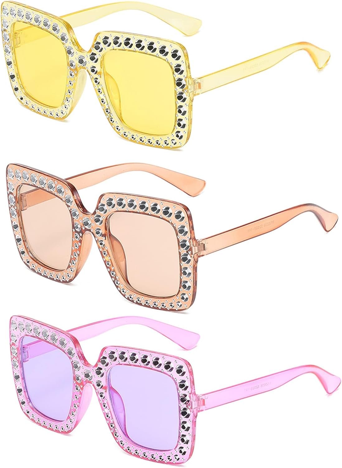 3pcs Oversized Rectangle Rhinestone Sunglasses, Unisex Thick Frame Bling Hollow Out Design Sunglasses Sparkling Retro glasses for Women Dresses up Clothing Accessories Summer
