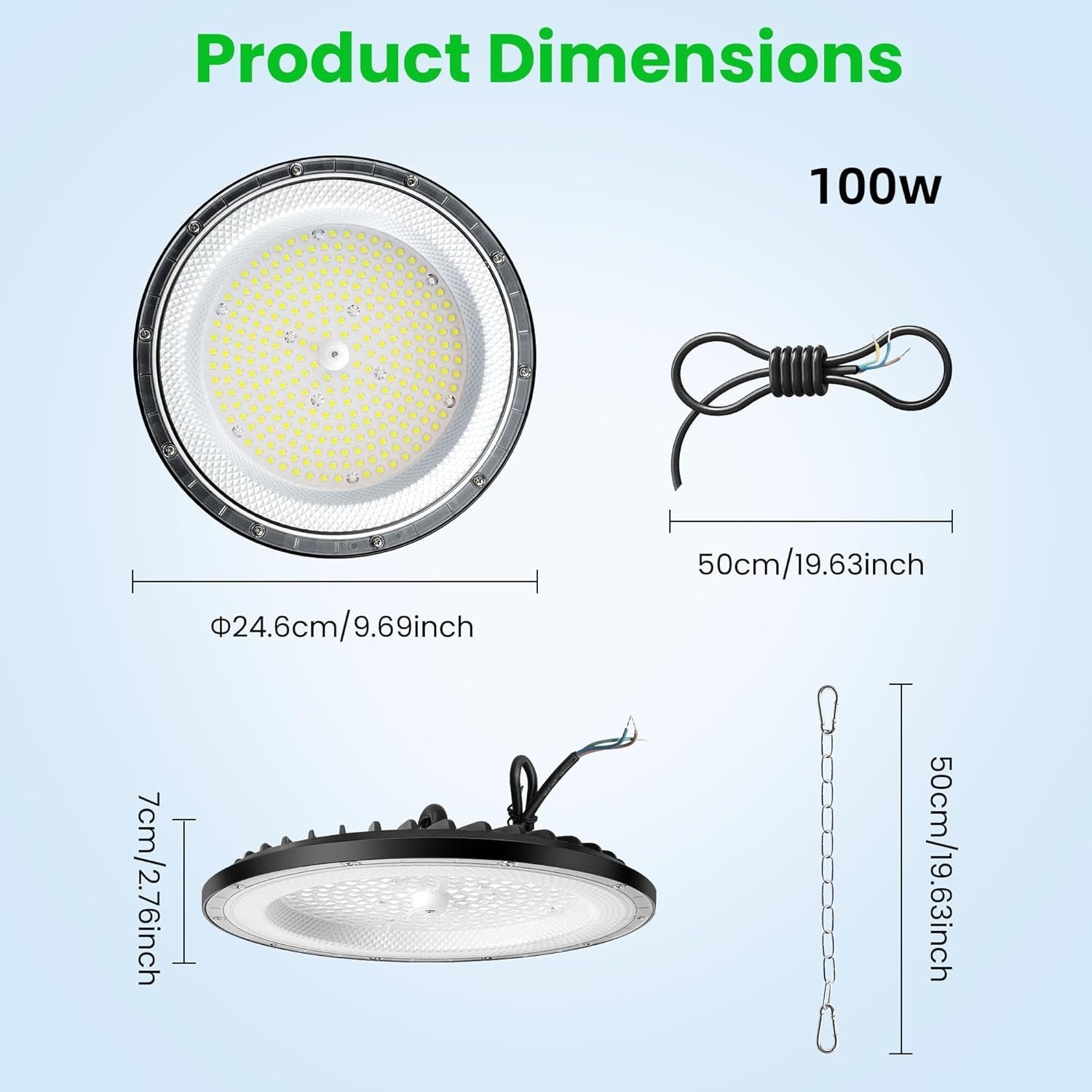 【Super Bright & Energy Efficient】100W led shop lights adopts SMD3030 LED beads to provide 15000lm brightness, which is several times brighter than traditional bulbs, so it can save up to 85% of the electricity bill. 120° large illumination angle ensures the maximum light coverage, which provides enough brightness in large spaces and at night. 【Strong & Durable】The high bay led shop lights is made of aluminum cold forging molding, high temperature and corrosion resistant, sturdy and stable structure. It will not be damaged even if used for a long time in a harsh environment, suitable for indoor and outdoor lighting. 【Efficient Heat Dissipation】Shop lights for workshop led adopts integrated aluminum shell and fin design, which increases the heat dissipation area and improves the heat dissipation efficiency, thus prolonging the service life of the lamps and reducing the replacement cost. 【Easy Installation】Our LED high bay light is designed to provide wide area illumination, which means fewer fixtures are needed to illuminate larger spaces. This reduces installation costs and makes it a more efficient lighting solution overall. 100-277V AC direct power supply, recommended installation height 10-13 feet. 【Eye Protection & Ultra Waterproof】This led garage light with upgrade mould and upgrade lens shrink the space in between, making the lighting output more uniform and no yellow spot, help the focus light without any light loss as well. IP65 rated waterproof and dustproof for use in dark and damp warehouses, workshops and garages. 【Wide Application】Our LED garage lighting is designed to be used in a variety of environments, from industrial warehouses and factories to gyms and retail shops. Its wide-angle illumination ensures that even the largest spaces are evenly lit. Even the production facility of an airliner uses our high bay LED lights!