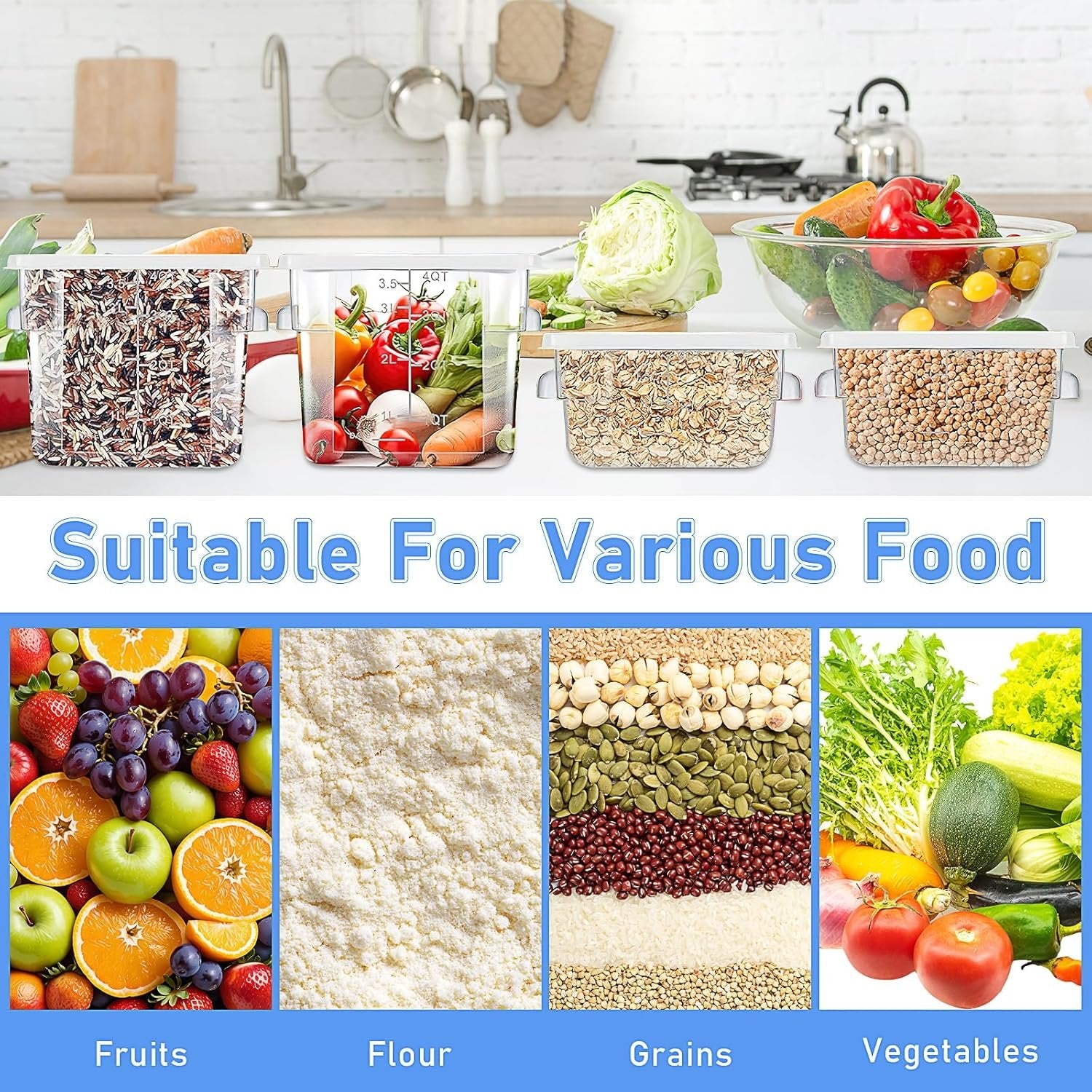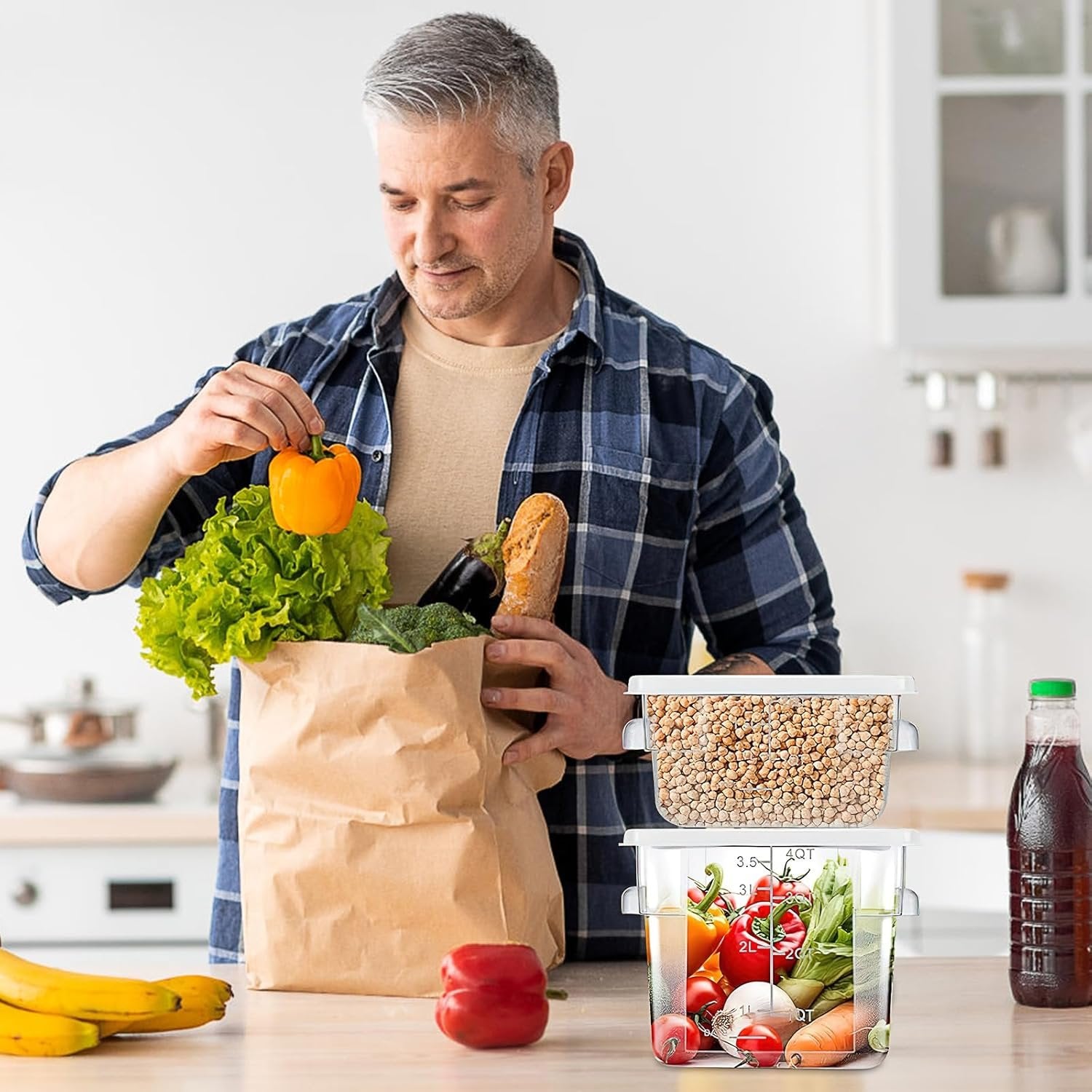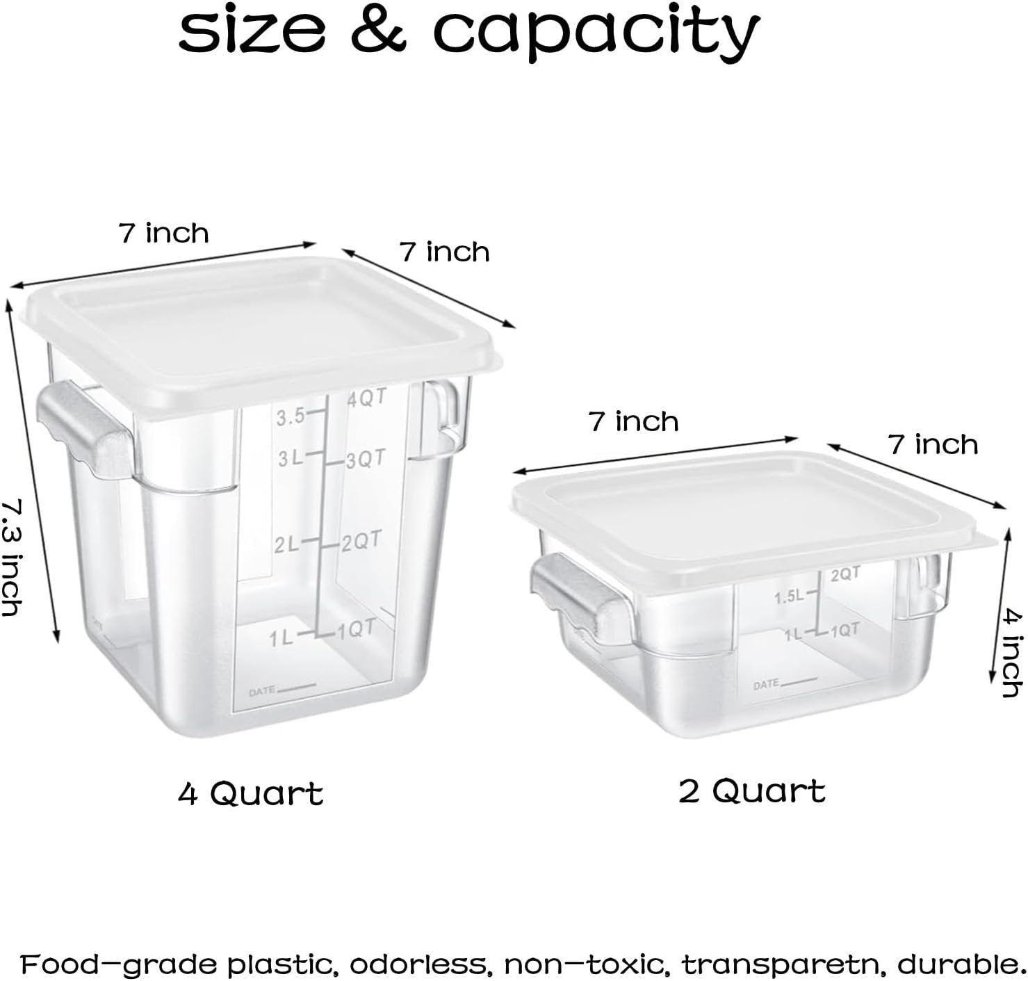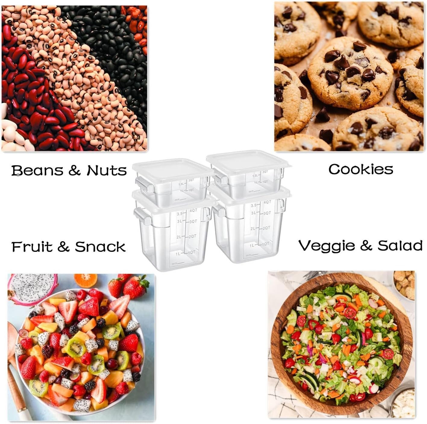 Durable and Versatile Storage Solution: This 4 Pcs Food Storage Container with Lids Set includes two sizes (2qt and 4qt). Use them for kitchen storage, flour storage, storing dry ingredients, proofing dough, brining, or marinating meat. The clear storage containers make it easy to see contents at a glance, adding convenience to your food organization. Reliable and Strong Material: Made from high-quality PC material, these commercial food storage containers are durable, and resistant to breakage, designed for long-lasting use, meeting the demands of both home and restaurant kitchens. Beautiful gifts for Christmas or housewarming for family and personal. Easy and Convenient Food Storage: Featuring lids and a scale measurement on the side, these large food containers with lids keep your food fresh longer by reducing exposure to air. Whether you're storing liquid or solid food, the practical design ensures your contents stay safe and preserved. Multipurpose and Safe: This set of clear pantry storage containers is not only perfect for everyday food storage, but also ideal for storing liquids, fruits, and even sourdough. Microwave and freezer-safe (lid must be removed for microwave use), these containers are designed for easy maintenance, offering versatile use for any kitchen environment.