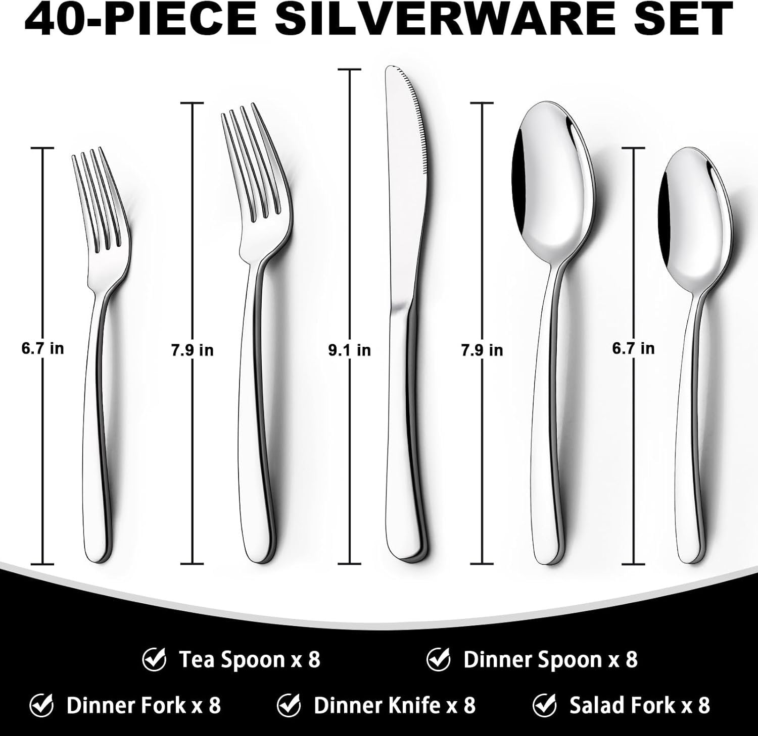 40-Piece Silverware Set, Heavy Duty Stainless Steel Flatware Set for 8, Food-Grade Tableware Cutlery Set, Utensil Sets for Home Restaurant, Mirror Finish, Dishwasher Safe