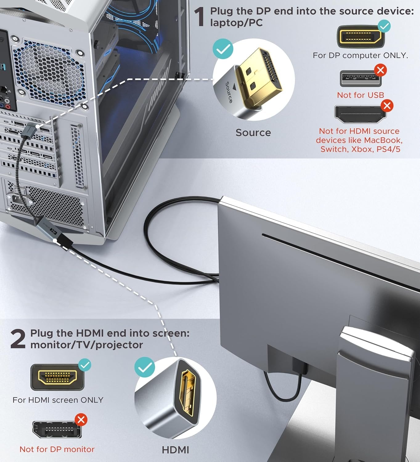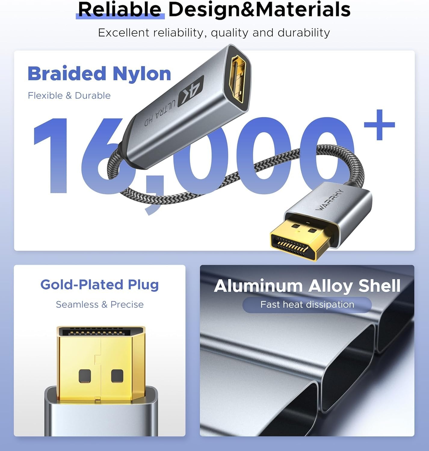 [4K One-Way Video Transmission] ONLY SUPPORT one-way transmission from your desktop/laptop with a DP port to your monitor, projector, HDTV, or VR headset with an HDMI port. This DP male to HDMI female dongle supports 4K at 30Hz with full sound support and is backward compatible with 2K at 60Hz (2560*1440) and 1080P at 120Hz (1920*1080), which is exactly right for you whatever you need high vision quality for art design or high refresh rates for gaming. Support HDCP 2.2 to stream 4K content. [Design Like No Other] Stylish gray metallic shell with a hue of blue. Use of latch-free DP connector design to be firmly and securely connected to your computer. No more worries about damaging interfaces due to the outdated latch mechanism. User-friendly Strain Relief for you to smoothly plug and unplug from your devices. Compact and lightweight design for you to easily tuck it in your pocket and carry it around. [Premium Material] To reach for excellent reliability, quality, and durability, we opted for more advanced materials: Gold-plated connectors are more anti-corrosion and interference-resistant than nickel ones for more stable video output. Aluminum alloy shells are stronger and dissipate heat more efficiently than plastic to avoid damaging devices from overheating. Nylon braided cables are more heavy-duty and have a much longer service life compared to PVC cables. [Universal Compatibility] For home office, late-night gaming, or movie session, you can trust this 4K DP to HDMI adapter that is compatible with various desktops, laptops, PCs, GPUs, and other devices with DisplayPort. Stream videos to HDMI displays like TV, projector, monitor, VR headset, etc.*Note: This is a PASSIVE uni-directional adapter ONLY STREAMING VIDEOS FROM DP SOURCE TO HDMI DISPLAY. [WARRKY] is dedicated to introducing superb-quality products that are sophisticatedly designed and reasonably priced for providing the best solutions to connect your work and life. Consult for fast and responsible support within 18hrs!
