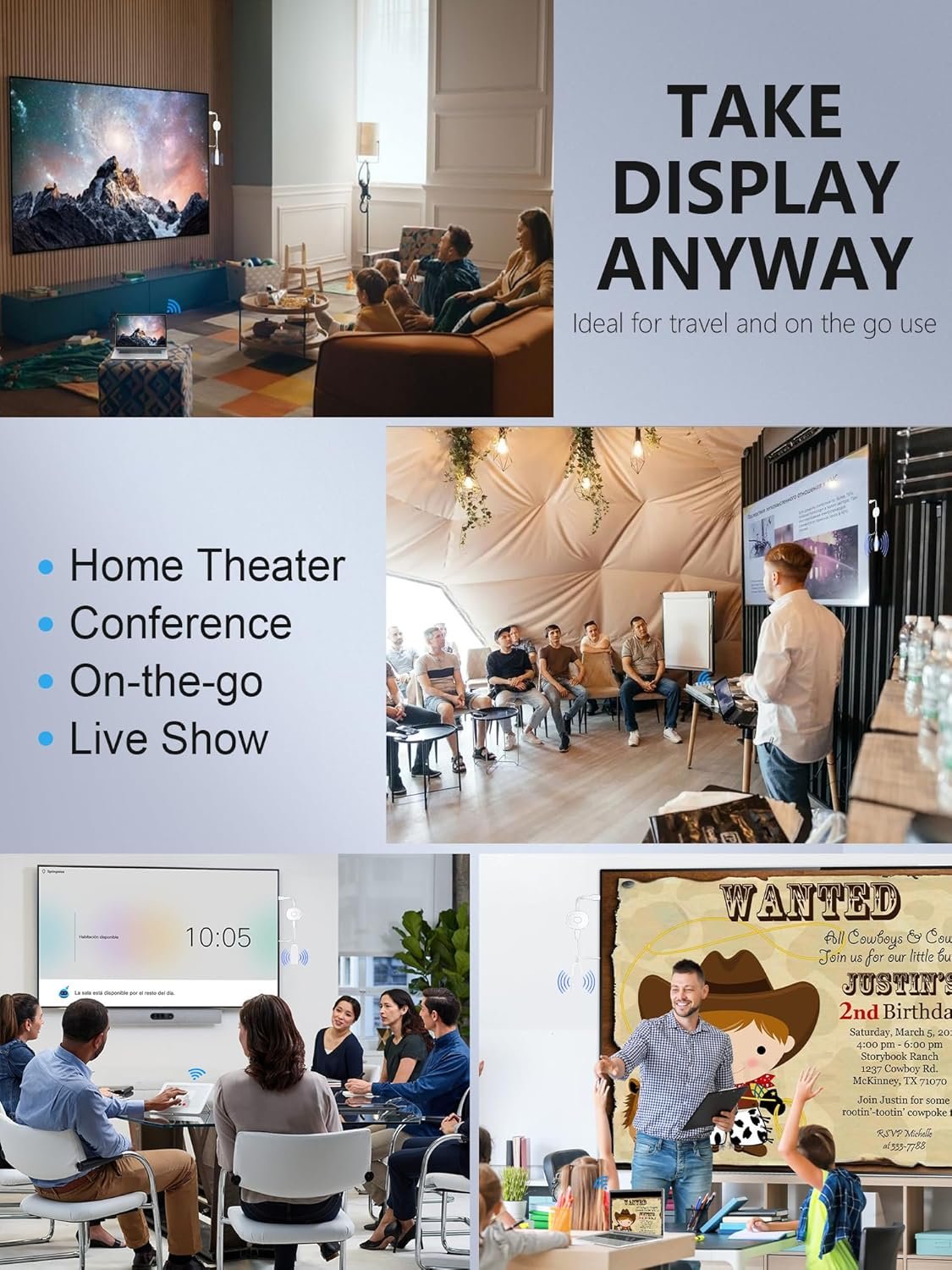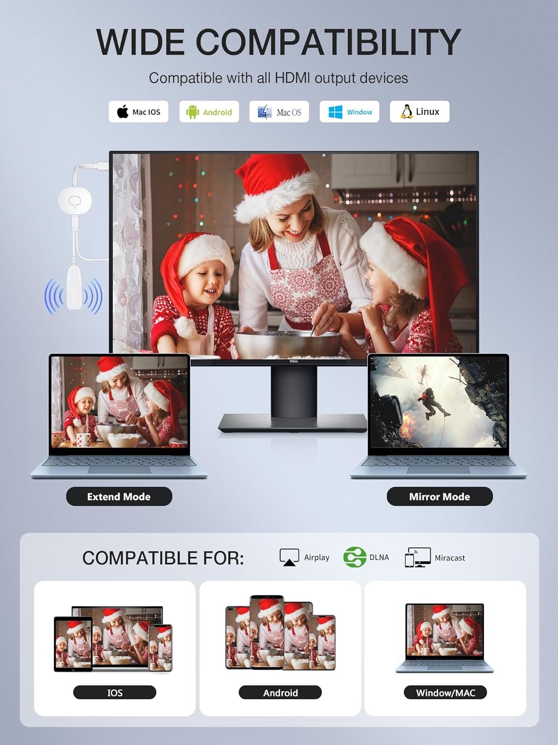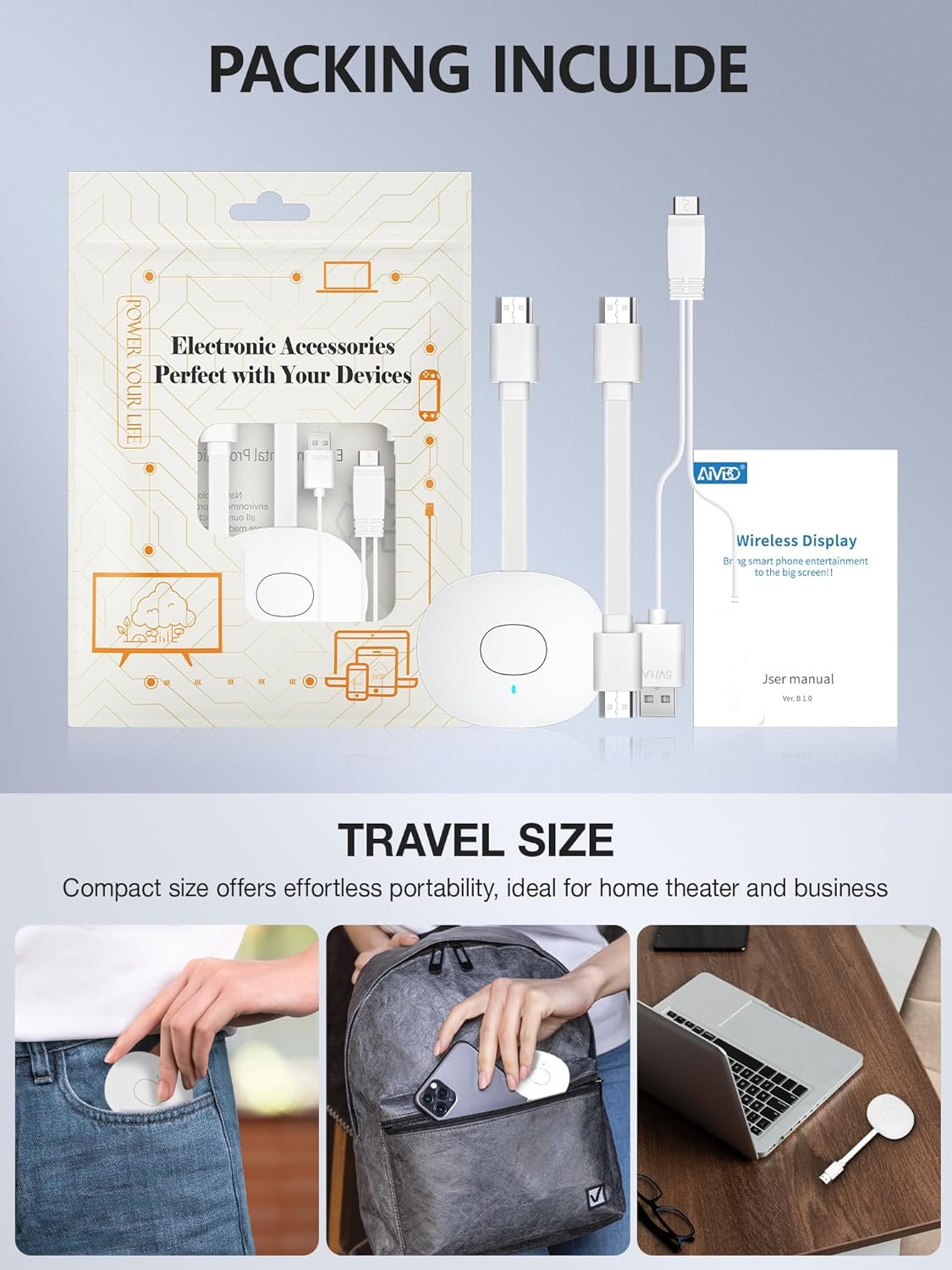 【4K Ultra HD Definition&Wireless connection】: With 4K(3840 X 2160) resolution, TIMBOOTECH WiFi Display Dongle can mirror or cast HD videos/games/music/photos/files from the phone, pad, laptop to TV/projectors /monitors. Suitable for home entertainment/ business/ educations/ training. No messy cords between devices(no cords between phone and TV) 【Wide Compatibility】The TIMBOOTECH wireless HDMI Dongle is compatible with IOS/Android/Windows/Mac OS system, such as iPhone, iPad, Mac book, Samsung,HUAWEI,LG,HTC,Windows PC etc. Support Miracast / Airplay/DLNA 【2.4G Wireless connection】With 2.4G Dual Frequency external antenna, the TIMBOOTECH wireless HDMI dongle better resists signal interference and prevents video delays and jams. The high-speed processor delivers ultra-clear video and image quality for fast transfer and greatly reduced heat generation 【Portable Size】The dongle is in small portable size enabling it to carry anywhere. Use it for business conferences, office routine meetings, education in classes, or take it to your friend’s home when gathering 【IMPORTANT!!】 IOS(Apple) devices DON'T WORK with Subscription Apps: such as Netflix, Amazon Video, Sky Go, BT Sport, DIRECTV, HULU, Comcast tv, Xfinity, Vudu, and Movistar as these Apps have "HDCP" video copyrights protection.Android devices work with most Apps