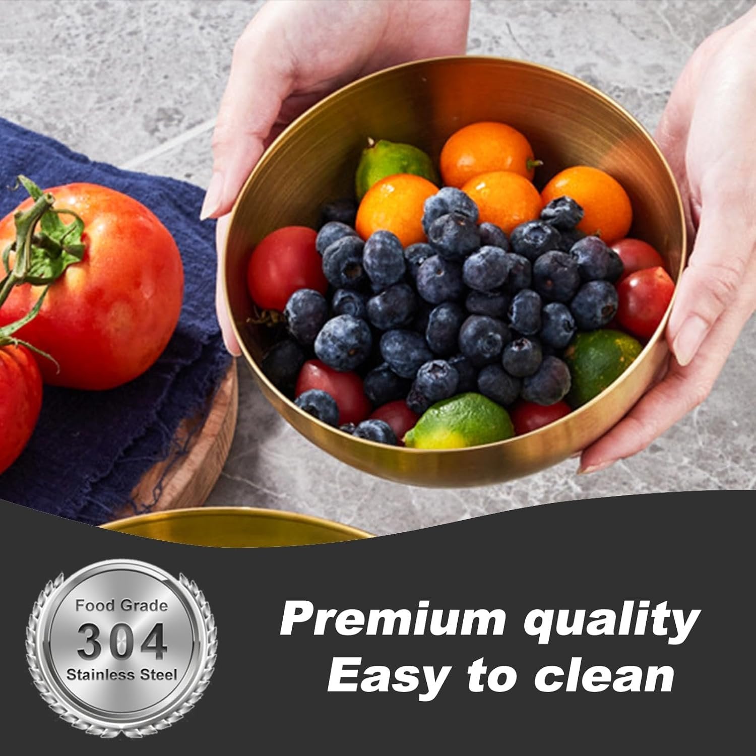 【What You Get】 This metal soup bowls come in 5 gold bowls with a capacity of 25.7 oz /760 ml, enough for your family needs. They can be stacked for easy storage without taking up too much space. 【Stand Wear and Tear】 These stainless steel serving bowls are resistant to both rust and heat. You don't have to worry about them being smashed. Their high quality material ensures that they will not break or deform easily. 【Sleek Surface】 The surfaces of the 25 oz metal cereal bowls are finished with a matte finish. They are sleek and have no sharp edges to hurt you. They are not prone to scratches, marks and fingerprints. 【Easy to Clean】 Those small stainless steel mixing bowls are less likely to leave food residue behind because of their smooth surface. They are easy to clean, just simply rinse with water and soap or wash in a dishwasher. 【Wide Usage】 These steel prep bowls are practical and versatile in your kitchen. They can be widely used as rice bowls, noodles bowls, soup bowls, ice cream bowls, snacks bowls, salad bowls, or small mixing bowls.