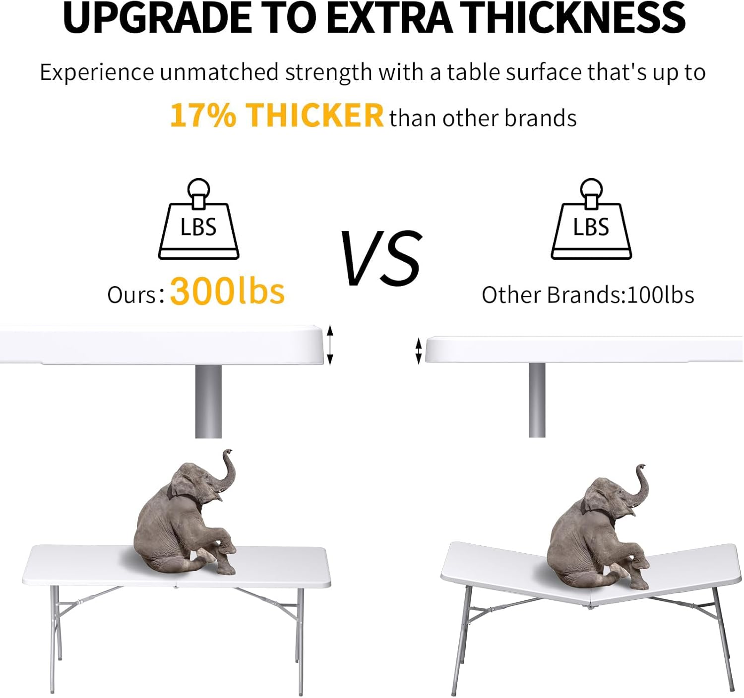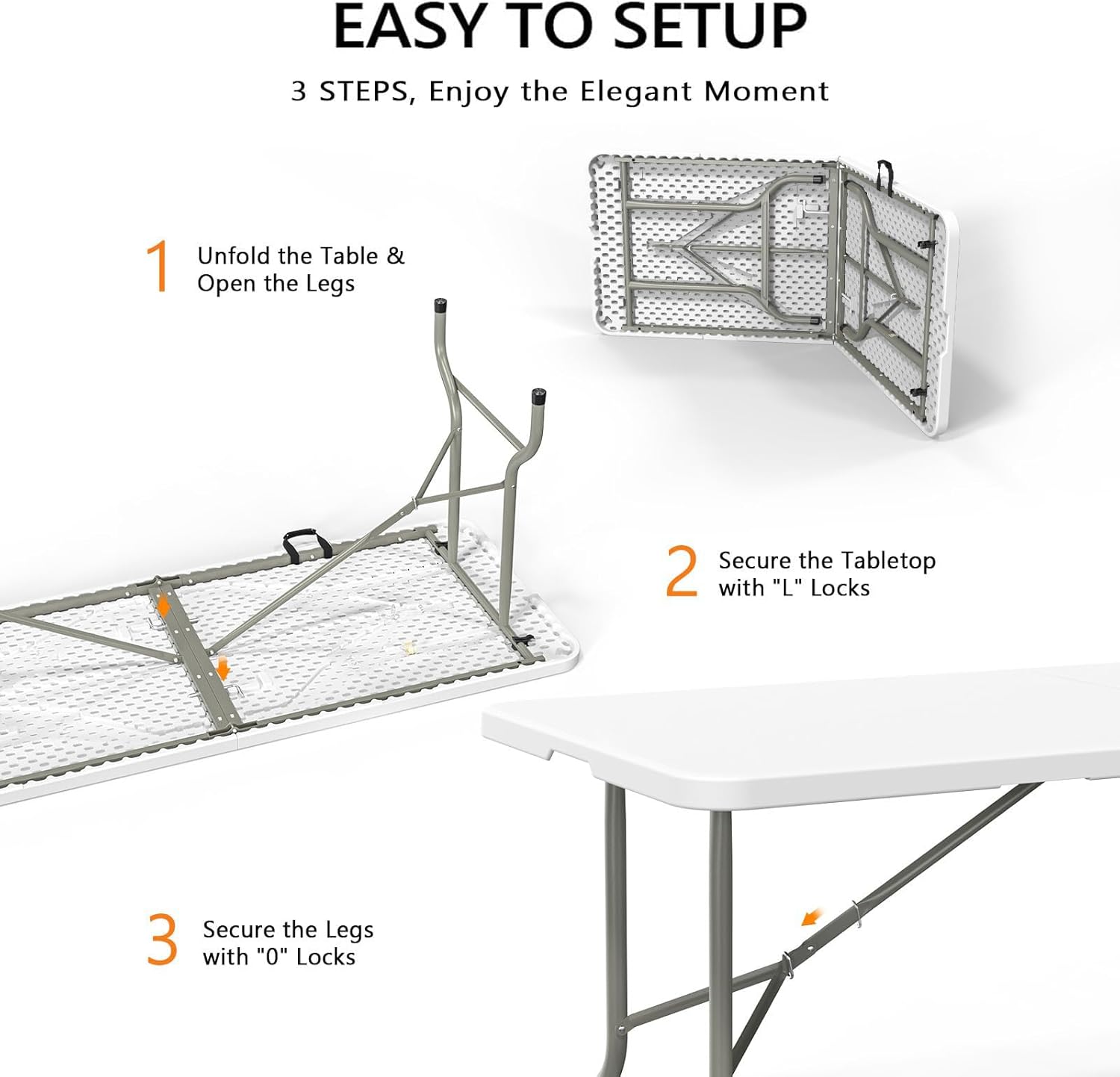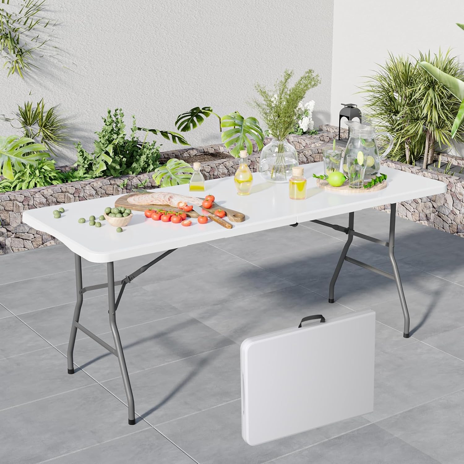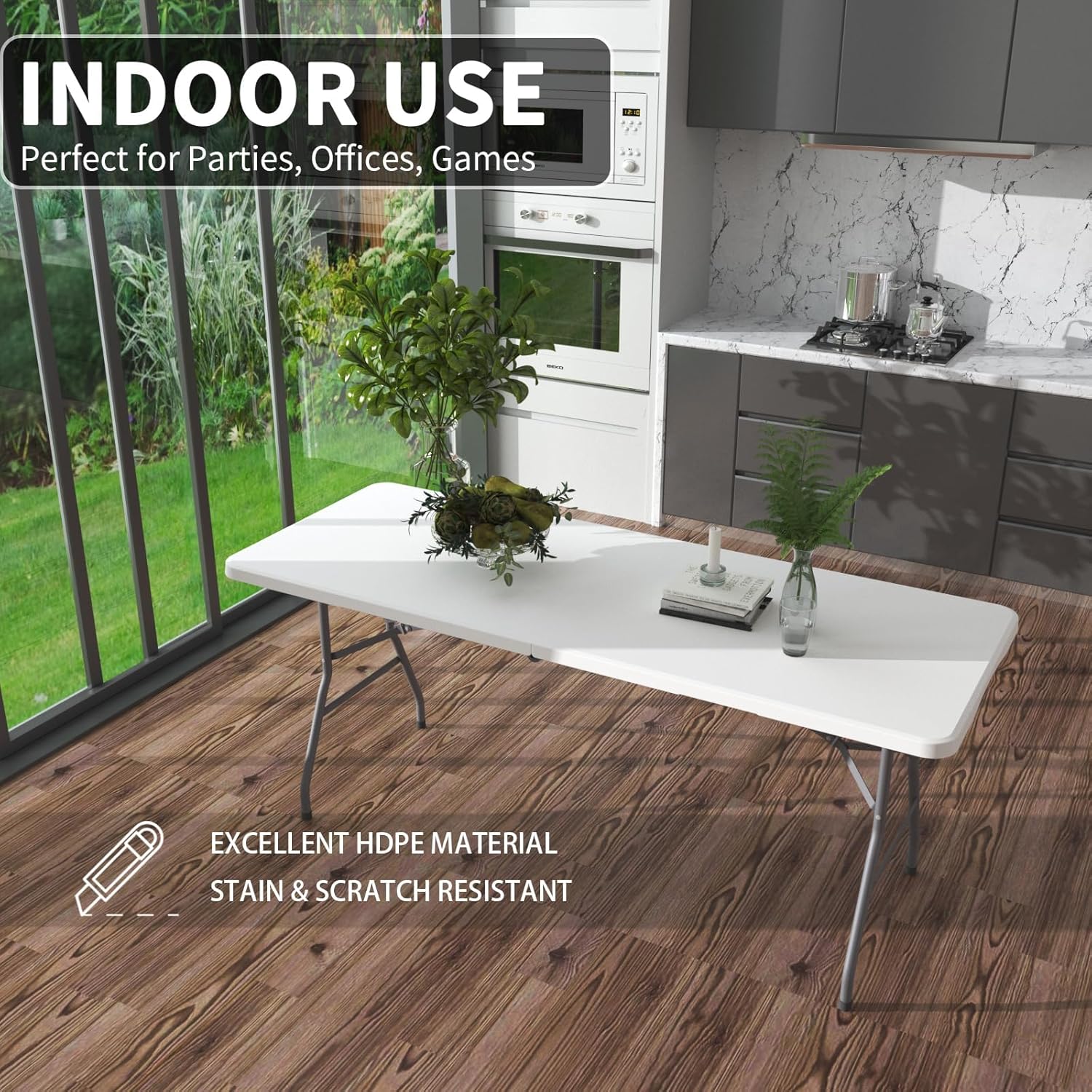 6 Ft Portable Foldable Long Table, Folding Table for Indoor Outdoor, Smooth HDPE Tabletop with Built in Handle & Steel Legs, Perfect for Party, Dining, Wedding, Events, Camping, Utility, Temporary