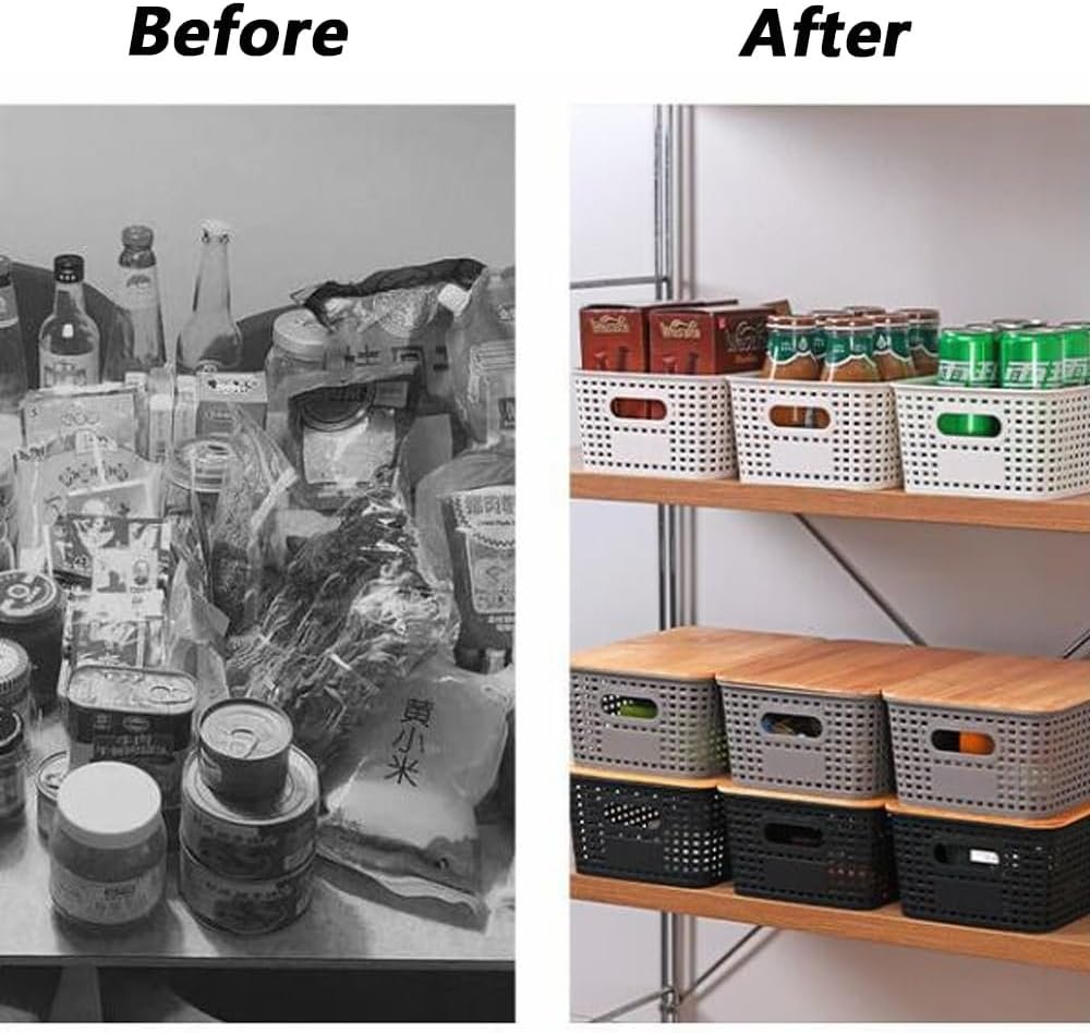 【Package Includes】6 set Storage Baskets with Bamboo Lids,Size:25.5cm x 18.4cm x 10.6cm/10inch x 7.23inch x 4.inch.Colour:Black. 【Material】storage bins are made with water-resistant plastic material and can easily be cleaned directly with water or damp cloth. 【Stackable 】Plastic storage containers with lid with stacking design not only convenient storage, but also saves space and keeps things tidy. Portable Handle on side of the baskets for easy removal from shelves, convenient and safe. 【Widely Used】 storage bins with lid are excellent for storage and practicality, great for storing a wide variety of household items, you can use it in closets, cabinets, shelves, living rooms, bedrooms, bathrooms, offices and garages etc. 【Minimize the Everyday Mess 】Adding our storage bins for organizing closets and shelves to your home can help reduce the number of things left out by your family and help you save valuable space, so you can spend less time cleaning up.