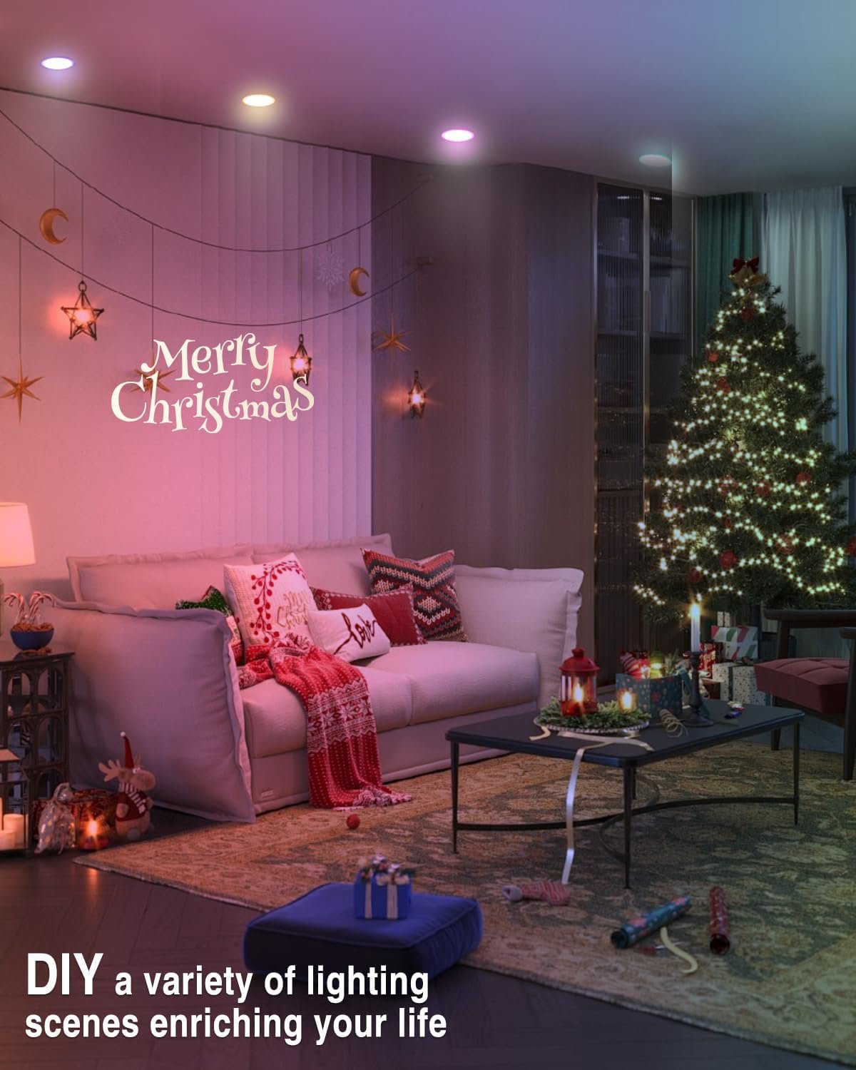 BLUETOOTH GATEWAY & STABLE CONNECTION - Featuring a built-in Bluetooth gateway and support for 2.4GHz Wi-Fi networks,our smart recessed lights ensure fast and stable connectivity,eliminating disconnection issues.Seamlessly control your lights anytime,anywhere,and enjoy a smooth smart home experience. SMART VOICE CONTROL & MUSIC SYNC - Easily compatible with Alexa,Google Assistant,and Siri for hands-free control of power,brightness,and color settings.The unique music rhythm mode syncs the lights with your favorite beats,perfect for parties,concerts,or creating a dynamic home atmosphere. 42 PRESET SCENES & 16 MILLION COLORS - Choose from 42 preset lighting scenes or create your own custom colors.The front light offers adjustable color temperatures from 2700K warm white to 6500K cool white,while the ambient light features 16 million RGB colors with 1%-100% dimmable brightness,catering to any mood or occasion. MEMORY FUNCTION & EASY OPERATION - The smart memory function saves your last-used settings,restoring your preferred lighting state upon restart.Long-press the switch to toggle between front light (4500K) and night light modes.Combined with remote or app control,operation is intuitive and hassle-free.