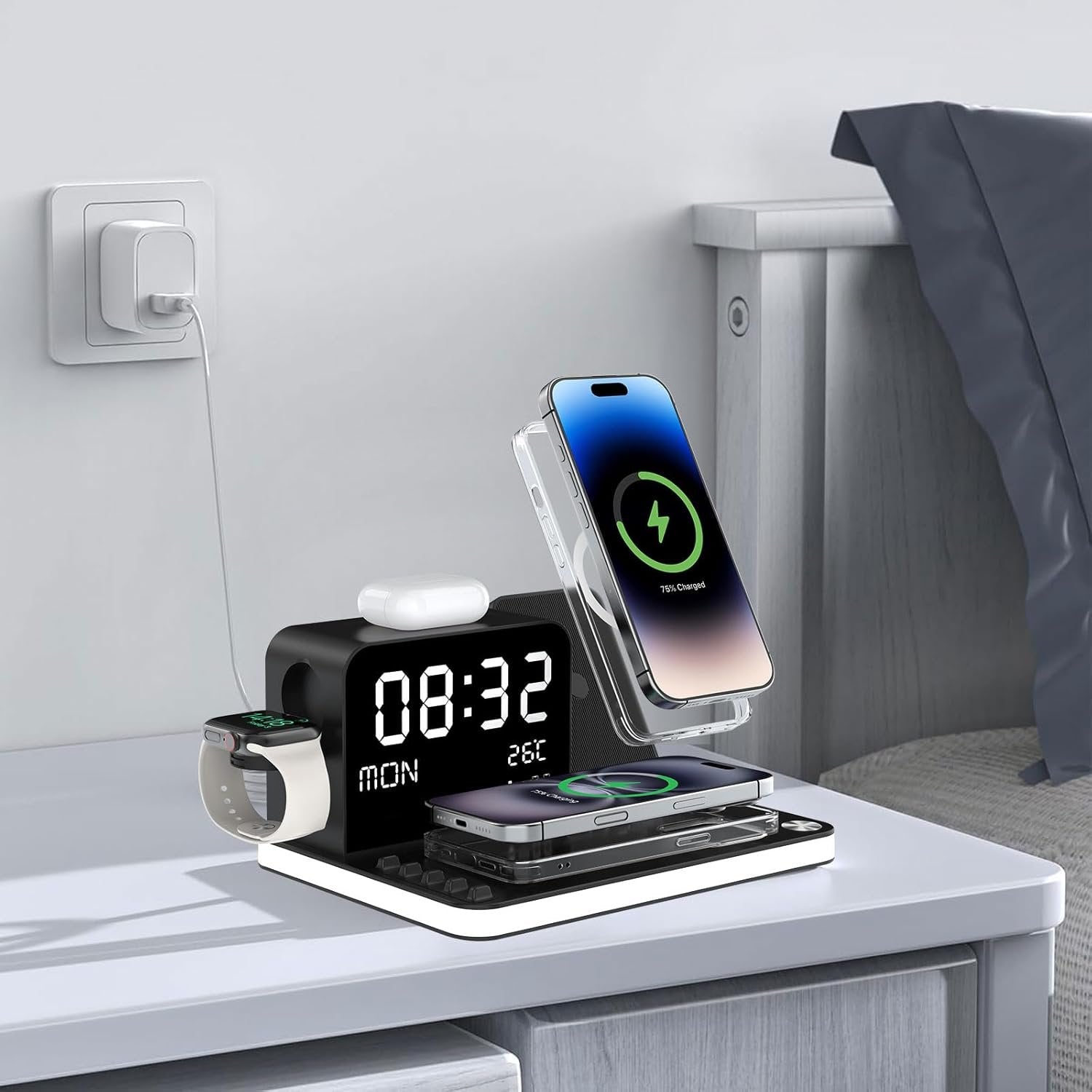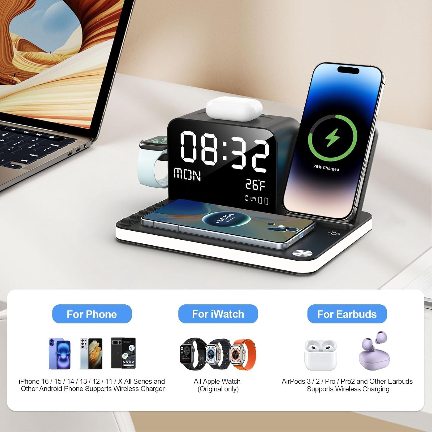 7 in 1 Wireless Charging Station, Fast Charger Station with Dual Phone, Bluetooth TimeSync, Temperature, Touch Night Light,33W Adapter for Phone 16/15/14/13/12 All Series & iWatch