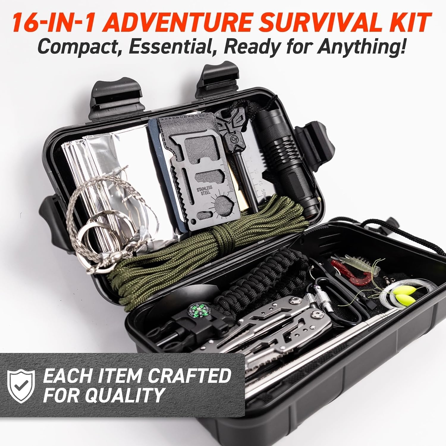 Essential Survival Tools Included: Equipped with critical survival gear such as a multifunction saber card, wire saw, and flint and fire starter, this kit is meticulously curated to help you thrive in any outdoor scenario. Compact and Portable: Designed for convenience and portability, each tool in this kit is crafted to be lightweight and compact, making it ideal for backpacking, camping, hiking, and any adventure where space and weight are a concern. Durable and Reliable: Quality materials such as alloy for the pen and window breaker, and an aluminum alloy whistle ensure that tools are sturdy and long-lasting. Depend on this kit for all your wilderness adventures and emergency situations. Ready for Emergencies: The survival bracelet alone is a multi-use tool featuring a flint, Whistle and paracord, and the kit also includes a flashlight and thermal blanket, preparing you for unexpected situations in any environment. Perfect Gift for Men, Dads, and Him: This 16-in-1 survival kit is the ultimate gift for the men in your life. Whether he's a seasoned outdoorsman, a hands-on dad who enjoys weekend camping trips, or the man who likes to be prepared for anything, this kit is sure to be a hit for birthdays, Father's Day, or just to show appreciation.