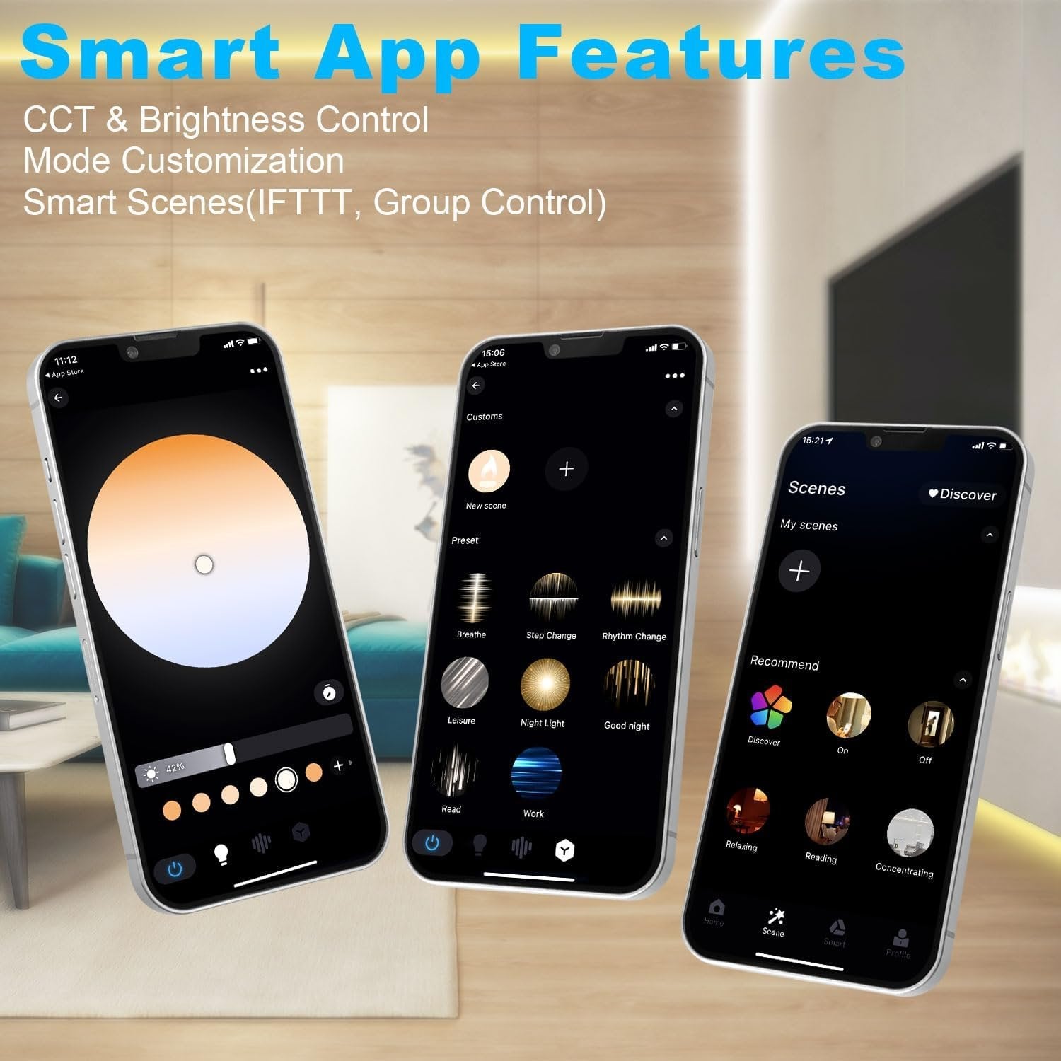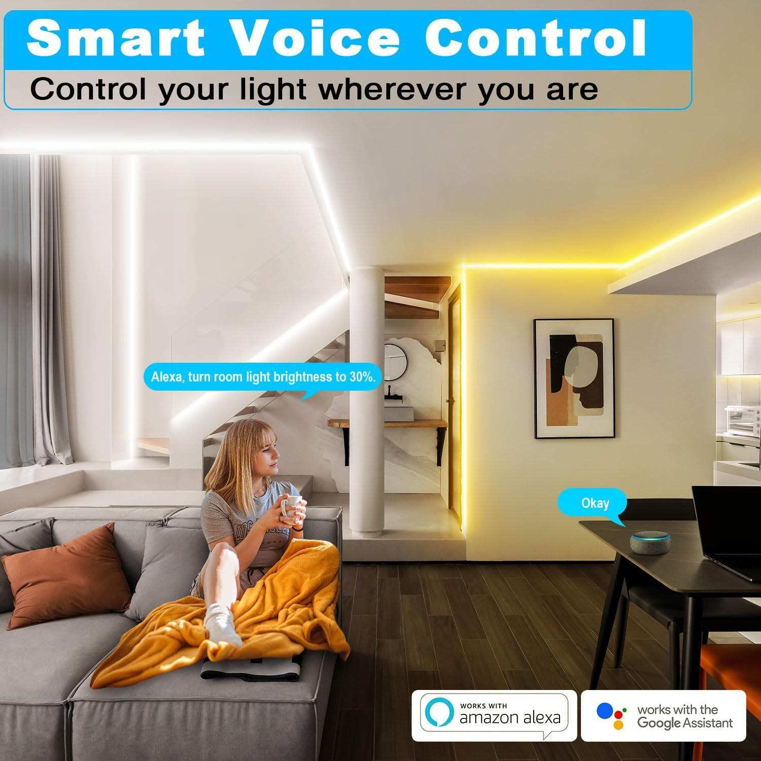 🟡 Alexa Compatible & Voice Control LED Strip: Using smart wifi controller, the white strip light works with Alexa, Google home and Siri Shortcuts. You can voice control with smart assistants and set up automatic tasks(IFTTT) in app. By connecting to home Wifi (2.4GHz Only), you can control the LED light strips wherever you are and share control with friends or family members. âšªï¸ Dimmable CCT Adjustable White LED Strip 3000k to 6500K: The under cabinet light is super bright for it has high density, 120 leds per meter (warm and cool white). The brightness is dimmable with app and remote control, color temperature adjustable from 3000k to 6500k, soft to cool white. The working voltage of the led strip lighting is 24 volt with better energy efficiency. 🟡 Smart App & 360° Remote Control: You can control the white led strip by app or the 2.4g remote. The remote requires two AAA batteries(not included) and allows you control from all directions without pointing to the tape light. The app allows you to customize modes(breathing, strobe, flash, candle) and power on setting, for example, power on with last setting. It is worth mentioning that the led light has music sync and candle mode. âšªï¸ 7M White Led with App Smart Timer: You can set the light strip to turn on/off at scheduled time with specified light settings in app.The turnable white strip is 7M (23ft) in length which is suitable for kitchen, bedroom, closet, wall, ceiling, under counter, room decor, as mirror lights, white christmas lights, shelf and under cabinet light. 🟡 Self-adhesive under cabinet lighting: The cuttable light strip has sticky tape backing and extra clips are included for easy installation, just peel and stick. The white led is also cuttable on the brown marks and provided with 24 month warranty. Please do not hesitate to contact us if any problem.