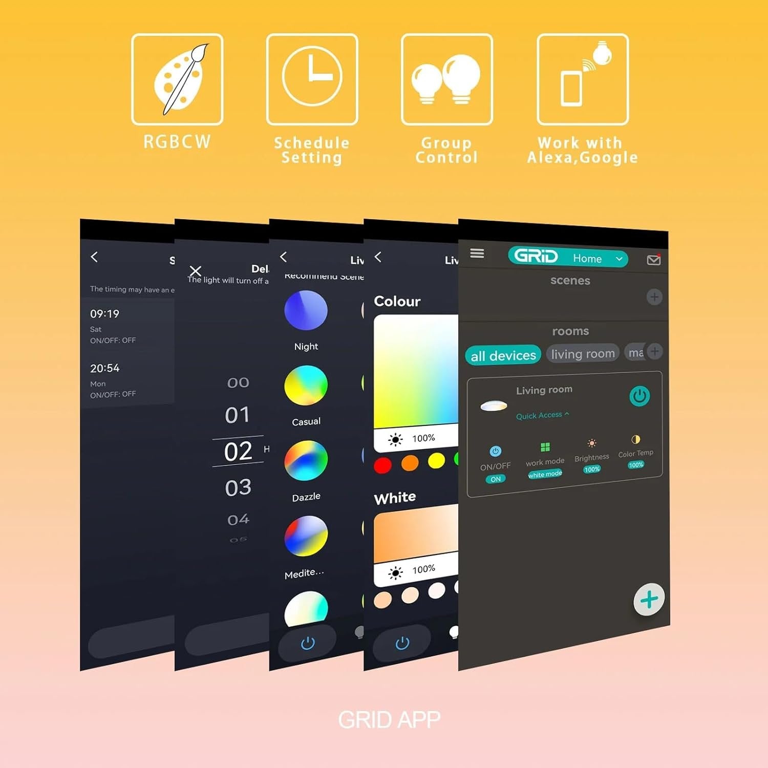 ã€RGBCW Multi-Color And Dimmable Brightness】Red+Green+Blue+ Cool White + Warm White Smart Bulb. Choose Any Color You Want with 16 million colors, and dim the brightness of every color from 1% to 100% ã€User-friendly APP And Remote Control】Simply connecting WiFi smart light bulb with your home network (only supports 2.4GHz Wifi), then you can remotely control smart light bulb using App whenever you are ã€Voice Control with Alexa and Google】Easy voice control of Wifi Smart bulb via integration with Amazon Alexa and Hey Google. Ex, you can say, "Alexa set the bedroom to warm. Free your hands to control the downlights. Use simple conversation starters to turn your lights on and off, set color, make them brighter. No hub required ã€Timing And Group Control】Never come home to a dark house - by using light schedules on the app and be greeted with warm light. The timer function enables smart led light bulb power on and off automatically. Group control function allows you to control more than one smart light bulb at the same time for scene setting ã€Bluetooth For Signal Instability】Poor wireless signal? Don’t worry. AFTER you connected the downlight via 2.4Ghz WiFi, you can control it with Bluetooth. Nice choice for occasional network signal instability. (Note: Please match the downlight to APP with 2.4Ghz WiFi first)