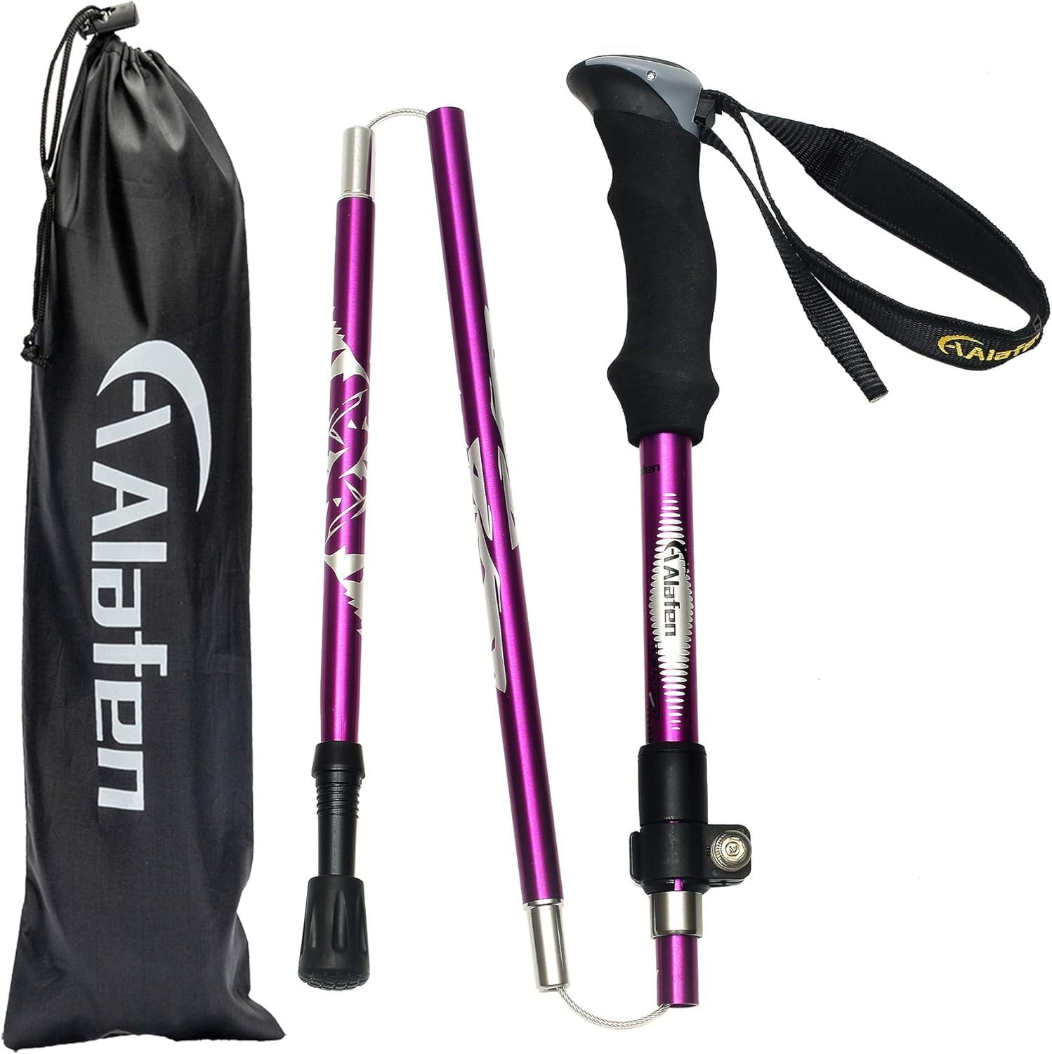 SUPER COMFORTABLE:EVA Foam Handle with wrist strap, sweat-absorbent, skid resistance groove design,and super comfortable for long time use.International Standard Length of 43" long, and 14.1" when folded, fitting perfectly in your backpack ULTRALIGHT AND STURDY: Ultralight Shaft made of aircraft grade 7075 aluminum alloy, extremely durable and not easy to deform QUICKLY LOCK: New Quick Lock System, adjustable pole length from 43.3" to 49", with measuring scale to easily get your preferred heightby. Fits users from 5' 1" to 6' 2" (155cm-187cm) MUCH SAFER:Tungsten Steel Rod Tip under the rubber footing, much safer and more abrasion resistant 100% CUSTOMER SATISFACTION GUARANTEE-We are so confident in the quality of this folding hiking pole that we will offer you an unconditional money back guarantee if you do not believe that the hiking pole lives up to expectations.