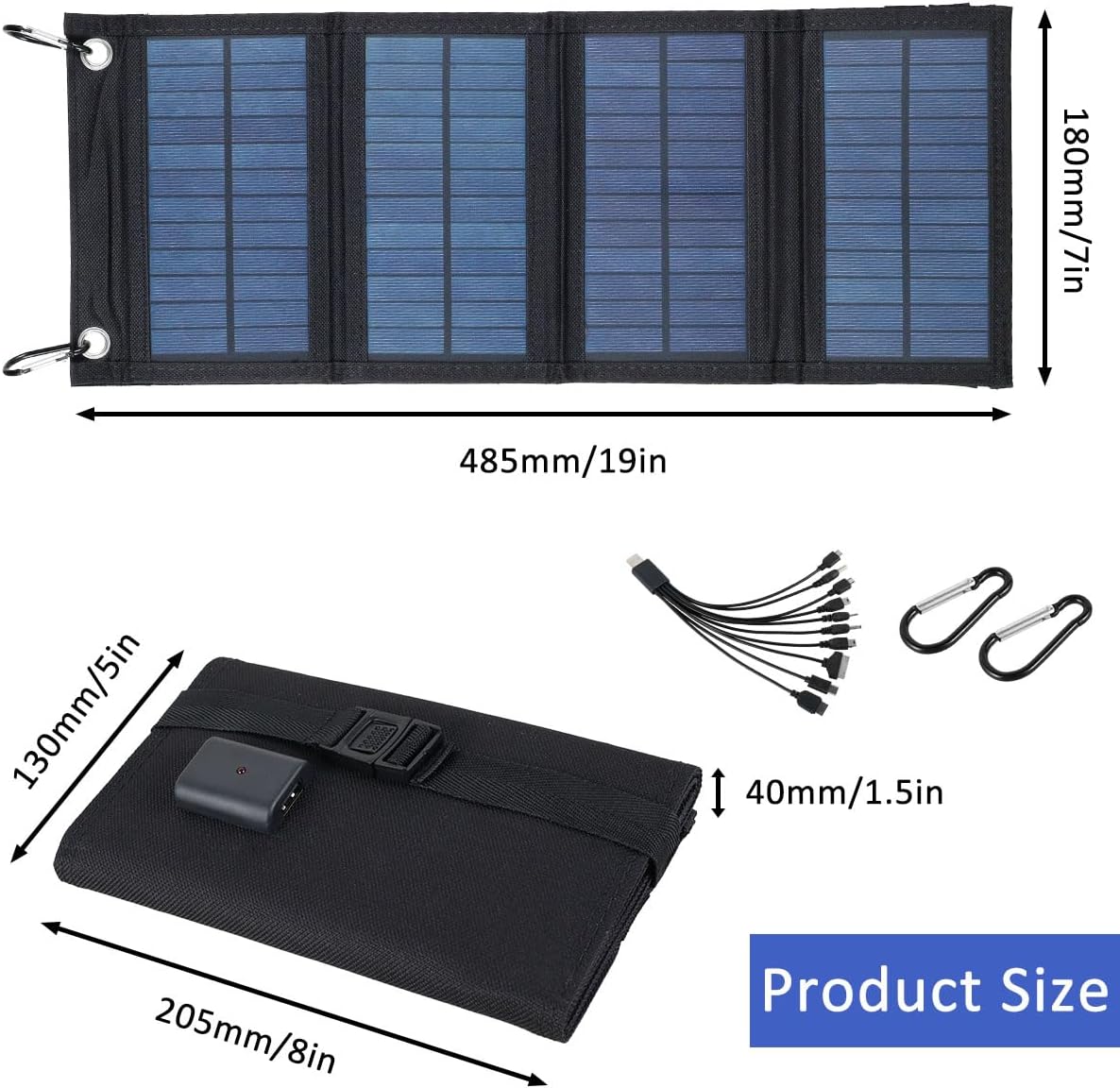 (*^_^*) [Good PET Material] This solar panel folding charger is made of premium PET material, which is IP65 Waterproof. The solar panel adopts monocrystalline silicon, which is eco-friendly. It is sensitive and durable to use. (*^_^*) [Charge for Your Phone] Our product solar conversion rate is 20, which is suitable for charging for your mobile phones, mobile power and more. (*^_^*) [Widely Uses] The product is suitable for outdoor activities, emergency and outdoor operations. It provides continuous power supply even on cloudy days. (*^_^*) [Foldable and Lightweight] Our USB solar power charger is foldable and lightweight, easy to carry. It is ultra-thin, convenient to store and install. The folding size is 205×130×40mm. (*^_^*) [After-sales] If you have any questions, please get in touch with us, our service team will provide you with a professional and satisfactory service.