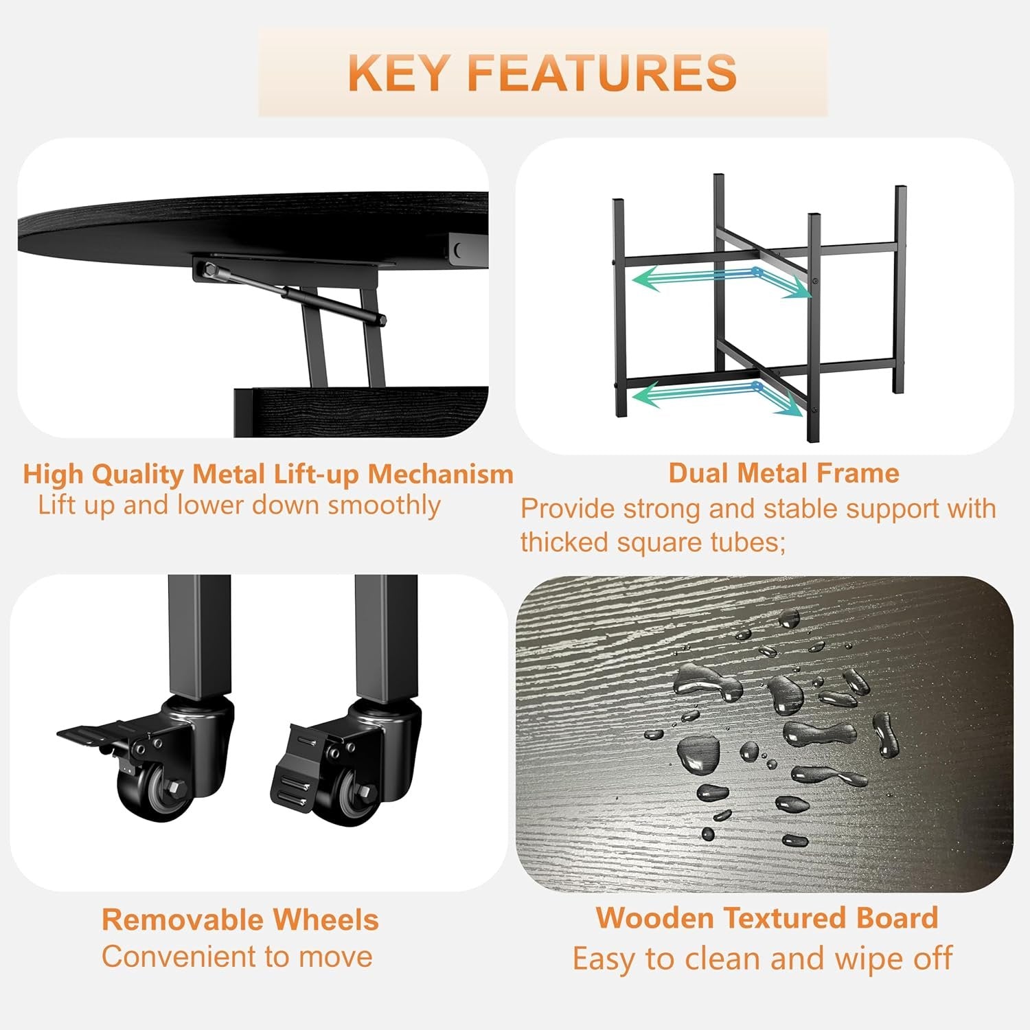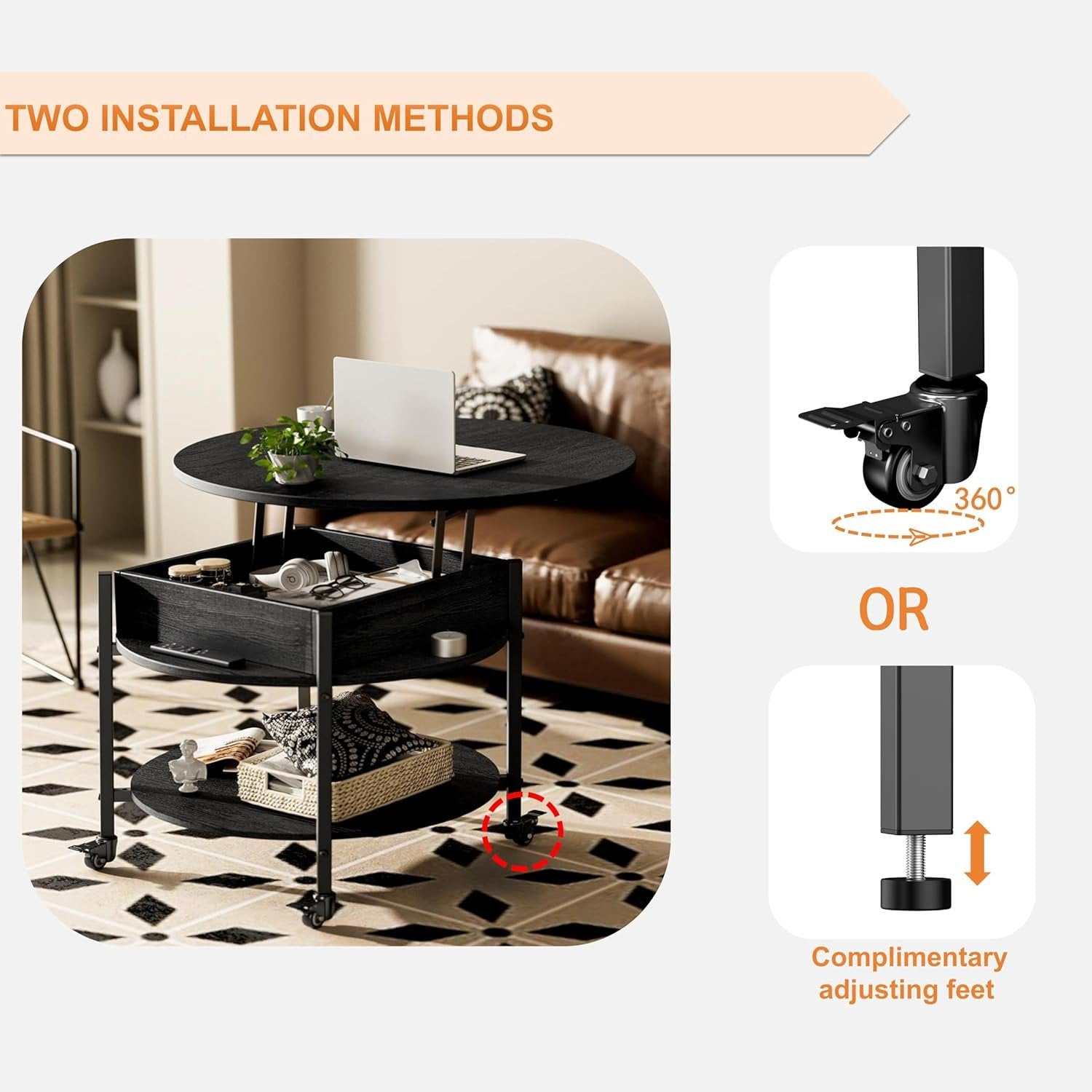 Ablefurn Mid Century Black Coffee Table, 26.77” Lift Top Coffee Table with Removeable Wheels, Hidden Compartment and Open Shelf, Wood Lift Tabletop Central Dining Table for Living Room, Home Office