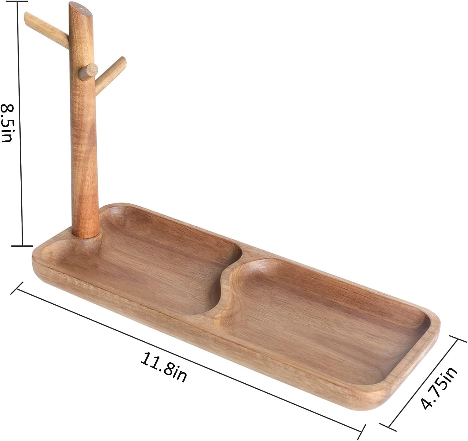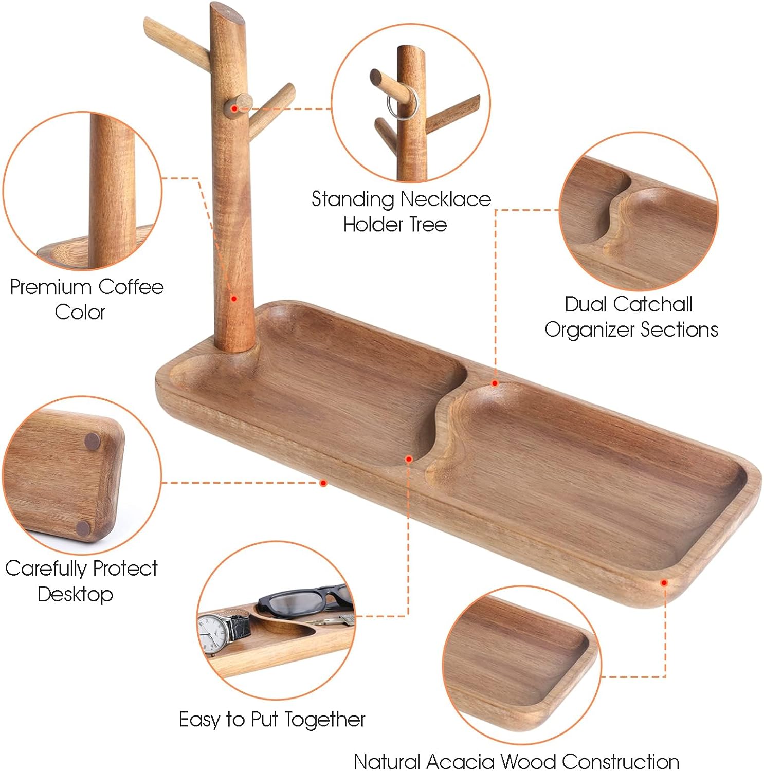 All-Purpose Jewelry and Key Organizer Tray This versatile tray is designed to organize your everyday essentials, including rings, bracelets, necklaces, keys, phones, and small trinkets. With two deep trays and three hanging organizers, it keeps all your items neatly arranged and easily accessible, making it an ideal addition to your entryway table, dresser, or vanity. Premium Acacia Wood Craftsmanship Made from high-quality, natural acacia wood, this tray features a smooth, rustic coffee finish that adds an elegant touch to any room. Its sturdy construction ensures durability, making it a long-lasting choice for your home decor. Space-Saving Compact Design Measuring 11.8" x 4.75" x 8.5", this compact key tray is designed to save space and fits perfectly on dressers, side tables, or vanities. Its sleek design complements any decor style while providing ample storage for your jewelry and accessories. Stylish and Practical Gift Idea This fashionable and trendy jewelry tray makes a perfect gift for any occasion. Whether it's for Christmas, a birthday, or an anniversary, it's a thoughtful and practical present that will be appreciated by anyone who loves to stay organized. Convenient Hanging Organizer The three hanging stands are perfect for keeping necklaces, chains, keys, and bracelets tangle-free. This versatile feature ensures your jewelry is neatly displayed and easily accessible, saving you time and hassle.