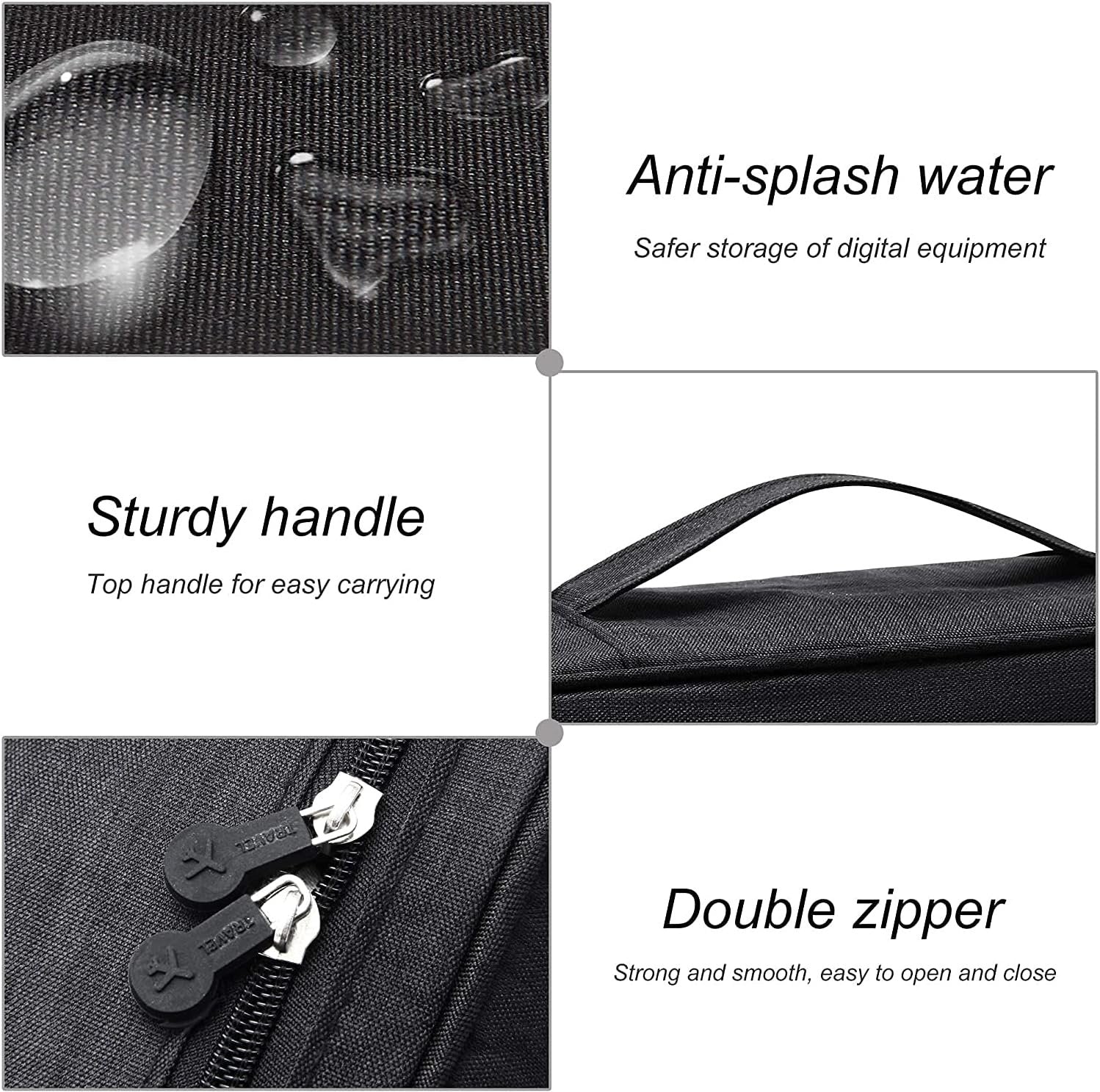ADJUSTABLE COMPARTMENTS - The bottom of our electronics organizer has three detachable thick padded dividers with velcro, you can create the bottom compartments according to the size of your accessories and tools to keep your electronic accessories clean and tidy. KEEP EVERYTHING ORGANIZED - The electronics case has multiple pockets, large enough to store your electronic accessories. Except 3 detachable dividers, there are 5 mesh pockets with elastic loops, can store your daily electronic accessories, such as cables, various chargers, headphones, electronic adapter, etc. Waterproof & Shock Resistant - The cable travel organizer bag is made of 300D waterproof cation fabric, thick padded inner material provides excellent protection for your electronic accessories from scratches, dust and accidental drops, all things inside are protected very well. PERFECT FOR TRAVEL - Size: 24*18*10cm, portable size allows you to easily put it in a backpack, shoulder bag or suitcase. In addition, the comfortable and durable handle helps to take your essentials wherever you go, it is a great organizer for office and travel use. Any problem please feel free to contact us