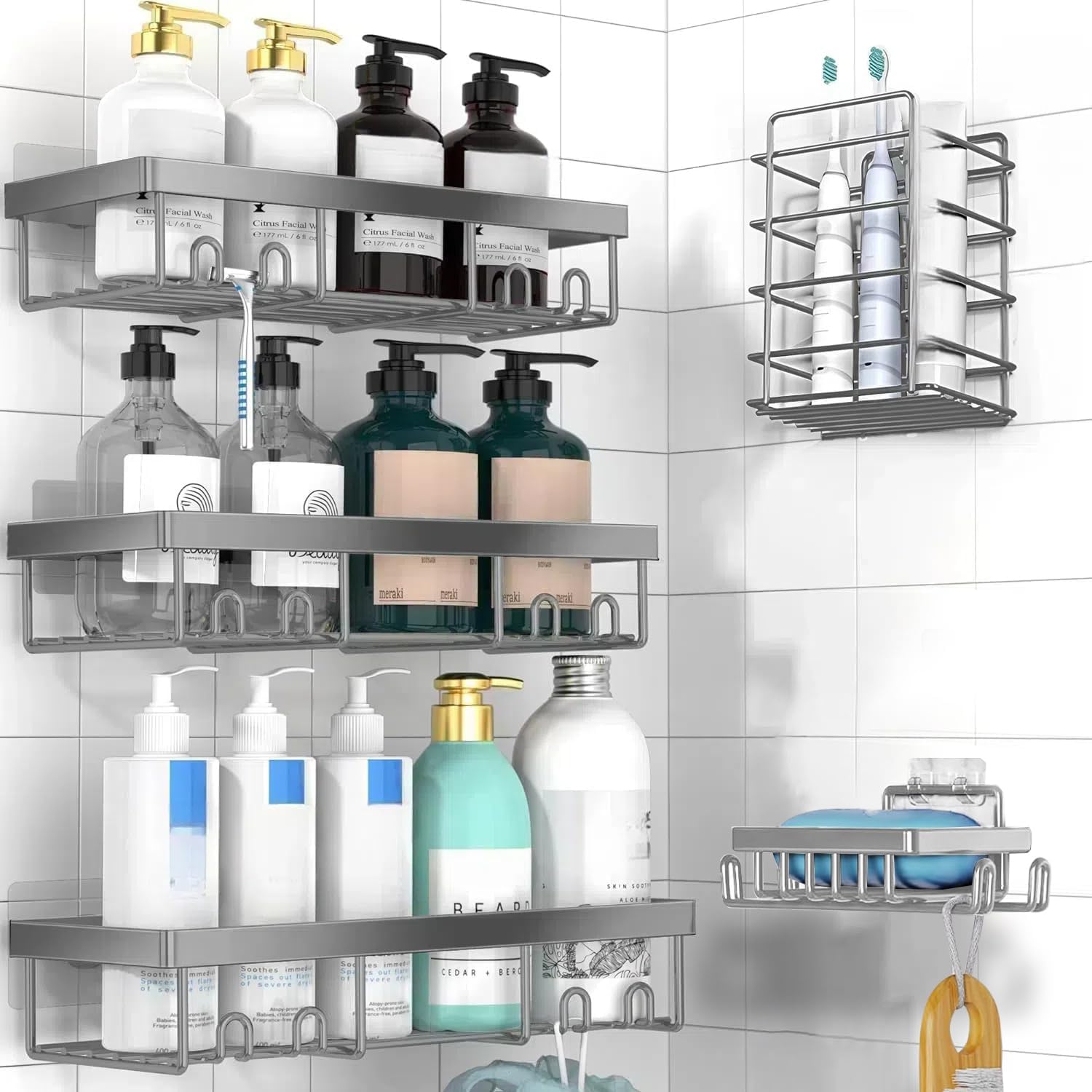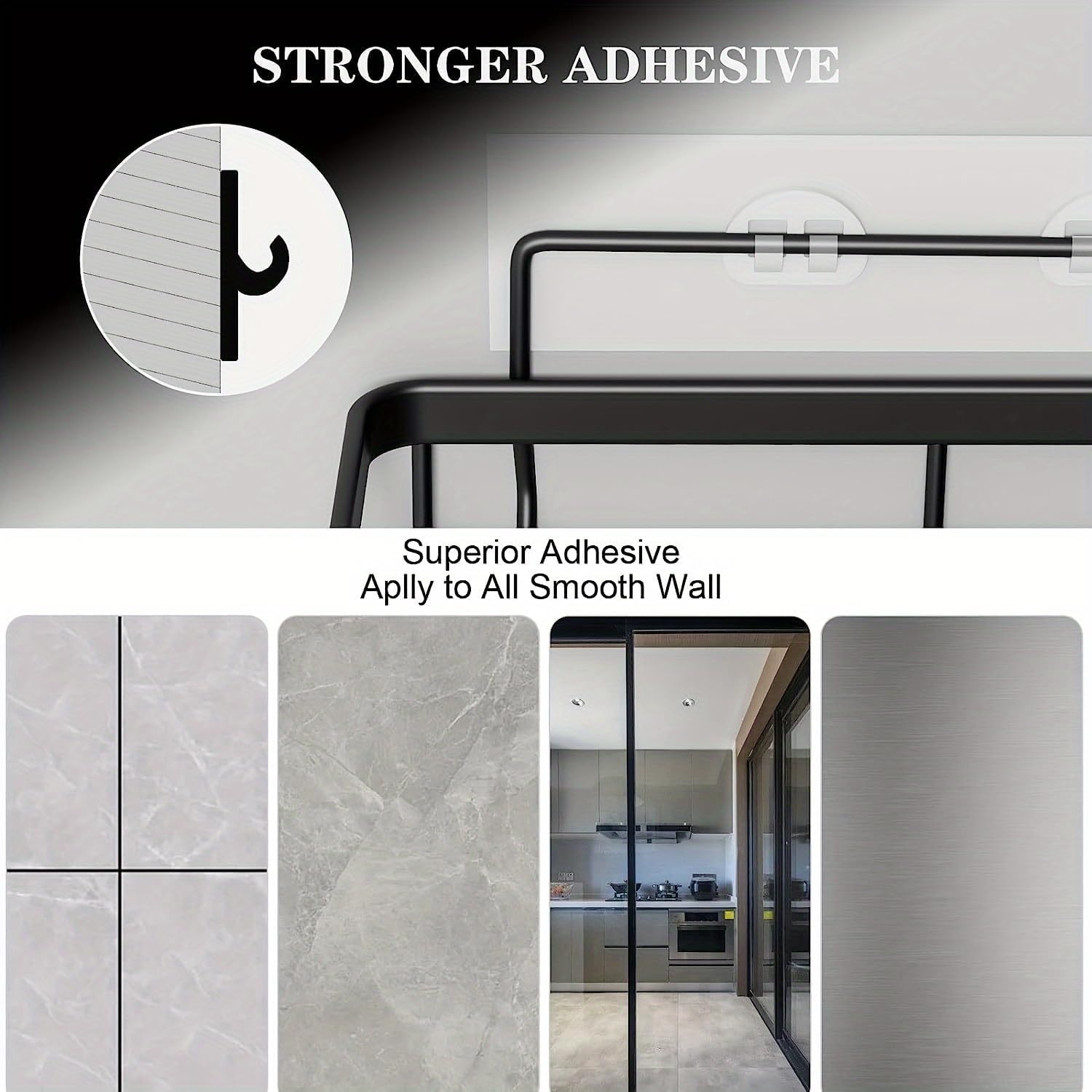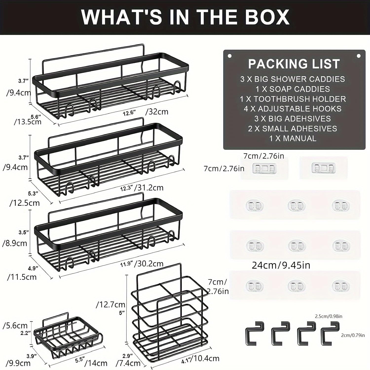 【Great Shower Organizer Set】This Hanging furniture shower caddy can help you better organize your bathroom necessities. It is suitable for bathrooms, kitchens, Rv, living rooms and bedrooms, with the soap dish to make your family space use to the extreme. The large storage capacity allows you to store more items, and the fence prevents items from falling. 【304 Stainless Steel】Our shower shelves are made of 100% stainless steel, rust-proof and sturdy. The spacer design at the bottom can help drain and dry quickly, avoiding harmful substances in humid environments. It is an ideal choice for supplementing your bathroom. 【Stronger Adhesive】The upgraded version of the transparent non-marking adhesive provides you with stronger stability. It can be installed without drilling. The load-bearing capacity can reach up to 40lb, which is twice that of other products on the market. Since it won't fall from your wall, you don't have to worry about the loss caused by the shower organizer falling after installation. 【Applicable to More Walls】You can install it on any smooth wall (Paint not included), and it works on almost any bathroom wall, so you can buy with confidence without worrying about inapplicability.