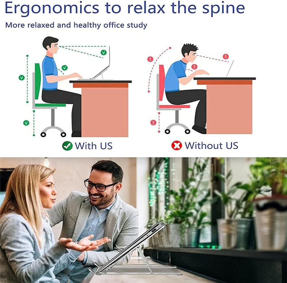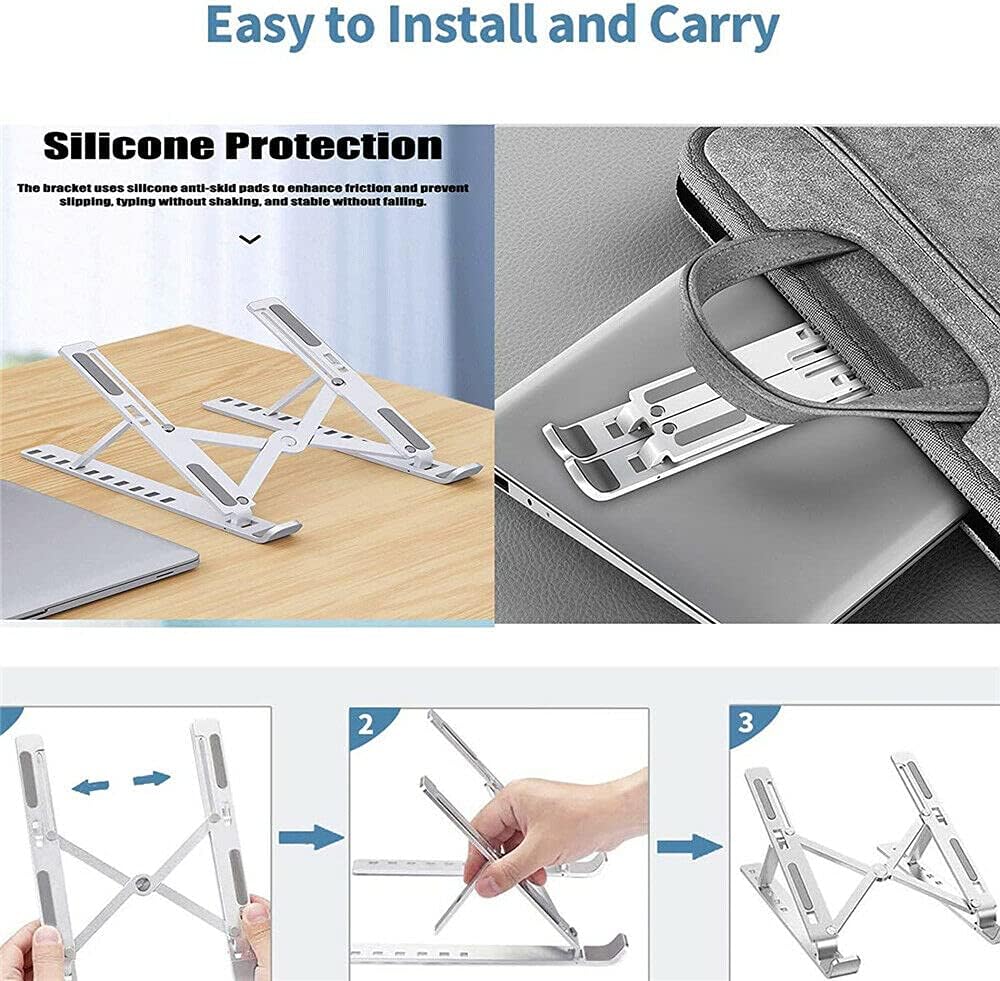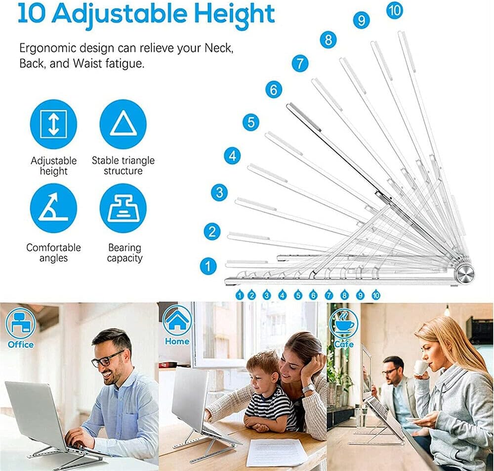【Adjustable & Ergonomic】:The laptop & tablet stand provides 10-speed adjustable height,can be freely adjusted from 2.55” to 8” for a perfect eye level,improving your body posture and prevent humpback,reduce your neck fatigue, back pain and eye strain when watching video or your kids are reading books 【Non-Slip & Sturdy】:Foldable laptop computer stand is made of ABS material combined with a triangular structure to increase stability;Typing is more stable and comfortable;with larger anti-skid silicone covers on 2 raised hooks and entire top surface,make sure your laptop is in place and protects your device from scratches and slippage,and smooth edges also make they don't hurt you 【Portable & Foldable】:Creative portable foldable design, the laptop stand can be folded to the size of 11.2” x 2.4” x 0.8”,it weighs only 0.6 lbs,the but laptop riser can hold up to 55lbs weight ,sent the portable storage bag,the adjustable portable stand holder is ideal lightweight travel design 【Wide Compatibility】:The Laptop Riser is compatible with all laptops from 10''-17'', Such as MacBook Air/ Pro, Powerbook, iPad, Dell, Sony,ASUS, LeThinkPad, Acer, Google Pixelbook, Lenovo, and other notebook and Pad models.It also fits for tablets,kindle and books 【Works As A Heat Sink】:Discharge heat easily,our notebook stand is designed with a full hollow structure,which is conducive to the ventilation and heat dissipation of the computer, so that the computer can work more efficiently for you and prolong the service life of the computer.You don't need to order another one radiator for your laptop