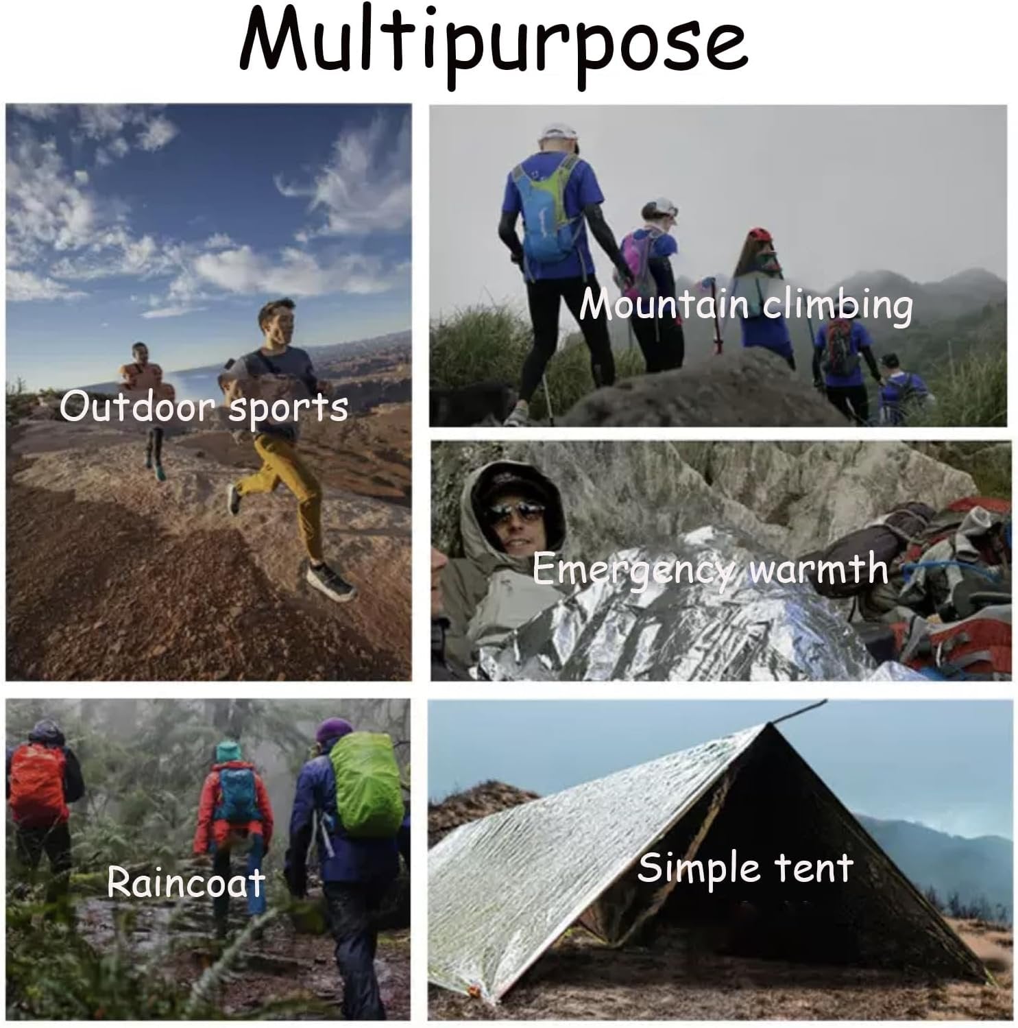 Pack of 12 - Each comes in a pack of 12. It can be used as a survival blanket for camping or to prevent shock in severe weather conditions. Cut them to size and place whatever is needed for extra warmth. Throw it in your backpack and keep one in your car for emergencies. Military-grade 12-micron aluminized polyethylene mylar, 63"x82" in size. High-quality Material - Made of the material- Mylar. This emergency blanket survival kit is UV-proof ,water-proof, wind-proof,weather-proof, and moisture-proof, with high and low temperature resistance. Reflective - This emergency life blanket will keep you dry and warm. Reflective material can make you and your belongings to be easily found at night or at other environmental extremes. And send an obvious signal to rescuers. Outdoor Essential - Waterproof and weatherproof portable emergency foil blankets are necessary for your outdoor adventure. In emergencies, mylar emergency heat blanket can provide considerable heat in extremely cold situations. Mylar thermal space blanket can build shelters and protect you and your family from many elements. Wide Used - They can be used as ponchos, emergency tents, shelters, moisture pads, lightweight tarpaulins, sheets, sleeping bags, window insulation, ropes, backpack covers, and more.