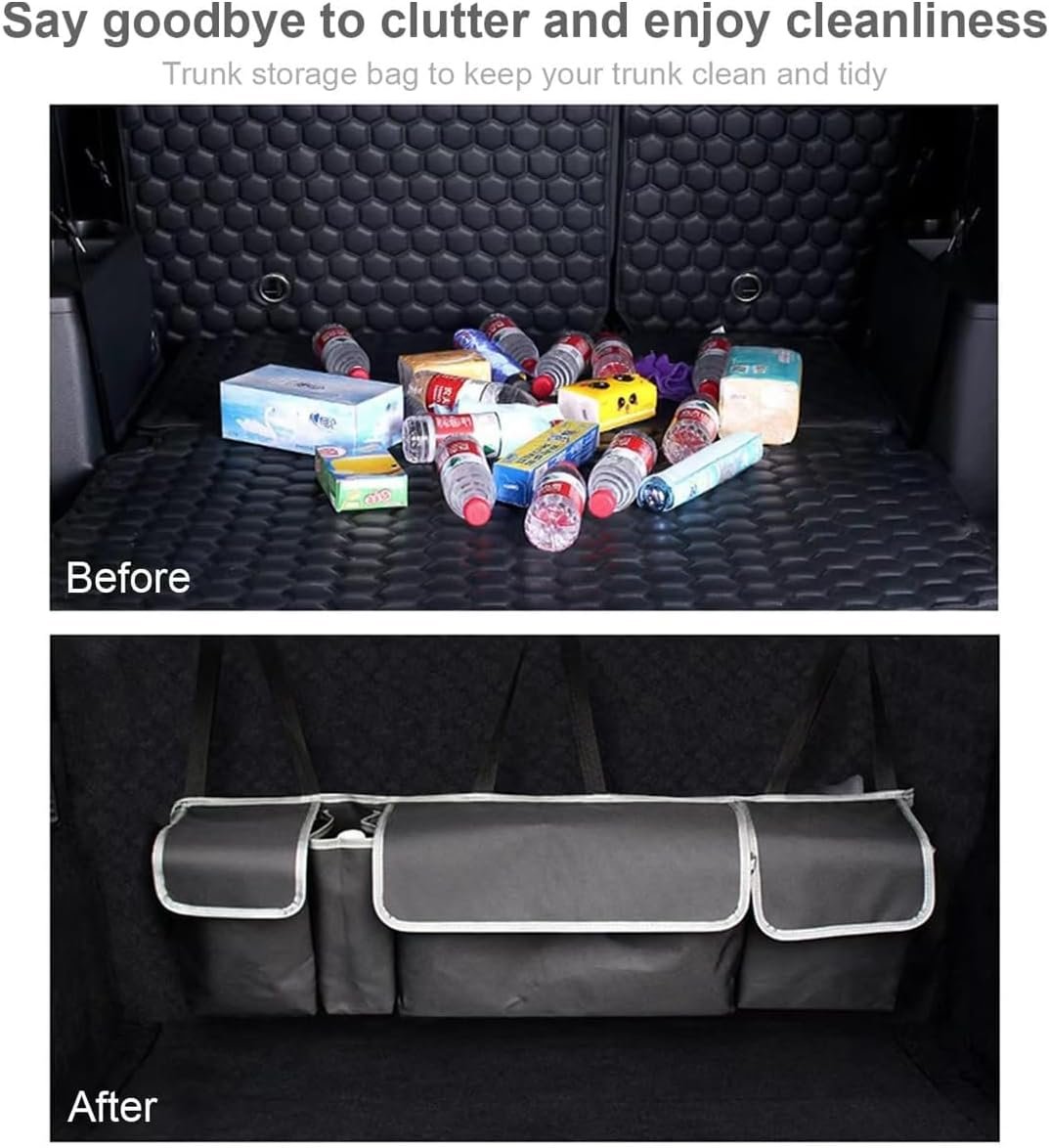 Description:Keep your vehicle organised and clutter-free with this multifunctional car trunk storage bag. Designed for efficiency and convenience, this storage solution maximises your boot space while providing neat compartments for all your essentials. Its durable materials and easy-to-install straps ensure long-lasting performance, making it an ideal choice for daily use or road trips. The modern design blends seamlessly with your car's interior while offering exceptional functionality.Features:Durable Construction: Made from premium 600D Oxford cloth and PVC materials, ensuring wear-resistance and long-lasting use.Water-Resistant Design: Protects your belongings from spills and moisture, maintaining a clean and tidy trunk.Ample Storage Space: Equipped with three large pockets for better organisation of tools, groceries, toys, and other accessories.Adjustable Straps: Features sturdy adjustable buckles and velcro for a secure fit across various car models.Foldable and Compact: Easily folds when not in use, saving space and allowing hassle-free storage.Elegant Finish: Black fabric with reinforced edges provides a sleek and professional look.Specifications:Material: 600D Oxford Cloth with PVC coatingDimensions: 90cm x 28cm x 10cm (35.4in x 11in x 3.9in)Colour: BlackPockets: Three spacious compartmentsCompatibility: Suitable for SUVs, sedans, vans, and most standard car modelsPackage Includes:1 x Car Trunk Storage Bag with Adjustable StrapsNote:Slight colour differences may occur due to lighting and display settings.Ensure the bag is securely fastened before driving to prevent shifting.This foldable storage box may have slight size variations upon first opening due to its compact packaging during shipping. Allow it to fully expand for best results. As measurements are taken manually, a 1-3cm difference may occur. Thank you for your understanding!