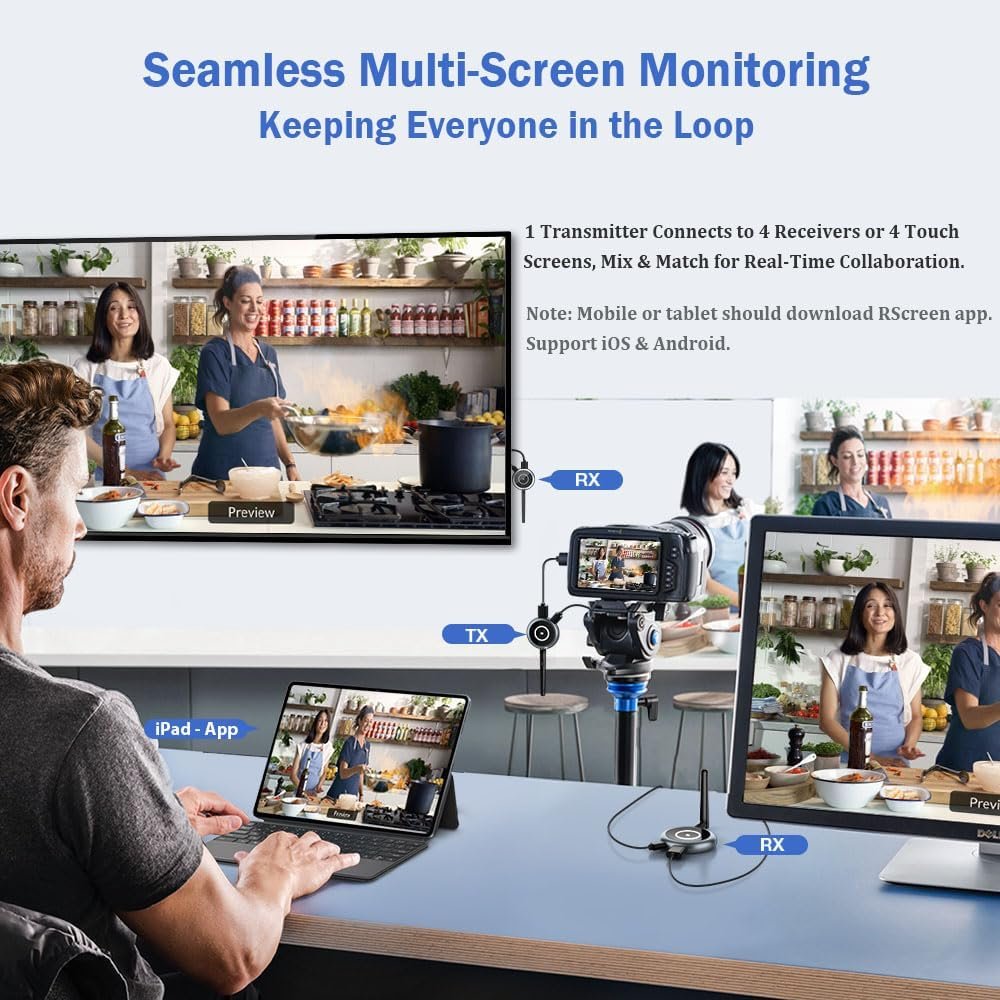 【Supports 1 Transmitter up to 4 Receivers】 This wireless HDMI extender is capable of supporting a transmitter (TX) connected to up to four receivers (RXs) simultaneously. If you require additional receivers, you have the option to purchase more RXs. Please note that the wireless transmission distance will be reduced as you increase the number of RXs. The mentioned distance refers to a line of sight without any obstructions. 【Noted: This is RX Only】 【1 x 4 RXs for Multiple Screens】 The AIMIBO wireless HDMI extender allows you to effortlessly stream high-quality video and audio to multiple displays at the same time. With a transmission range of up to 165ft/50m in an open environment, this extender is ideal for convenient setups in conference rooms, classrooms, or any setting that demands multiple displays without the need for tangled cables 【PLUG AND PLAY】 The AIMIBO HDMI wireless kit don't need Bluetooth, or Wi-Fi connectivity. During the initial setup, the new receivers need to be paired individually with the transmitter. Simply long-press the RX for approximately 3 seconds, then long-press the TX till the indicator light starts flashing. Wait for about 10 seconds for the connection to establish. It's very easy to operate. Whether you're a tech-savvy individual or a beginner, our kit can be used by anyone 【1080P@60Hz, 0.1s DELAY】With a powerful 5GHz chip and 60Hz screen refresh rate, our kit delivers an immersive 1080P viewing experience with a mere 0.1-second delay. Whether you're streaming live sports, movies, playing games, or giving presentations on big displays, our wireless HDMI transmitter and receiver allows you to enjoy it all without any interruptions, casting all your favorite apps, such as Net-flix and more 【WIDE COMPATIBLE】This HDMI wireless extender is compatible with most HDMI display devices such as HDTV, Projector, Monitor, Laptop, PC, Camera, Set-top boxes, Cable Box, Blu-ray/DVD players, Ro-ku, Satellite boxes, Gaming consoles, and more. The wireless HDMI transmitter can cast any content from laptop, PC, cable box, Xbox, PS5 to smartphone, tablet, i-Pad, i-Phone, and supports all kind of video service, like Net-flix, Dis-ney Plus, Hulu, Prime Video, HBO Max, Spoti-fy, S-ling TV and more 【STRONG & STABLE WIRELESS CONNECTION】AIMIBO 2024 Wireless HDMI is engineered with dual antennas. You can enjoy stronger and more stable signal transmission, even in areas with weak signals. The adjustable wireless channels allow you to select the optimal channel that suits your setting best. No more worries about signal interference