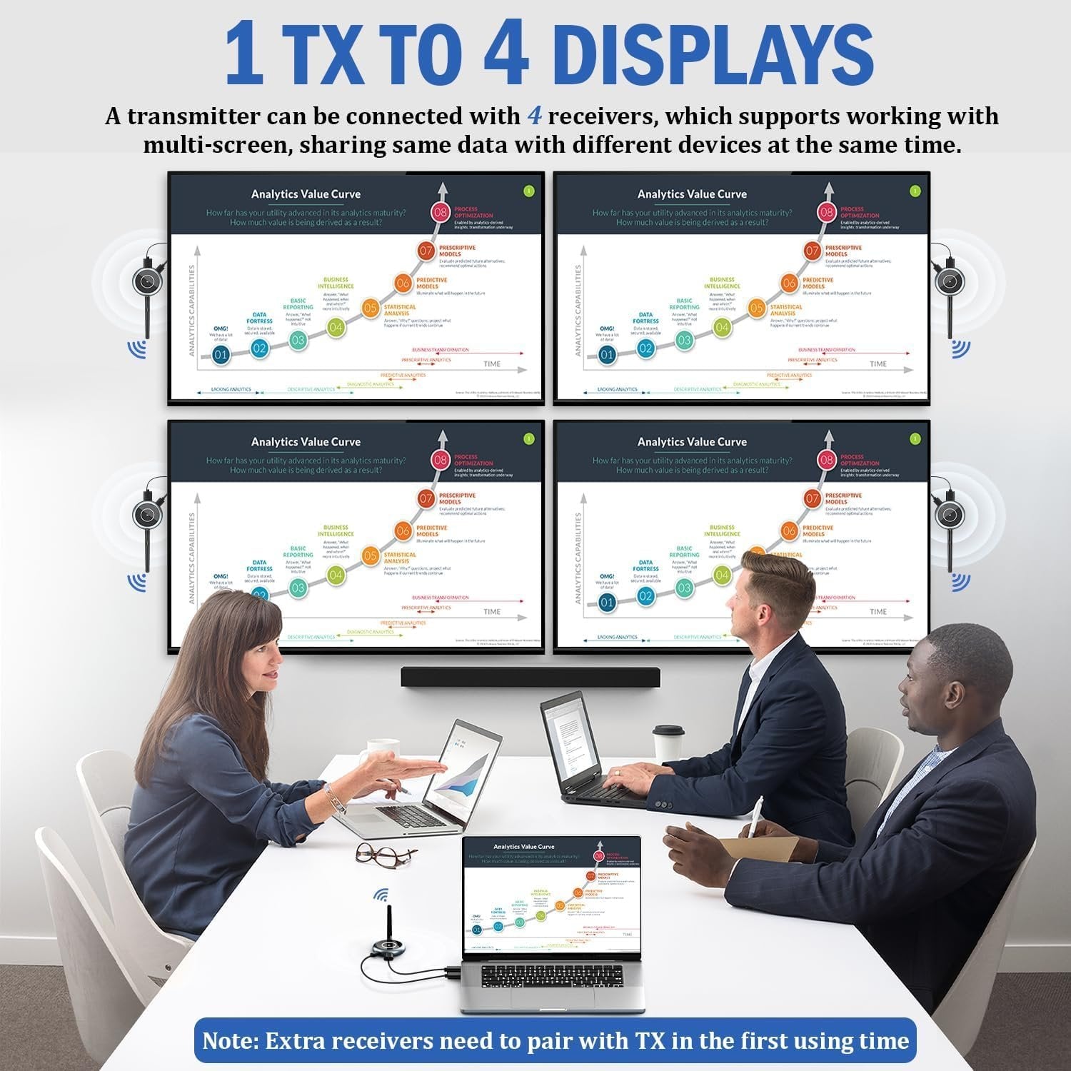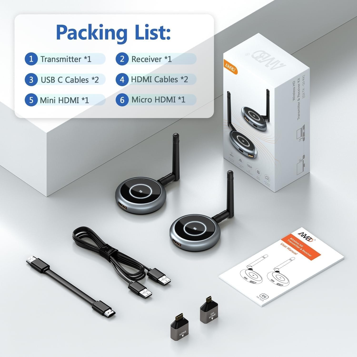 【MULTIPLE SCREENS EXTENSION】AIMIBO wireless HDMI extender supports up to 4 receivers or 4 phones/ tablets, and you can mix and match them as needed. You can easily stream smooth video & audio to multiple displays simultaneously with a transmission range up to 165ft/50m in an open environment. Perfect for home theater, bar, restaurant, multimedia classroom, conference room, church, or any other space that requires multiple screens 【TURN YOUR TOUCH SCREEN AS A MONITOR】 AIMIBO advanced HDMI transmitter can stream HDMI output device, like a laptop directly to mobile devices wirelessly, transforming your phone/tablet as a monitor by [RScreen] app. Perfect for large meeting rooms where people can't see the big screen clearly. They can view your laptop's slideshow on their i-Pad instead. Note: Operating your laptop on a phone is not supported 【5.8G@60Hz, 0.1s DELAY】With a powerful 5.8GHz chip and 60Hz screen refresh rate, our kit delivers an immersive 1080P viewing experience with a mere 0.1-second delay. Whether you're streaming live sports, movies, playing games, or giving presentations on big displays, our wireless HDMI transmitter and receiver allow you to enjoy it all without any interruptions, casting all your favorite apps, such as Net-flix and more 【PLUG AND PLAY】AIMIBO HDMI wireless kit is paired before leaving the factory, making it truly plug-and-play without the need for any settings, Bluetooth, or Wi-Fi. Even re-pairing is a breeze - simply long-press the TX & RX's function button. Whether you're a tech-savvy individual or a beginner, our kit can be used by anyone 【165FT/50M LONG RANGE TRANSMISSION】The HDMI wireless transmitter receiver allow for stable signal transmission at a distance of up to 165FT/50M by utilizing an updated wireless frequency band with multiple channels. This ensures that you won't experience signal interruptions even at long distances. 【NOTE】: When passing through walls, the transmission distance is reduced to 32FT/10m 【WIDE COMPATIBLE】This HDMI wireless extender is compatible with most HDMI display devices such as HDTV, Projector, Monitor, Laptop, PC, Camera, Set-top boxes, Cable Box, Blu-ray/DVD players, Ro-ku, Satellite boxes, Gaming consoles, and more. The wireless HDMI transmitter can cast any content from laptop, PC, cable box, Xbox, PS5 to smartphone, tablet, i-Pad, i-Phone, and supports all kind of video service, like Net-flix, Dis-ney Plus, Hulu, Prime Video, HBO Max, Spoti-fy, S-ling TV and more