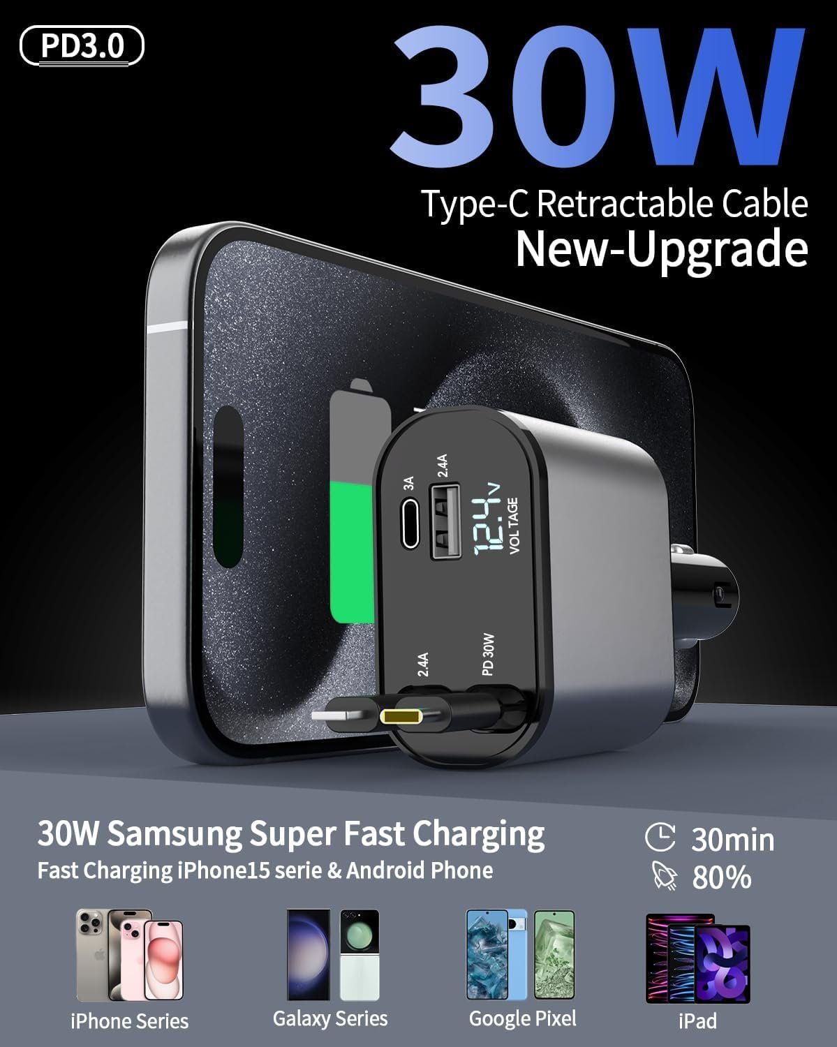 [Smart Fast Car Charger-Voltage Monitor] The usb c car charger for cigarette lighter ensures that your device is charged efficiently and constantly. iPhone/Samsung Galaxy car charger is built with overcharge,over-current, over-voltage, temperature control and short circuit protection to protect your device from overload damage. [Flexible and Retractable Car Charger Design] Retractable car charger pulls out the cable within the 80cm range, the retractable cable can be automatically retracted inside for storage.Just pull twice or at the end and the cable retracts again. Say goodbye to messy cables in the car console, keeping it clean and tidy, without tangling cables, making it easy to control and use. [Multi-Speed Charging Protocol Certification]The usb c car charger is compatible with devices that support PD, QC3.0, AFC, MTK and FCP, including phones, tablets, notebooks, Switch, etc. such as iPhone 16/15/14/13/12/11/Plus/Pro/Pro Max/mini/XS/XS Max/XR/X/8 Plus/8/7 Plus/7/6S/6,Galaxy Note 20 Ultra/ Note10 Plus/S25/S25+/S25 Ultra/S24/S23/S22/S21/S20/S10 5G/A54/S9 Plus/S8+/Z Flip 6/5/4/Z Fold 6/5/4/Note 20/10/9,Pixel 9/8/7/7a/66a and 5/6a 4XL/3XL/XXL/3A/4/4A/Nexus 6P etc. [Suitable for Various Vehicle Models] The quick car charger offers wide compatibility with various vehicle models, and the retractable car charger is applicable to traditional 12V-24V cars with a safe plug-in and will not come off even when driving on bad roads. [Buy with confidence] Package Content 1 * Car Charger.If you have any problems with your order, please contact us for quick and courteous service. We will definitely take care of customer issues and find alternatives to ensure that any issue or issue is resolved.