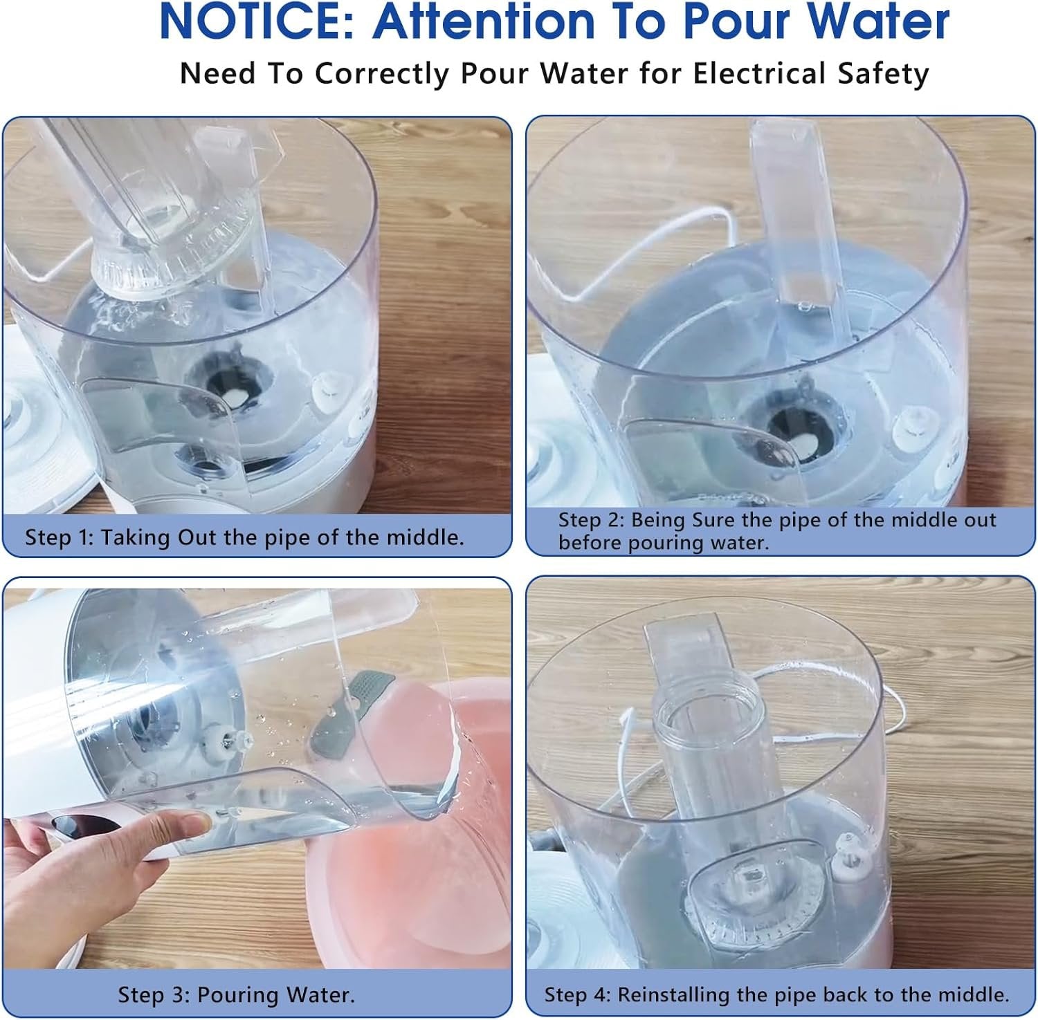 4L Water Tank Humidifier: The air humidifier provides at least 4 Liters of its capacity for up to 35 hours working time. The humidifier's mist output is 100ml/h-300ml/h in rooms up to 10-30 m²/ 107-322 ft² like for bedroom, whole house room, living room, office etc. Visible One Body Tank: The cool mist humidifier has the one body visible water tank which no leaking water issue to the base machine. There are no rare problem which cannot output mist while the water tank filled. The visible tank supports to add water above and clean easily. Rotating Button Humidify: The air humidifier has the rotating design to adjust the humidify. It can support 3 different conditions for diverse humidify situation. Low mode for night or high humidity, medium mode for neutral condition, high mode for low humidity situation. Lower Noise & Auto-Shut Off: The air humidifier can be the soothing mist quietly which is less than 35dB sound. It has the auto shut off function while no water at the tank for the safer electric use. The room humidifier is able to make ultrasonic cool mist for any single and whole rooms. Aroma Diffuser Mode & Warranty: The humidifier has the aroma diffuser input design. Just drop 1-2 essential oil and can create aroma mist. Sccaty air humidifiers provide 12 months warranty for better using experience. The package includes 1*humidifier with CA Plug, 1*User manual. Notice: Attention To Pour Water. Need to correctly pour water for safe use. Step 1: Taking Out the pipe of the middle. Step 2: Being Sure the pipe of the middle out before pouring water. Step 3: Pouring Water. Step 4: Reinstalling the pipe back to the middle.