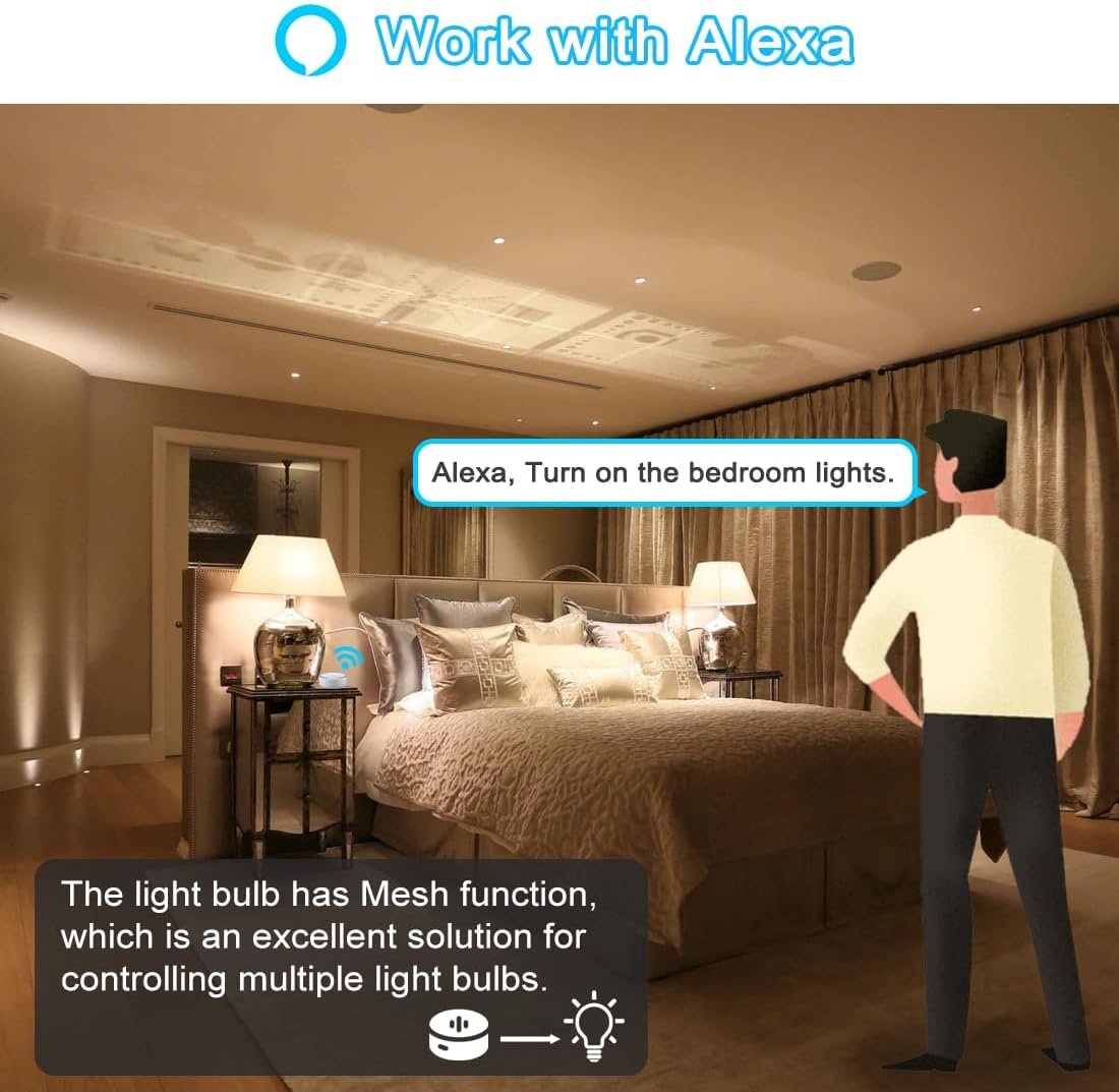【Smart Lighting】This is a Bluetooth connected Smart Light Bulbs that supports both Alexa speakers and BRmesh APP control; 12W, equivalent to 130W (1300LM); Color temperature 2700K-6000K can be adjustable; CRI > 90 ; Brightness can be adjusted from 1% to 100%. You can use BRmesh APP to set Timing function, Group control , Single control, Scene function. No registration nor network required. 【Works with Alexa and BRmesh APP】These led light bulb compatible with all Alexa speakers, easy to operate, no need WIFI, no need to connect to a router, no need for a gateway. BRmesh APP provides many features that are popular with consumers but not available on Alexa, such as color temperature fine-tuning, Scenes, and more. (Note: Uninstalling BRmesh APP after adding the lights to Alexa will not affect the use of these lights with Alexa). 【New Technology】Offers a dimming range of 1-100%, and no flickering when taking pictures under any conditions thanks to the latest "PWM to Analog" technology. Friendly to the eyes and to the photo taking lovers. 【Excellent Multi-lights Solution】Equipped with Bluetooth 5.0 chip, which enables auto interactions between the led light bulbs. This helps to overcome the shortcomings of remote control led bulbs and WIFI smart bulb in both the control distance and the numbers of led bulbs. 【Carefree Buy】 90 days money back guarantee; 24/7 professional customer service support. For any queries on the product, please do not hesitate to get in touch with us.