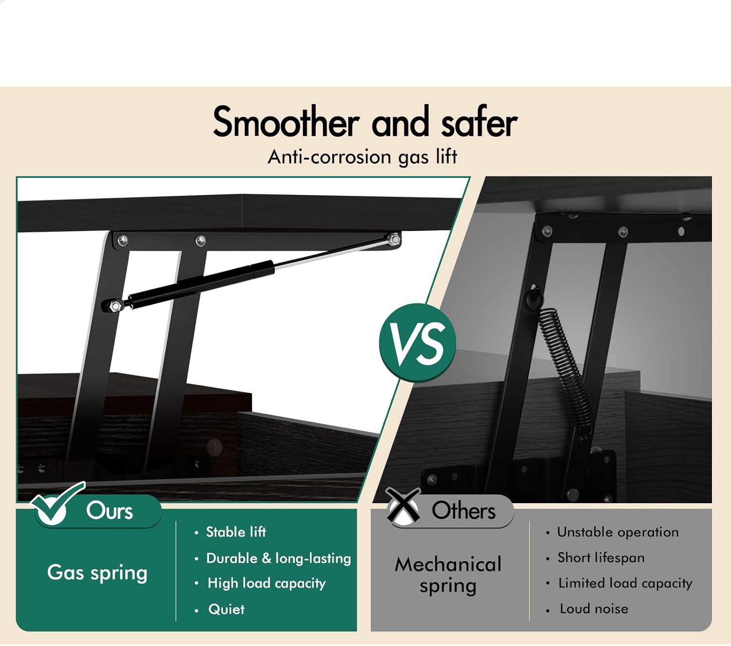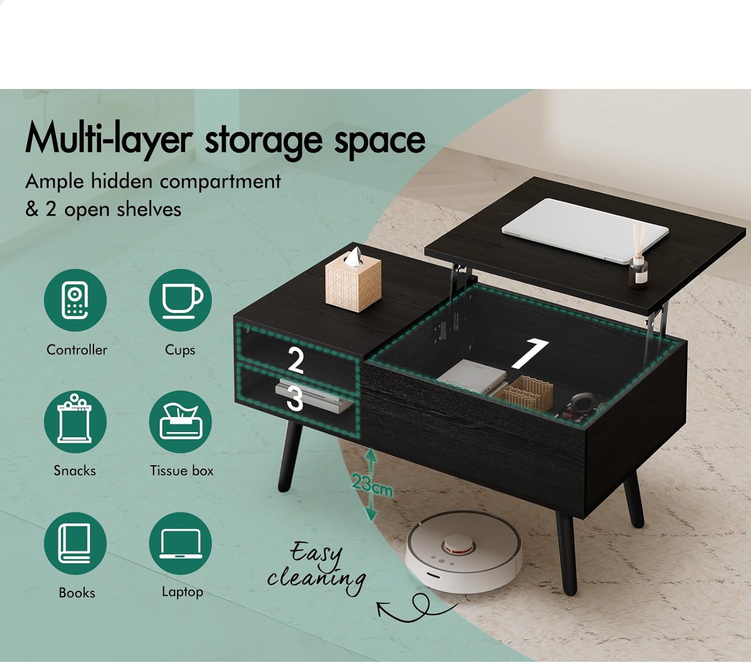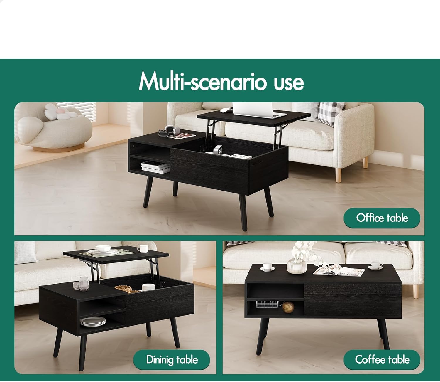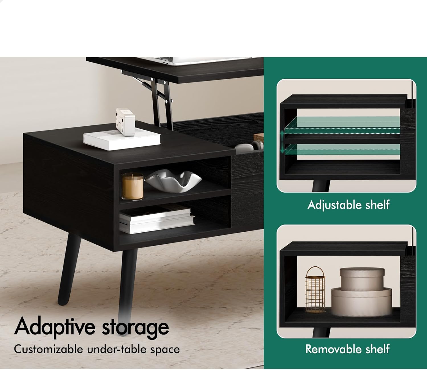 ALFORDSON Lift Tabletop Coffee Table Center Table Black Color, Living Room Office Reception Dining Table with Rising Top, Hidden Storage and Side Open Shelves