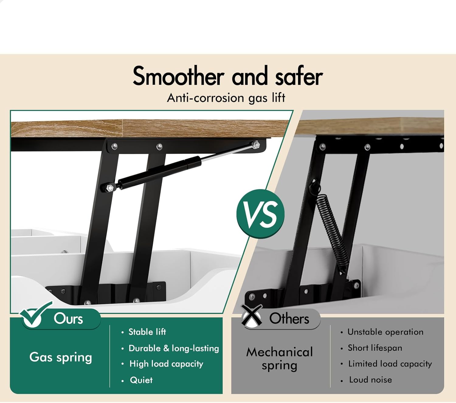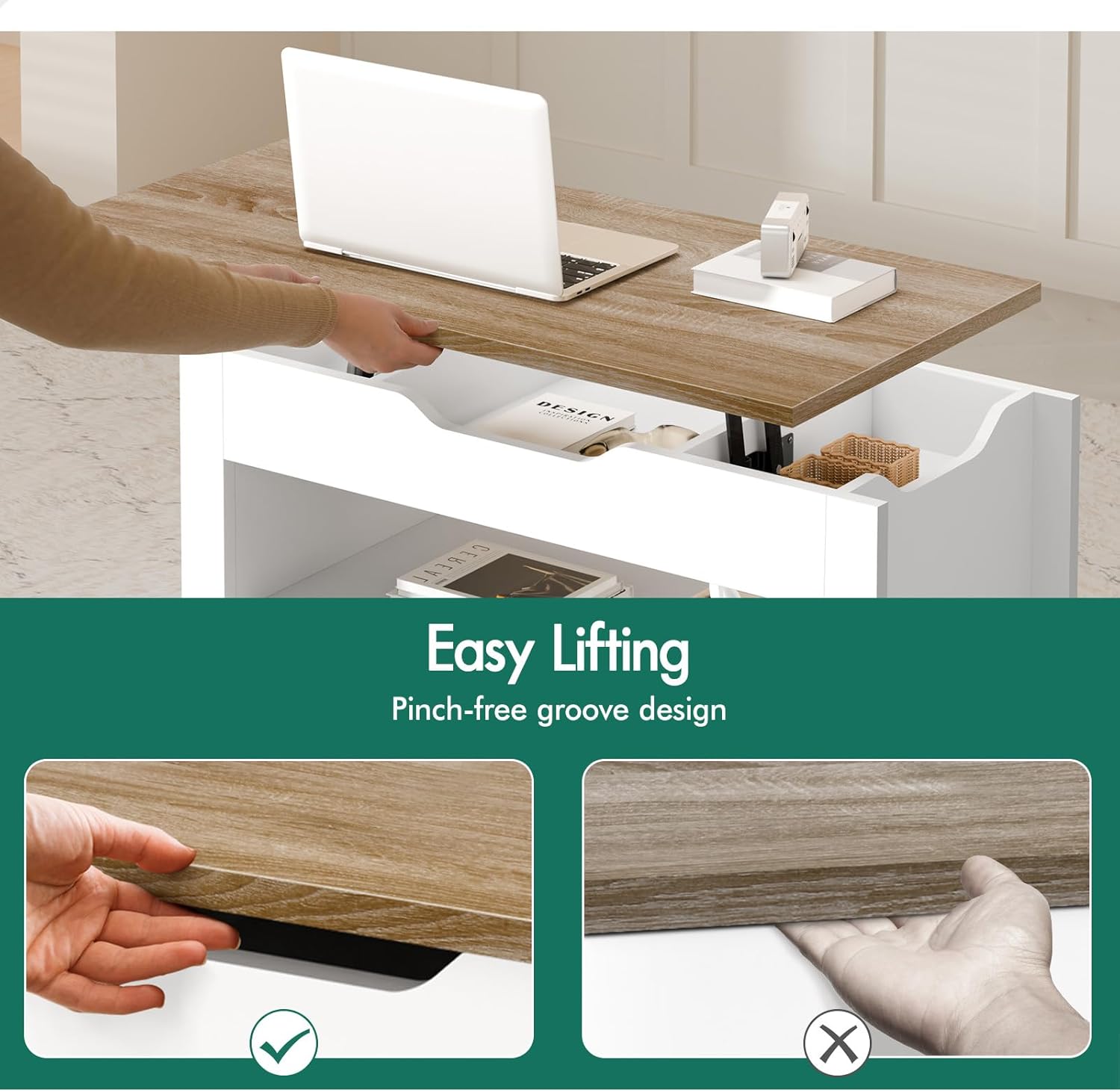 Durable Construction: Crafted from E1 grade thick particle board with an improved scratch-resistant melamine finish for a longer lifespan. Easy Assembly: This compact and space-saving coffee table comes with easy-to-follow instructions for hassle-free assembly. Innovative Design: This coffee table boasts a lift-top design, allowing easy access to the spacious hidden storage component underneath. Ample Storage: In addition to the hidden compartment, it features Spacious open shelf for convenient storage and display. Smooth Operation: The heavy-duty gas lift mechanism ensures smooth and effortless lifting of the tabletop.