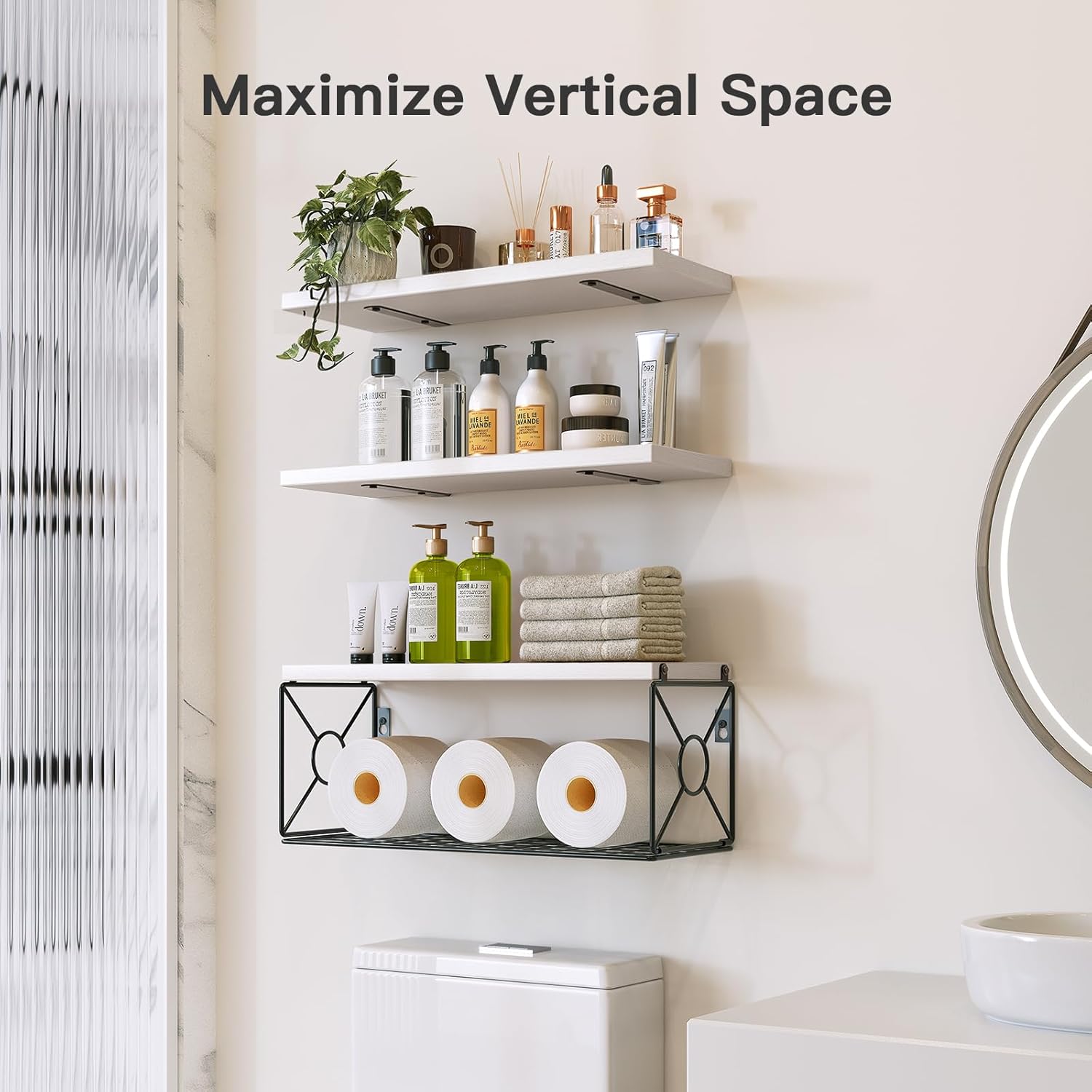 Amada Bathroom Shelves Over Toilet with Storage Basket, Floating Wall Shelves for Home Organization & Wall Decor, Bathroom/Kitchen/Living Room ShelvesWhite