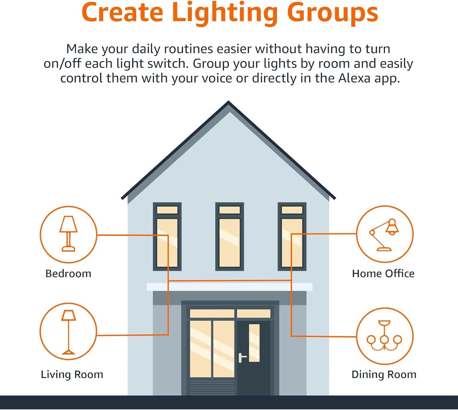 SMART UPGRADE FOR CONVENIENCE AND ENERGY EFFICIENCY : Control your Amazon Basics smart light bulbs using your voice or via the Alexa app, no more turning on/off each individual light switch. Create custom routines to schedule your lights automatically at sunset and sunrise and save energy. You can change colors of your lights for a movie night with family or friends. Works Exclusively with Alexa. Not compatible with Google Assistant, Apple HomeKit, Smart Things. SIMPLE TO SET UP WITH ALEXA: Screw in the light bulb, open the Alexa app, and get started in minutes as you get notified “ First light bulb found”. Otherwise, you can add the smart bulb directly from Alexa app. No hubs or 3rd party apps or skills required. For zero touch set up experience, check “Link device to your Amazon account to simplify setup” during checkout and get started with your smart bulb in no time. Note: Amazon Basics smart light bulbs work exclusively with Alexa to be set up with 2.4GHz Wi-Fi only. TRANSFORM YOUR SPACE WITH BRILLIANT COLORS: Create your perfect mood by choosing from 16 preset color selections and brightness levels from 5% to 100%. Have best moments during holiday festivities or gaming with friends or movie nights with family with different colors. Just say “Alexa, set the hall lights to purple”. Note: bulbs are dimmable via Alexa app or voice control only (not compatible with a physical dimmer.) CONTROL FROM ANYWHERE: Control your smart lights with Alexa app even when you are not at home e.g. from your car, office, gym. Feel secure by making your house look occupied even when you are away by creating an Alexa routine to schedule lights to turn on and off automatically. GROUP CONTROL: Create groups in the Alexa app to combine lights together, allowing you to control lights by each room, or all of your home lights with a single voice command or via app. When it's time to sleep, just say “Alexa, turn off the bedroom” OR use the Alexa app to turn off the bedroom lights at once. SUITABLE FOR EVERY ROOM: Upgrade your home by adding smart lights to every interior space, including damp locations like bathrooms.